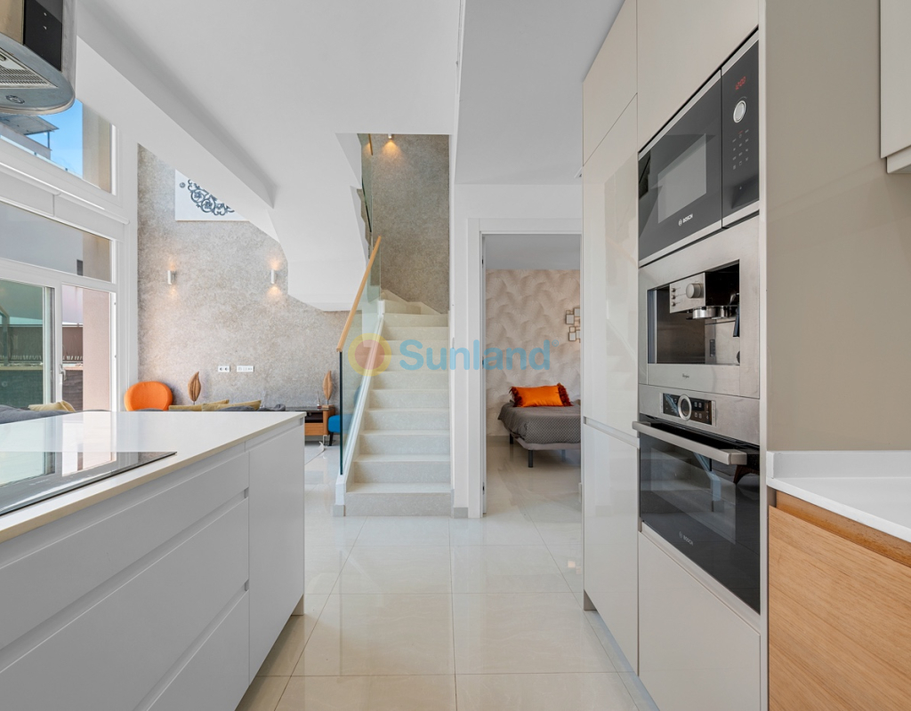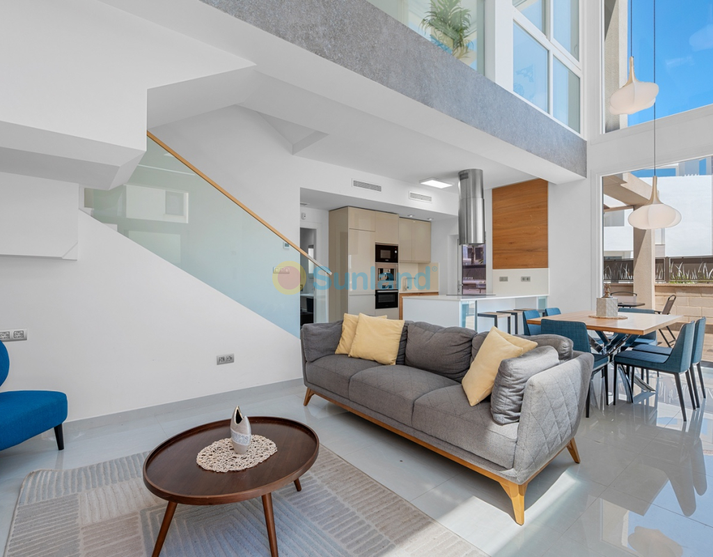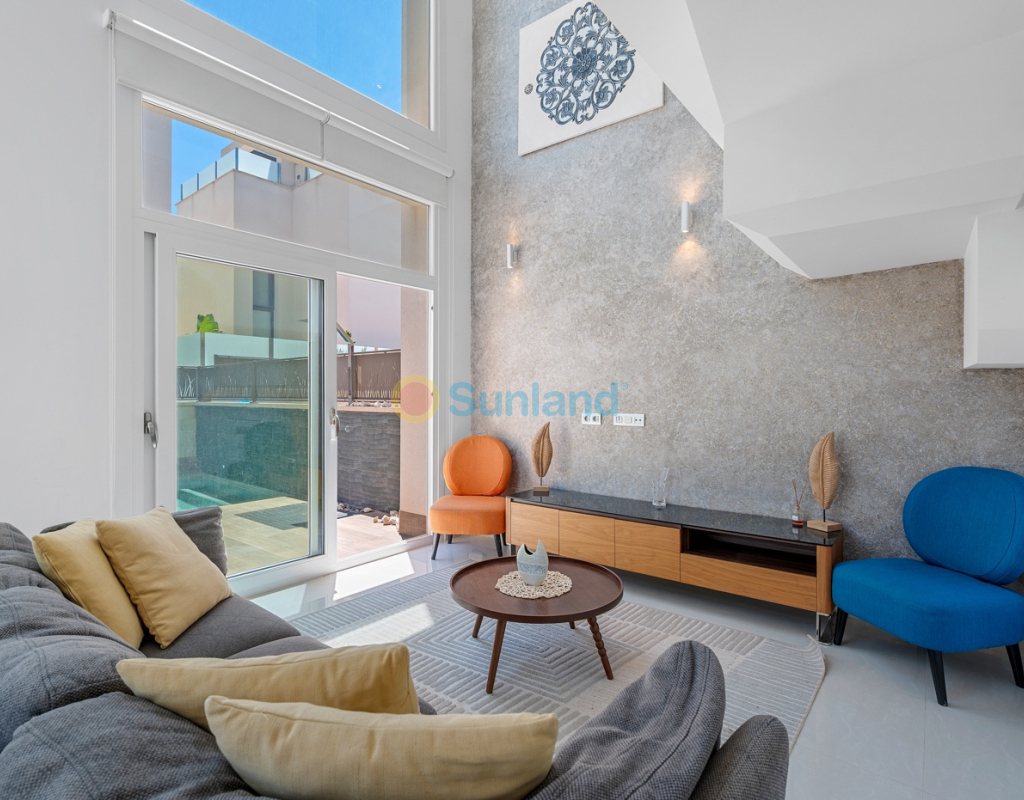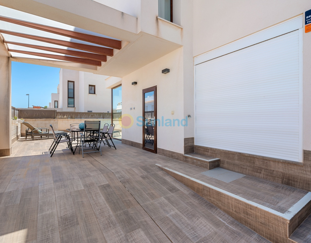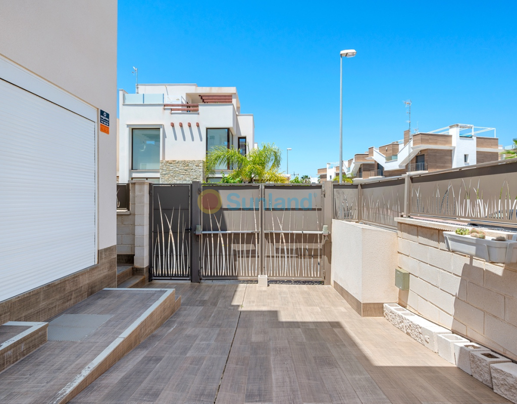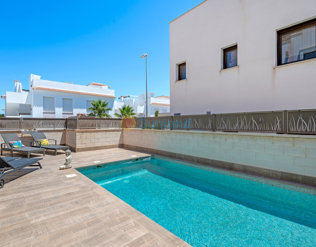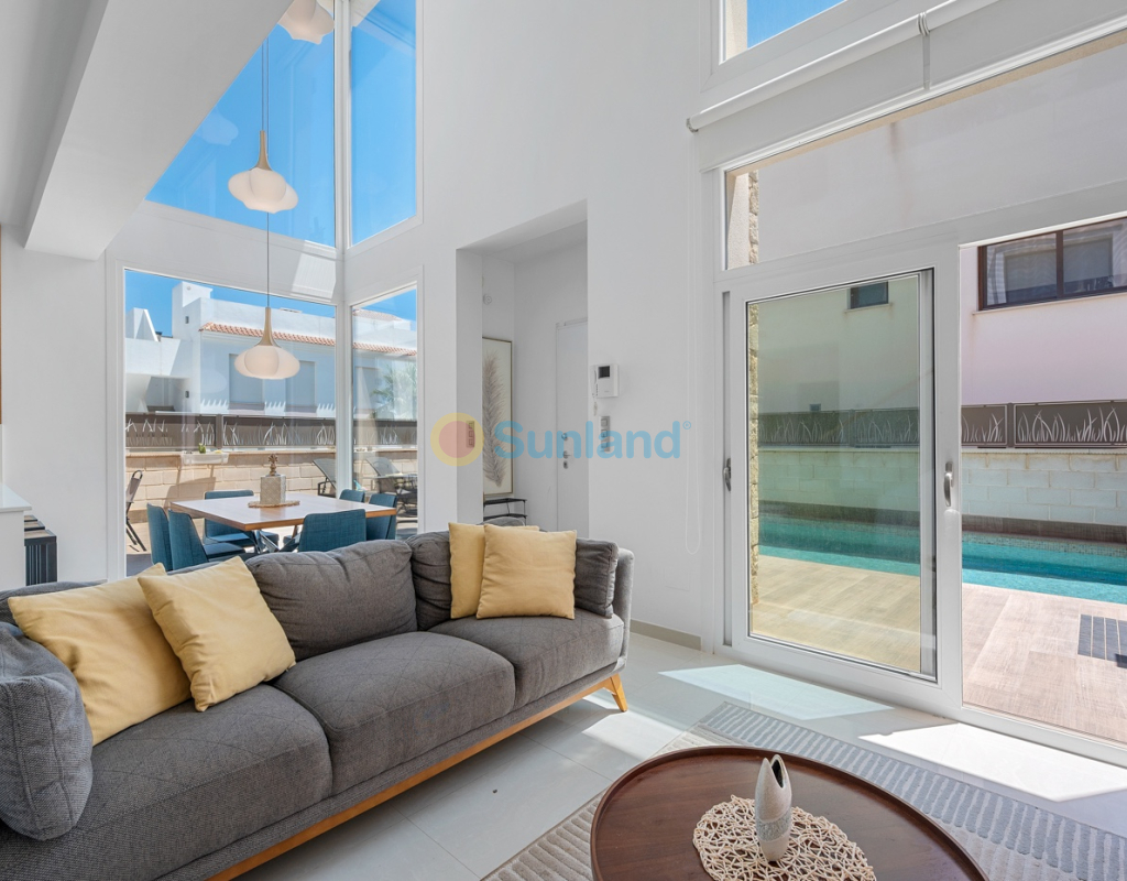 Diese im Jahr 2018 erbaute Immobilie befindet sich in einer ruhigen Wohngegend von Ciudad Quesada. Sie bietet eine funktionale Raumaufteilung sowie gut genutzte Innen- und Außenbereiche. Die Gesamtfläche beträgt 101 m² auf einem Grundstück von 184 m² mit drei Schlafzimmern, drei Bädern, einem Keller und einer Dachterrasse. Im Erdgeschoss befinden sich das Wohnzimmer, der Essbereich und eine offene Küche mit Kochinsel. Auf dieser Etage gibt es außerdem ein Schlafzimmer mit Einbauschrank, ein komplettes Badezimmer, einen Hauswirtschaftsraum sowie direkten Zugang zum Garten und zum privaten Pool. Im Obergeschoss befinden sich zwei weitere Schlafzimmer. Das Hauptschlafzimmer verfügt über ein eigenes Bad und Zugang zu einer privaten Terrasse. Das zweite Schlafzimmer liegt neben einem weiteren Badezimmer. Ein Flur verbindet die Räume. Der Keller ist derzeit als Freizeitraum mit Billardbereich eingerichtet und bietet zusätzlichen Raum für verschiedene Nutzungen. Die private Dachterrasse verfügt über eine voll ausgestattete Außenküche mit Zugang vom Inneren des Hauses – ideal, um das ganze Jahr über draußen zu genießen. Im Außenbereich bietet die Immobilie einen privaten Pool (3,30 x 6,50 Meter), einen Garten mit Kunstrasen sowie einen Stellplatz auf dem Grundstück. Als Eckhaus profitiert das Haus von mehr Tageslicht und zusätzlicher Privatsphäre. Die Immobilie wird komplett möbliert verkauft und ist mit Klimaanlage, Einbauschränken, elektrischen Rollläden, Insektenschutzgittern, Alarmsystem und ausgestatteter Küche versehen. Sie eignet sich sowohl als Dauerwohnsitz als auch als Ferienimmobilie.