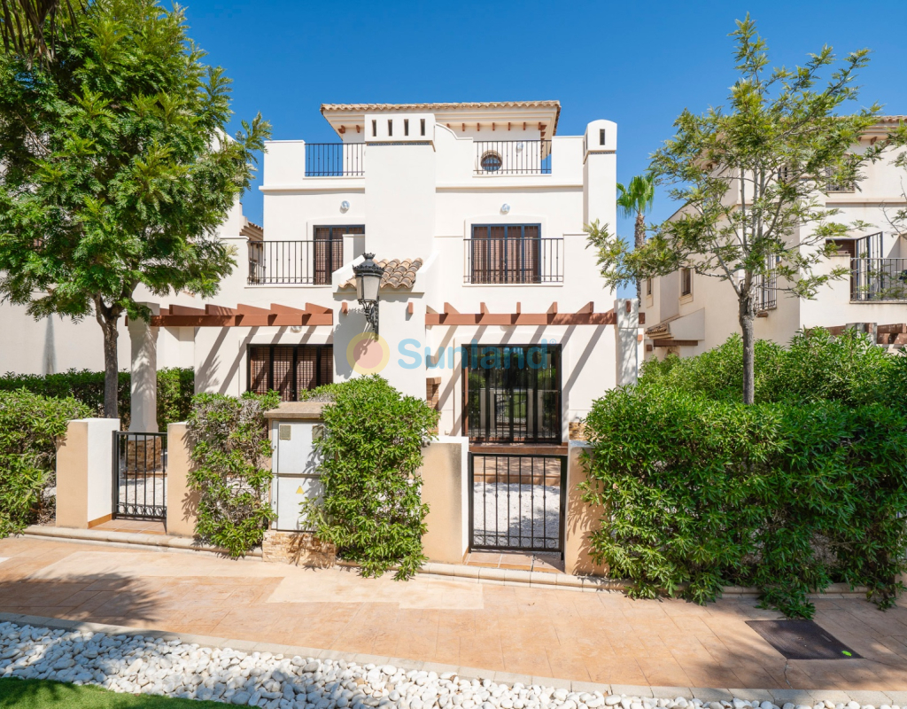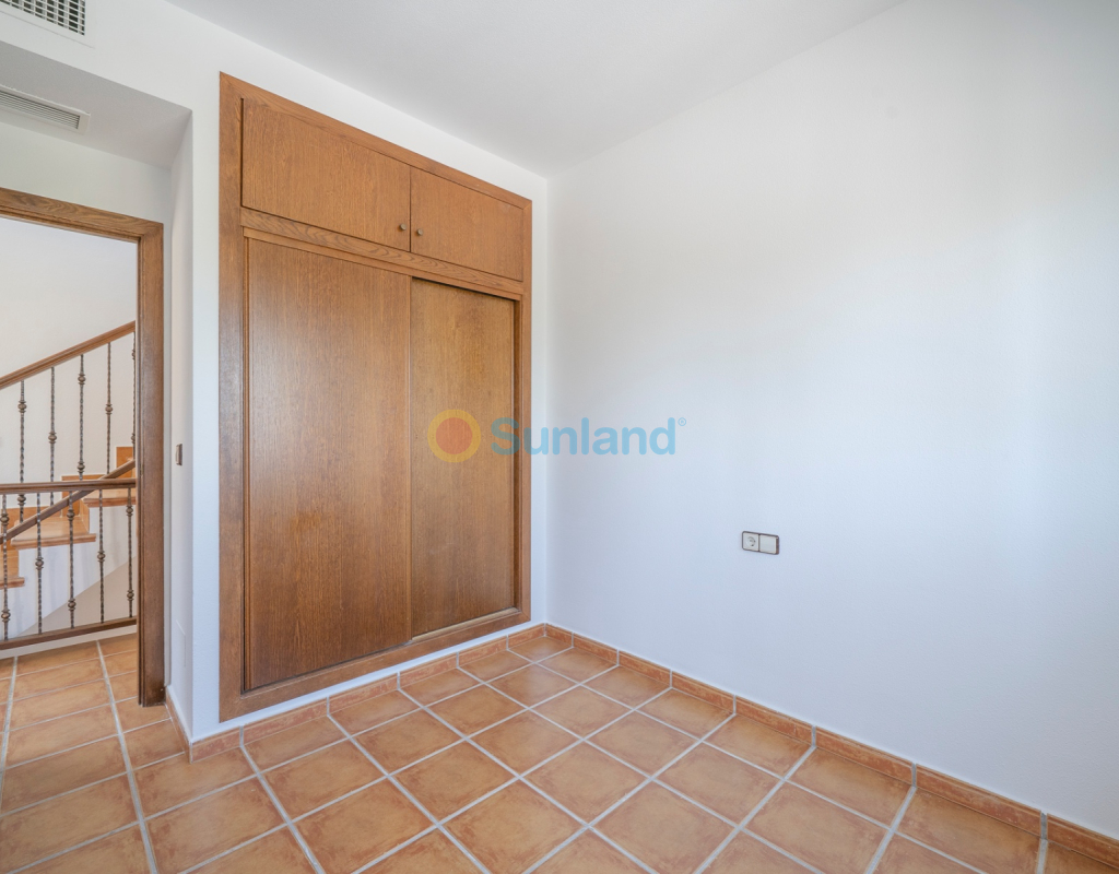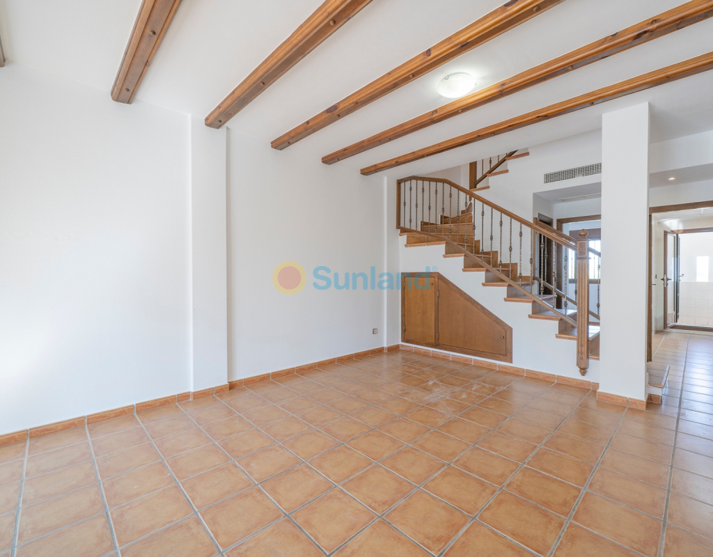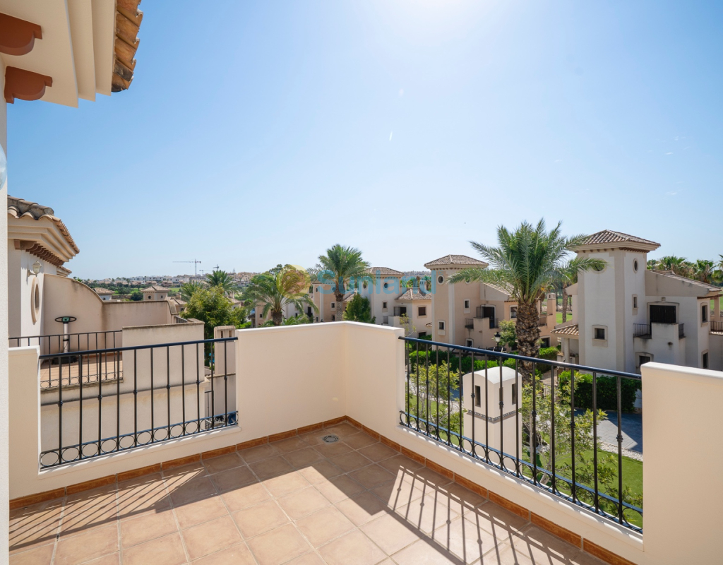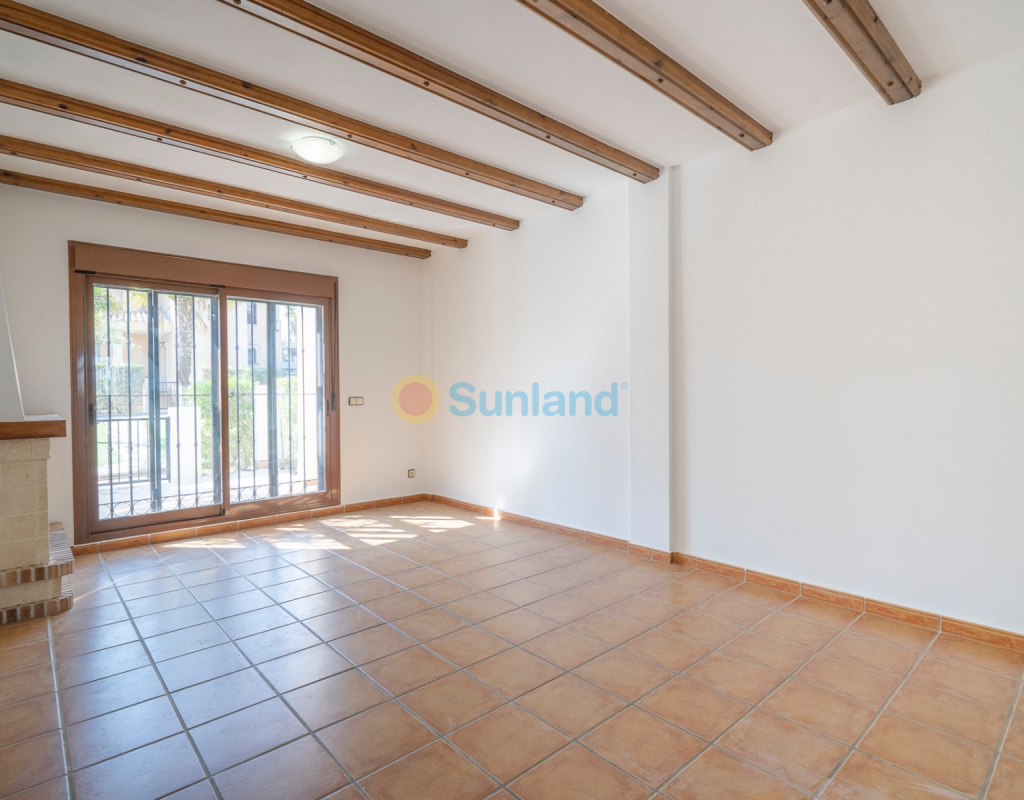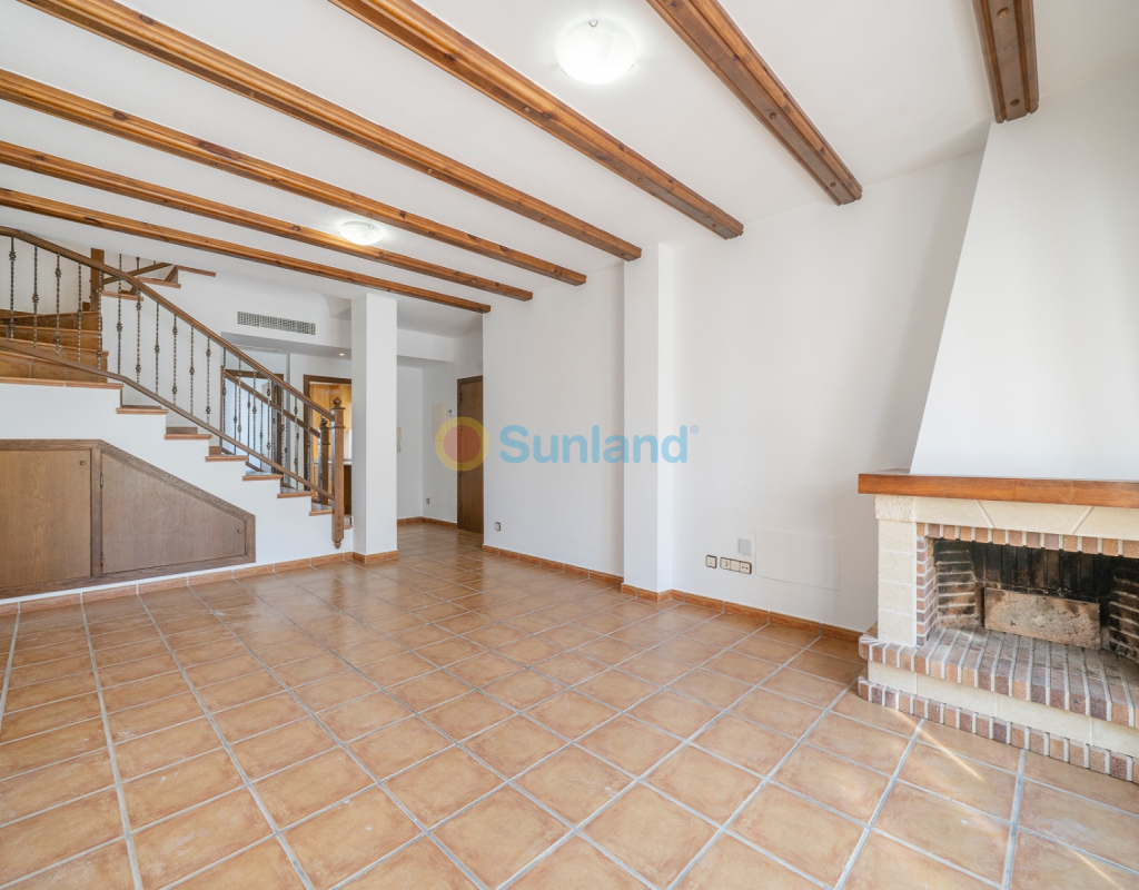 Reihenhaus im Wohnkomplex "Paradise Golf" Dieses charmante Reihenhaus befindet sich in der exklusiven Wohnanlage "Paradise Golf" und ist bezugsfertig. Es verfügt über einen Vorgarten mit Parkplatz sowie eine gemütliche hintere Veranda mit Grill, die direkten Zugang zum Wohnzimmer bietet. Im Erdgeschoss befinden sich ein großzügiges Wohnzimmer mit Kamin, eine separate Küche mit Hauswirtschaftsraum, ein Schlafzimmer mit Einbauschrank und ein Badezimmer mit Dusche. Im ersten Obergeschoss gibt es zwei helle Schlafzimmer mit Einbauschränken – eines mit Balkon und das andere mit einer schönen privaten Terrasse – sowie ein voll ausgestattetes Badezimmer. Im obersten Stockwerk befindet sich eine sonnige Dachterrasse mit freiem Ausblick, ideal zum Entspannen oder Sonnenbaden. Die Wohnanlage verfügt über einen Gemeinschaftspool. Das Haus wurde kürzlich gestrichen und befindet sich in hervorragendem Zustand. Wird unmöbliert verkauft.