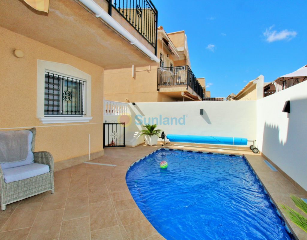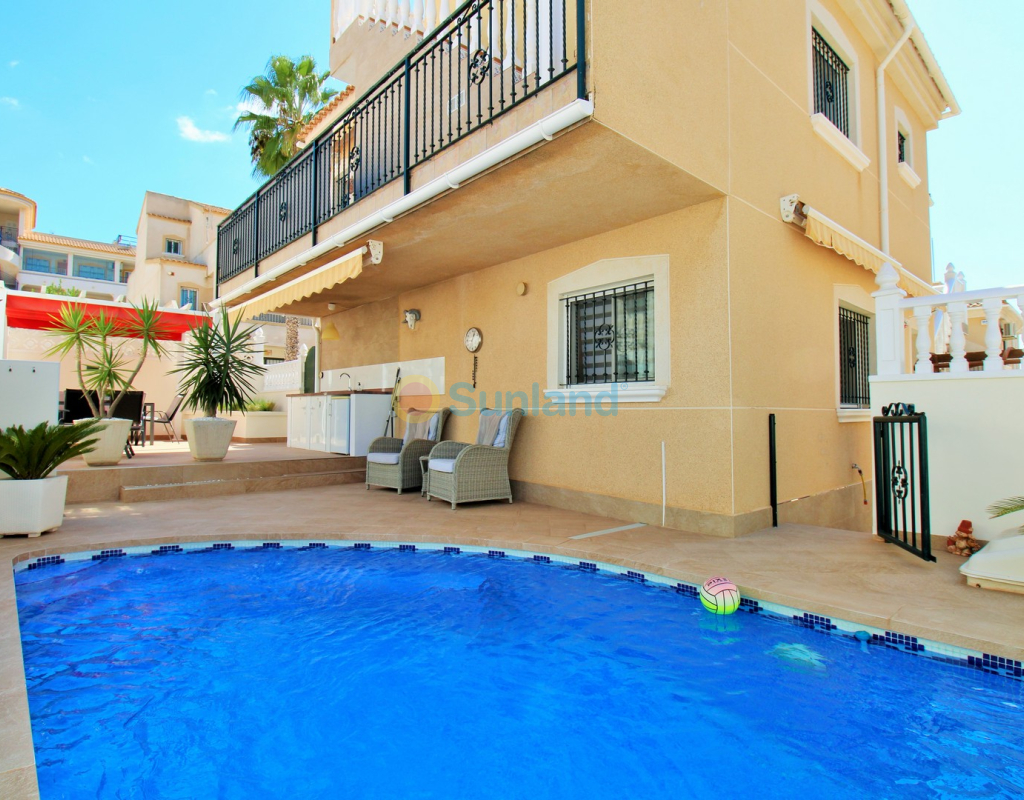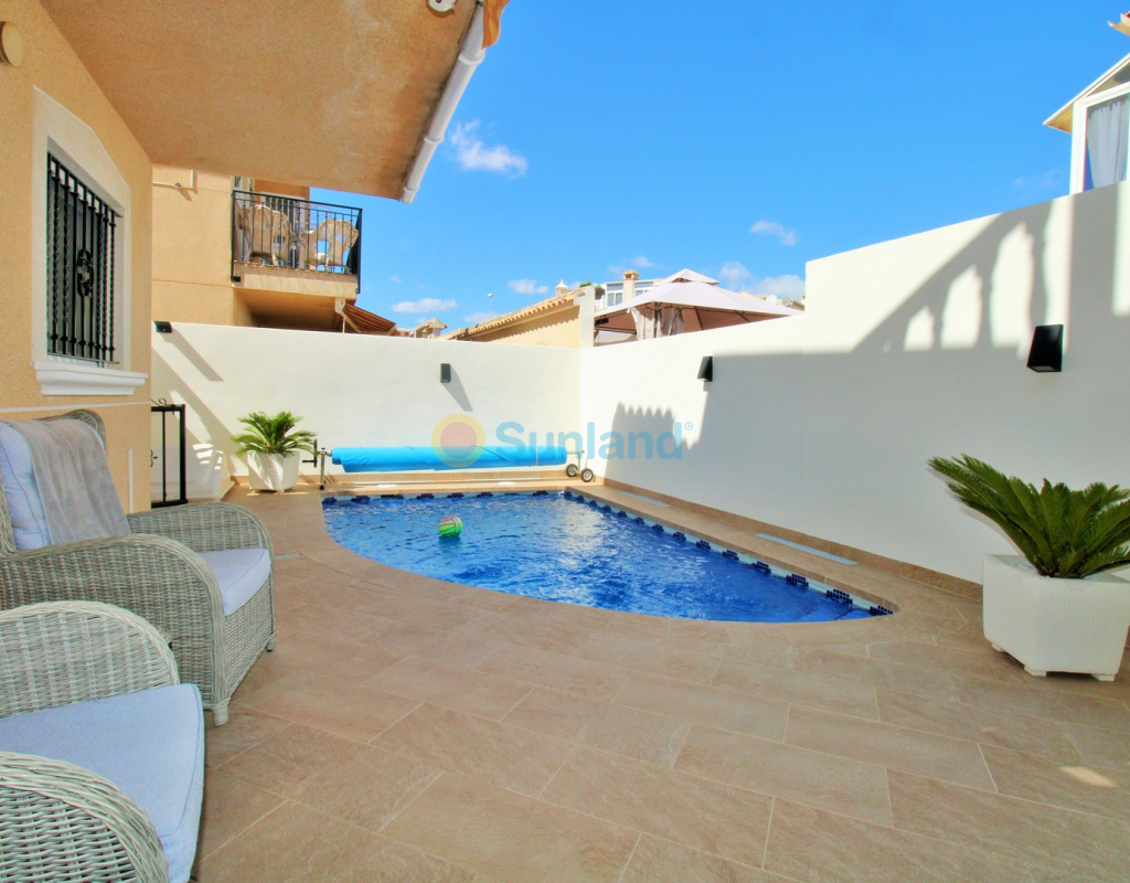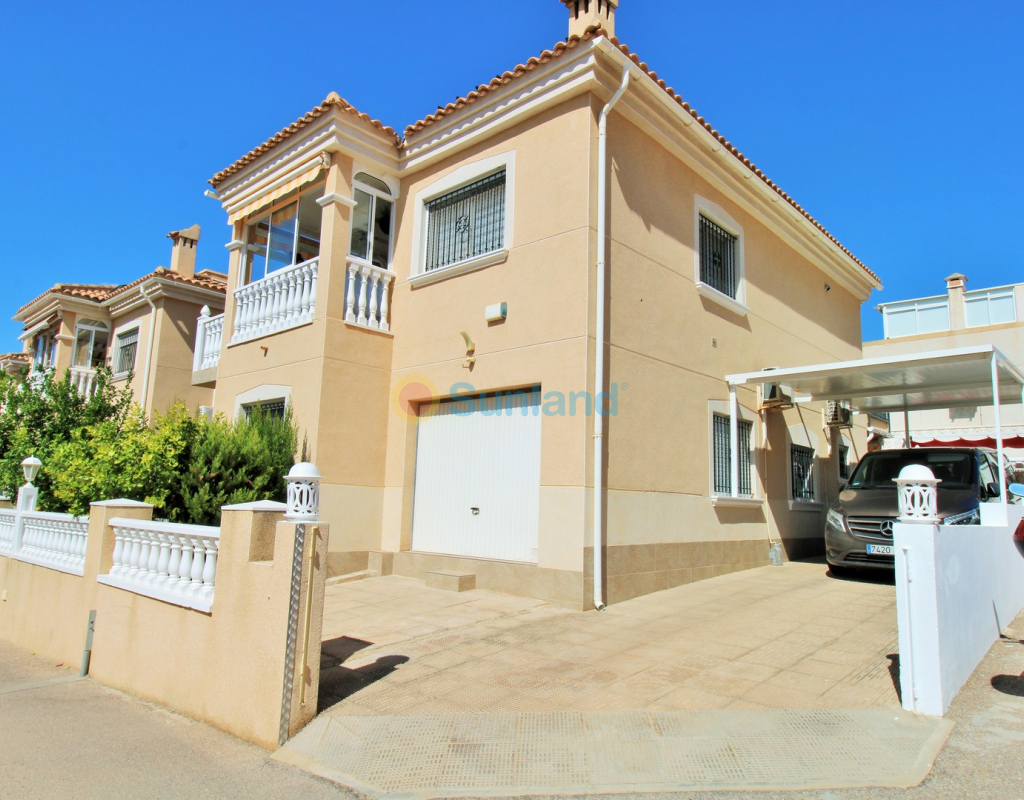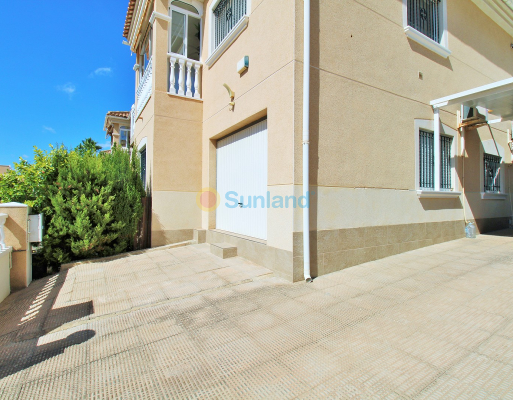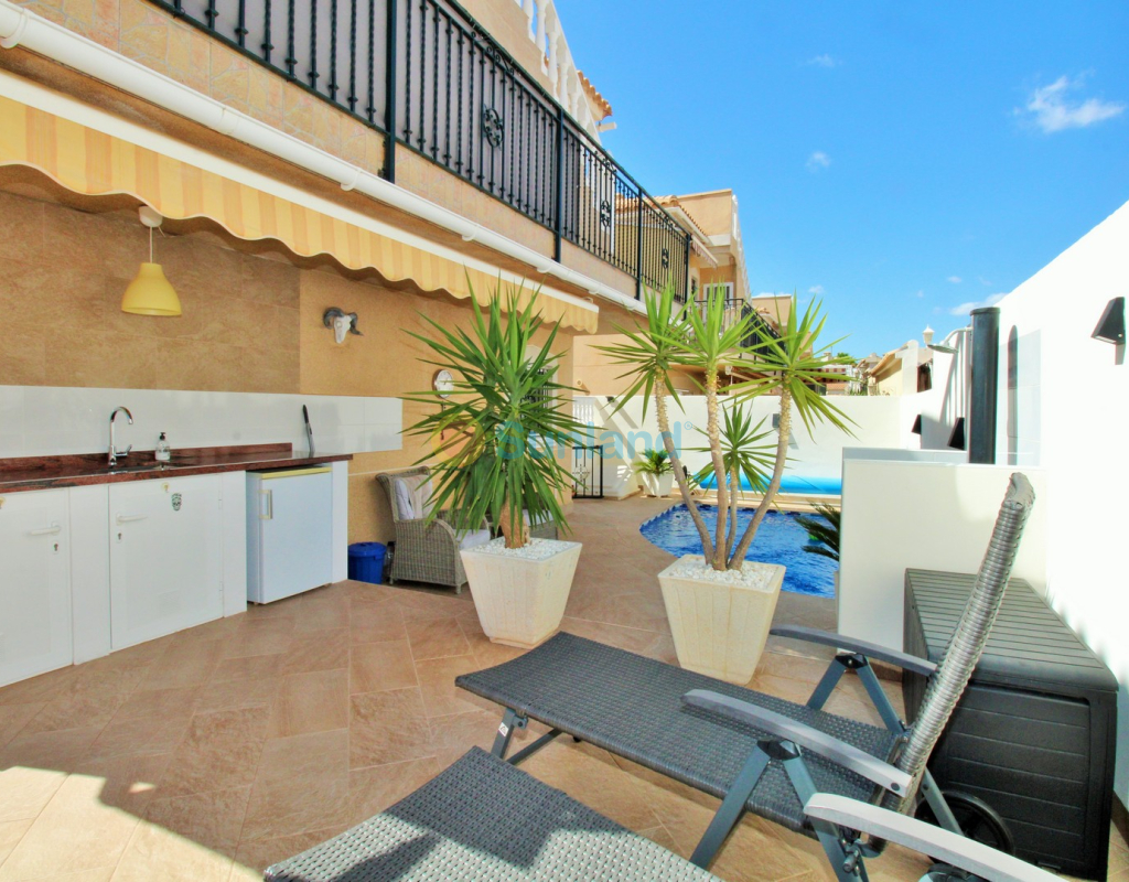 Villa Tialta ist eine gepflegte freistehende Villa in der beliebten Wohnanlage Montegolf in Villamartin. Sie bietet großzügigen Wohnraum auf zwei unabhängigen Ebenen – ideal für Familien oder als Mietinvestition. Das Hauptgeschoss umfasst ein helles Wohn- und Esszimmer, eine voll ausgestattete Küche, zwei Schlafzimmer und zwei moderne Bäder. Vom Wohnzimmer Zugang zur privaten Terrasse mit Pergola und zur verglasten Veranda.Das Untergeschoss verfügt über ein separates Gästeapartment mit Wohnzimmer, Küche, zwei Schlafzimmern und großem Bad, mit direktem Zugang zum Garten.Der Außenbereich bietet einen privaten Pool, Sommerküche, Sitzbereich, Garage und Stellplätze.Teilweise möbliert, mit Klimaanlage, Deckenventilatoren und Vorbereitung für Zentralheizung und Solarpaneele.In Gehweite zum Villamartin Plaza, nah an Golfplätzen und Stränden der Orihuela Costa.