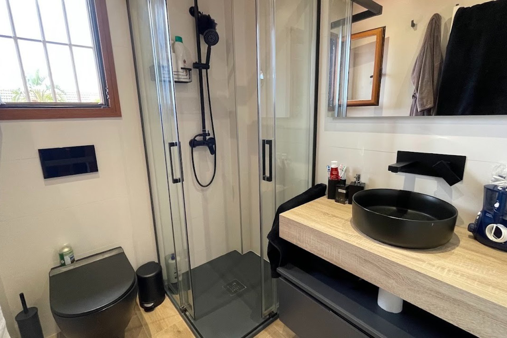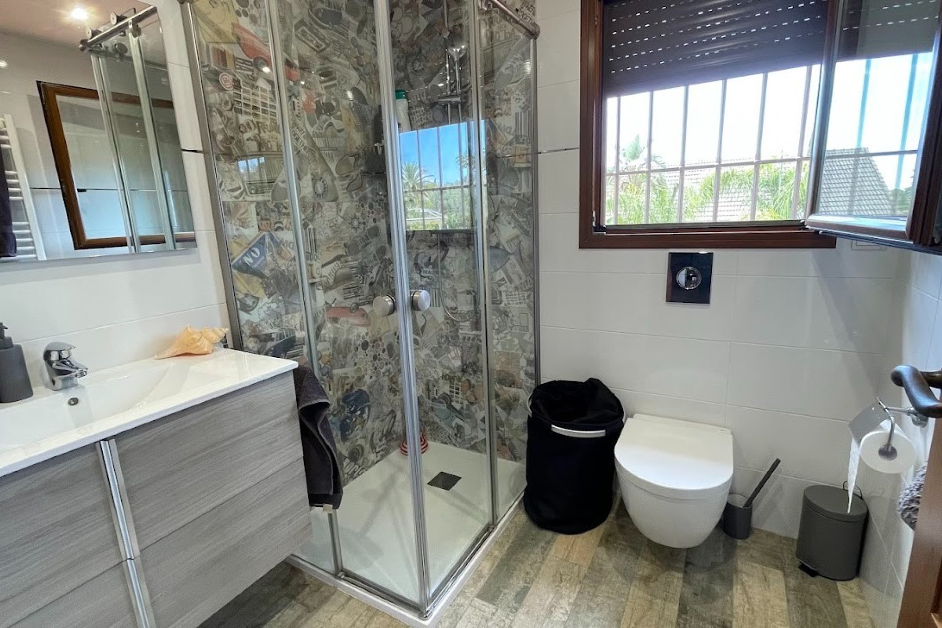 Diese wunderschöne Villa liegt auf halbem Weg von Benidorm nach La Nucia in der Nähe von Geschäften, Restaurants, Supermärkten (Aldi, Mercadona, Masymas), 4 Apotheken, der British Elians School und vielem mehr. Diese charmante, nach Süden ausgerichtete Villa wurde kürzlich mit viel Geschmack und Materialien bester Qualität komplett renoviert. Sie besteht aus zwei Ebenen.Im Erdgeschoss gibt es einen schönen Eingang mit einem Bogen, der zu einer großen Eingangshalle mit einem gemütlichen Wohnzimmer mit Kamin und einem separaten Esszimmer führt, das mit der offenen, voll ausgestatteten Küche verbunden ist. Auf dieser Ebene finden Sie 3 Doppelschlafzimmer mit Kleiderschränken und zwei moderne Badezimmer. Das Hauptschlafzimmer hat einen begehbaren Kleiderschrank mit viel Platz. Auf der oberen Ebene, die vom Wohnzimmer nach oben führt, finden Sie einen Waschraum und zwei große Schlafzimmer mit Bad/Dusche, Kleiderschrank und einem Arbeitszimmer in einem dieser Schlafzimmer. Es gibt auch eine Dachterrasse mit Meerblick. Es gibt eine Zentralheizung mit Dieseltank und Klimaanlage in allen Räumen warm und kalt.Der große Pool ist sehr privat und nicht einsehbar. Außerdem gibt es einen Raum für den Whirlpool und einen überdachten Grill/eine Sommerküche. Obwohl das Grundstück groß ist, ist der Garten mit Bewässerungssystem und vielen Details pflegeleicht gestaltet. Zum Parken gibt es zwei elektrische Tore mit Carport und eine Garage.