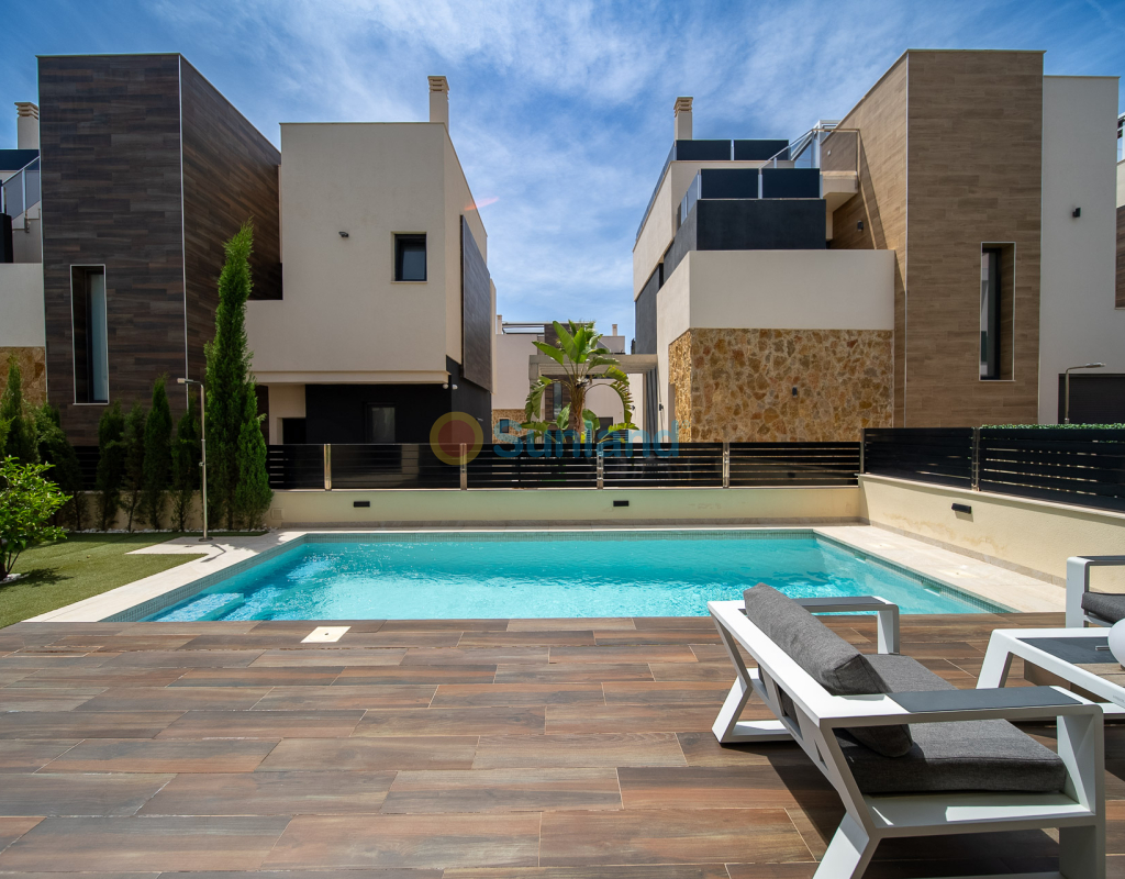 Moderne villa med privat basseng i Lomas de Cabo Roig, Orihuela Costa. Moderne villa i utmerket stand, beliggende i et privat boligområde. Den har 112 m² fordelt over to etasjer: Første etasje: Stue/spisestue og kjøkken med frokostbar, med store vinduer som fører ut til chill-out-området. Ett soverom/kontor, 1 bad og bod. Andre etasje: 2 soverom og 2 bad en suite, med terrasse med tilgang fra soverommene. Privat solarium med havutsikt. Tomten på 201 m² inkluderer parkeringsområde, chill-out-sone og et privat basseng på 21 m². Ekstrautstyr: Gulvvarme i hele boligen Solcellepaneler Hovedfunksjoner: 3 soverom og 3 bad 112 m² bygget Sørvendt Utmerket stand Solarium med havutsikt Bod Møblert Avstander med bil: 7 minutter til stranden 10 minutter til Zenia Boulevard 45 minutter til Alicante flyplass Boligområdet ligger svært nær barer, restauranter, butikker og supermarkeder.
