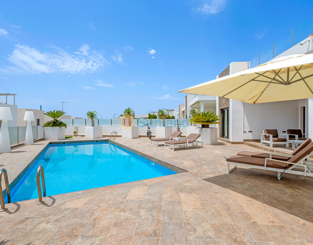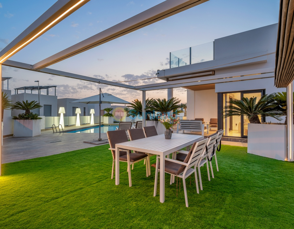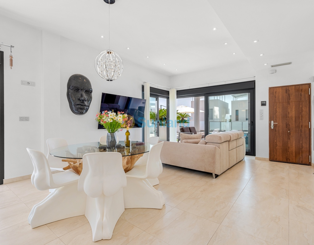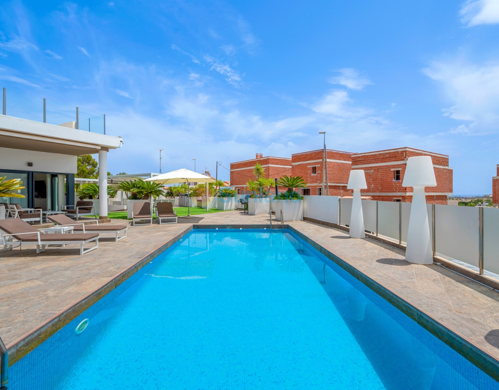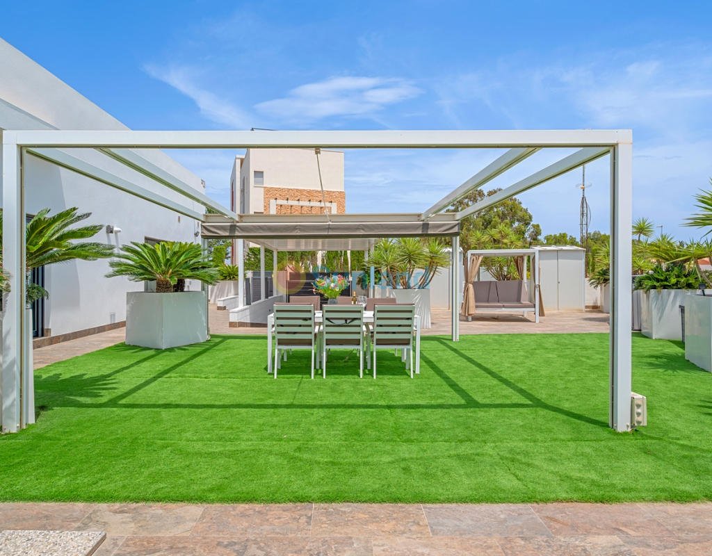 Denne moderne eneboligen fra 2018 ligger i Villamartín, Orihuela Costa. Den har et boareal på 113 m² og står på en romslig tomt på 464 m². Boligen har moderne design og en funksjonell planløsning, perfekt for å nyte den avslappede middelhavslivsstilen. Den sørvendte orienteringen gir naturlig lys hele dagen og skaper en varm og behagelig atmosfære. Villaen har tre romslige soverom med innebygde garderober og to komplette bad, hvorav ett er en suite til hovedsoverommet. Det åpne kjøkkenet er sømløst integrert med spise- og stueområdet, som har direkte utgang til terrassen og det private bassenget. I tillegg er det et separat vaskerom. Uteområdet har privat basseng, lettstelt hage, overbygd terrasse for måltider ute, og en pergola med kunstgress. Det finnes også en stor takterrasse for avslapning og privat parkering på tomten med overbygd carport. Ekstrautstyr inkluderer sentral aircondition, solcellepaneler, kvalitetsmaterialer og gjennomtenkt planløsning. Boligen ligger i et rolig boligområde med kort vei til golfbaner, Zenia Boulevard og flotte strender. Et perfekt valg både som helårsbolig og investering i et av Costa Blancas mest ettertraktede områder.