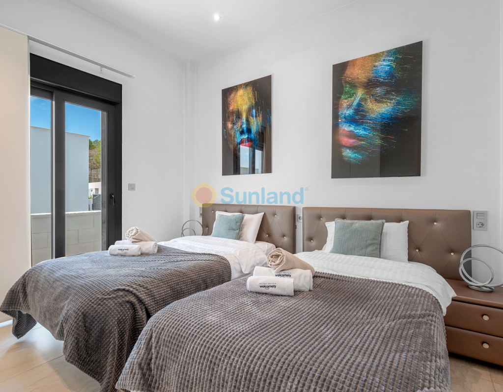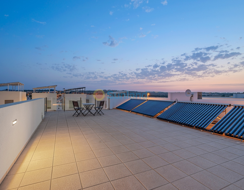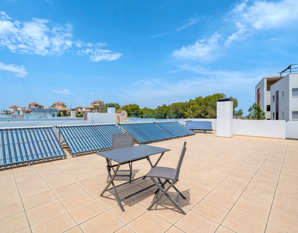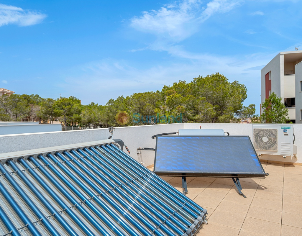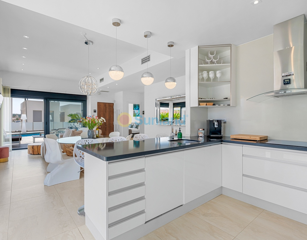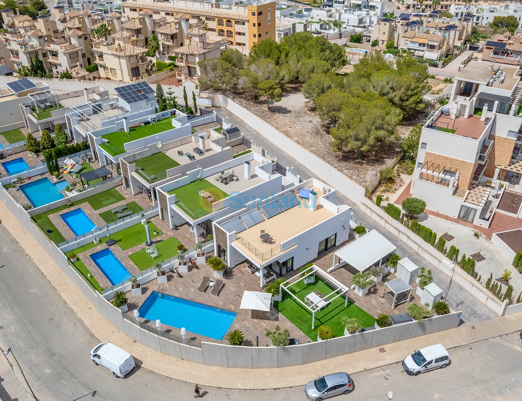 Denne moderne eneboligen fra 2018 ligger i Villamartín, Orihuela Costa. Den har et boareal på 113 m² og står på en romslig tomt på 464 m². Boligen har moderne design og en funksjonell planløsning, perfekt for å nyte den avslappede middelhavslivsstilen. Den sørvendte orienteringen gir naturlig lys hele dagen og skaper en varm og behagelig atmosfære. Villaen har tre romslige soverom med innebygde garderober og to komplette bad, hvorav ett er en suite til hovedsoverommet. Det åpne kjøkkenet er sømløst integrert med spise- og stueområdet, som har direkte utgang til terrassen og det private bassenget. I tillegg er det et separat vaskerom. Uteområdet har privat basseng, lettstelt hage, overbygd terrasse for måltider ute, og en pergola med kunstgress. Det finnes også en stor takterrasse for avslapning og privat parkering på tomten med overbygd carport. Ekstrautstyr inkluderer sentral aircondition, solcellepaneler, kvalitetsmaterialer og gjennomtenkt planløsning. Boligen ligger i et rolig boligområde med kort vei til golfbaner, Zenia Boulevard og flotte strender. Et perfekt valg både som helårsbolig og investering i et av Costa Blancas mest ettertraktede områder.