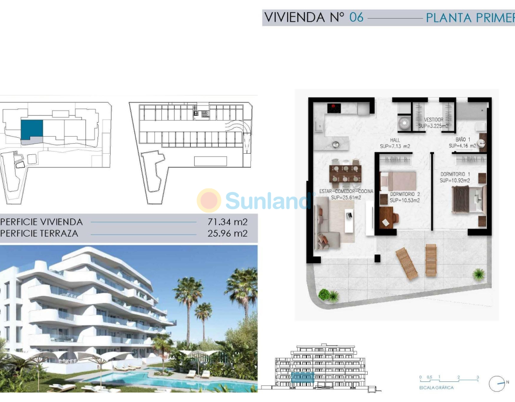 Eksklusivt tilbud på 24 turistleiligheter 200 m fra sjøen – La Torre/Urbanización Mil Palmeras Ny og eksklusiv boutique-boligkompleks med 24 luksuriøse turistleiligheter, beliggende i et privilegert område på den sørlige Costa Blanca, i den veletablerte boligkomplekset Mil Palmeras, som tilhører kommunen Pilar de la Horadada (Alicante). Dette prosjektet ligger i andre linje fra sjøen, bare 200 meter unna, ved en av de beste strendene i regionen, i et bolig- og turistområde som er svært etterspurt på grunn av sin livskvalitet, naturlige omgivelser og komplette fritidstilbud. Omgivelsene har strandbarer, restauranter, idrettsanlegg, strandpromenader og store grønne områder, noe som gjør denne beliggenheten til en av de mest attraktive på Middelhavskysten. Leilighetene er designet i en moderne og funksjonell stil og har høykvalitets finish, store terrasser med havutsikt og interiør som er tenkt for komfort, nytelse og turistinntekter. Bebyggelsen vil omfatte komplette felles hageområder, felles svømmebasseng, resepsjon og fellesstue, som gir ideelle rom for hvile, samvær og velvære. Boliger med 2 soverom, 1 bad, garderobe, stue med integrert kjøkken og store terrasser med utsikt over havet. En parkeringsplass og 1 bod per bolig er inkludert. Boligene leveres møblerte, med hvitevarer og fullt installert klimaanlegg. Privilegert beliggenhet i Mil Palmeras Dette boligområdet ligger mellom Campoamor og Torre de la Horadada og tilbyr enkel tilgang til lokale tjenester, skoler, restauranter og sportsfasiliteter som er åpne hele året. Mil Palmeras er kjent for sin sjarmerende torg og sin livlige «restaurantgate», som tilbyr en rekke internasjonale retter. For naturelskere er naturparken Lo Monte, et beskyttet fuglereservat, og naturparken Río Seco perfekte steder for fotturer og avslapning. Nærhet til de viktigste severdighetene Murcia internasjonale lufthavn: 40 km (ca. 45 minutter). Alicante lufthavn: 75 km (ca. 45 minutter). Nærmeste golfbaner: Mindre enn 10 km. Kjøpesentre: 8 km fra Zenia Boulevard. Yachthavner: 5 km fra Torre de la Horadada. Drømmehuset ditt venter på deg Ikke gå glipp av muligheten til å kjøpe en eiendom i dette unike boligkomplekset. Hvis du er på utkikk etter en feriebolig med mulighet for utleie, har dette boligområdet i Mil Palmeras alt du trenger. Kontakt oss i dag for mer informasjon eller for å avtale en visning.