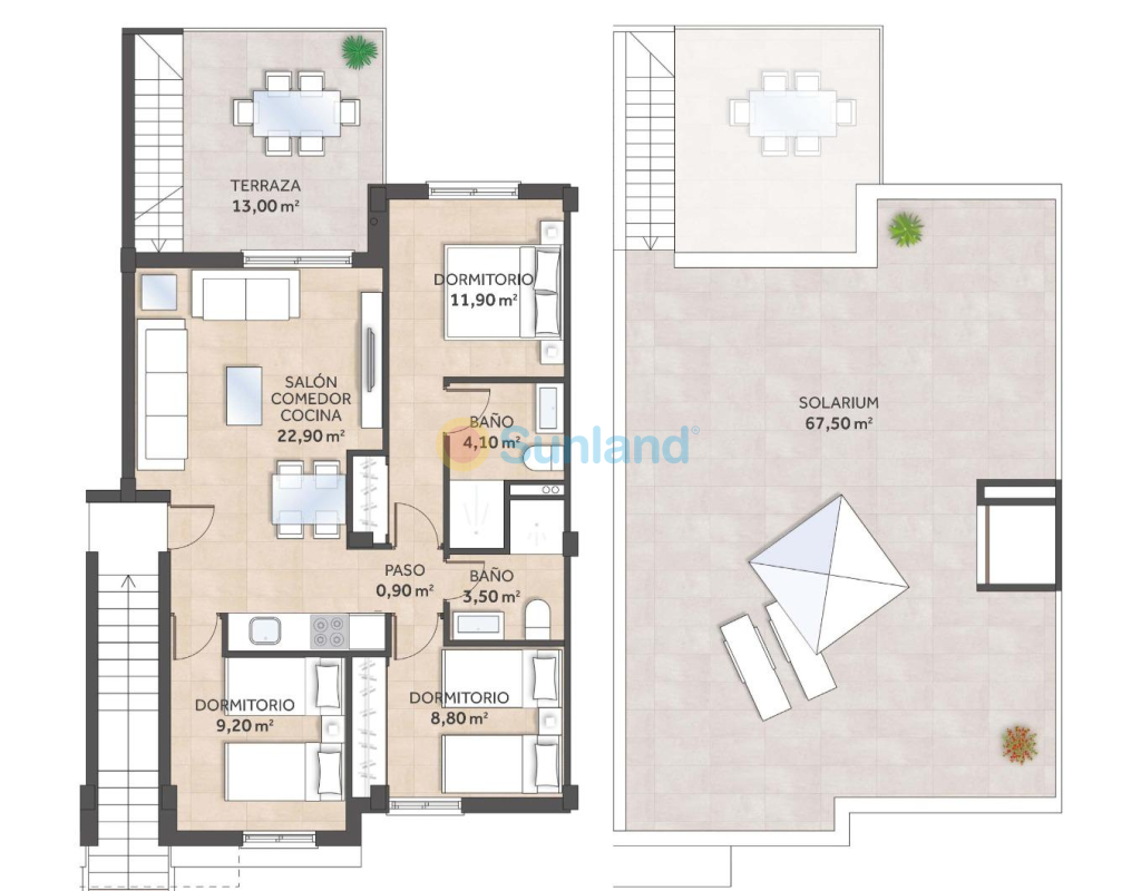 Nybyggede bungalower i San Miguel de Salinas – Natur, golf og komfort Oppdag dette nye boligprosjektet i San Miguel de Salinas, som ligger i det ettertraktede området «La Cañada», omgitt av en beskyttet furuskog mellom de prestisjetunge golfbanene Campoamor og Las Colinas. Bare 7 km fra Middelhavskysten tilbyr dette boligområdet den perfekte blandingen av ro, natur og enkel tilgang til alle fasiliteter. Romslige og moderne boliger Utbyggingen tilbyr to typer boliger som passer til forskjellige livsstiler: Bungalower i første etasje: 2 soverom, 2 bad, to store private hager og overflateparkering. Bungalower i øverste etasje: 2 soverom, 2 bad, romslig solarium med havutsikt og overflateparkering. Hver bolig har generøse dimensjoner og kan tilpasses til en 3-roms planløsning (valgfritt mot ekstra kostnad), med kjøkkenutstyr inkludert. Høy kvalitet Alle boligene er designet for komfort og funksjonalitet og inkluderer: Fullt utstyrte bad med møbler, speil og dusjvegger Aerotermisk varmtvannssystem Innebygde LED-taklamper Eksklusive fellesområder Boligområdet har over 1700 m2 anlagte grønne områder med palmer og middelhavsplanter. Beboerne kan nyte et stort svømmebasseng med boblebad, barnebasseng og solterrasser, noe som gjør dette til et ideelt sted for å nyte klimaet på Costa Blanca hele året. Privilegert beliggenhet i San Miguel de Salinas Dette rolige boligområdet ligger mindre enn 3 km fra den sjarmerende byen San Miguel de Salinas, med alle daglige tjenester i nærheten. I tillegg ligger de vakre sandstrendene i Orihuela Costa og Torrevieja bare 7 km unna, med uendelige muligheter for fritid, shopping og restauranter. Nær kjente golfbaner For golfentusiaster er beliggenheten uovertruffen. Innenfor en radius på 4 km finner du tre av de mest prestisjefylte golfbanene på Costa Blanca: Villamartín Golf – 3,5 km Las Colinas Golf & Country Club – 4 km Campoamor Golf – 4 km Utmerket tilknytning Viktige severdigheter i nærheten inkluderer: San Miguel de Salinas – 3 km La Zenia Boulevard kjøpesenter – 10 km Alicante lufthavn – 55 km Murcia lufthavn (Corvera) – 50 km Sikre deg ditt nye hjem i San Miguel de Salinas Enten du er på utkikk etter en permanent bolig, et feriested eller en investeringsmulighet, tilbyr disse nybygde bungalowene utmerket verdi i et av de mest attraktive områdene på Costa Blanca. Kontakt oss i dag for mer informasjon og for å avtale en visning.
