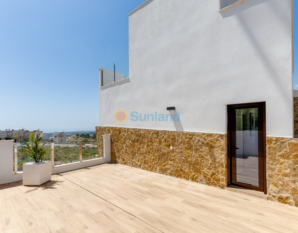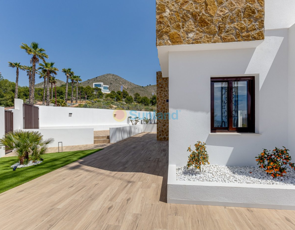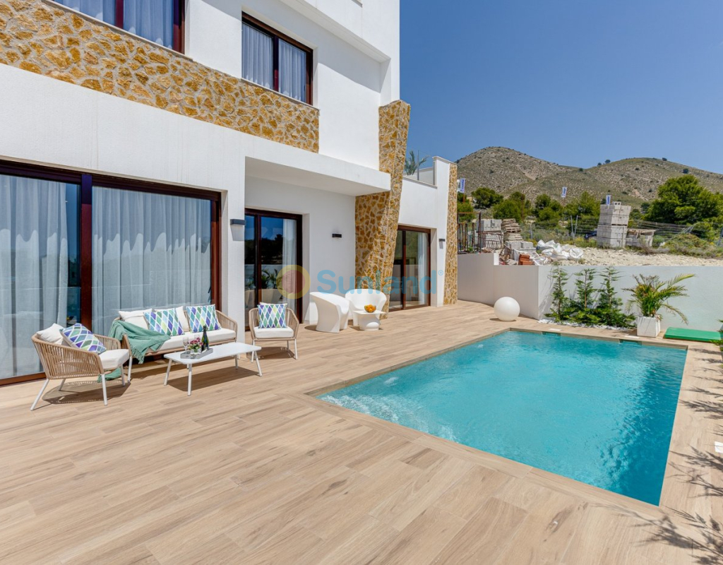 NYBYGGDE VILLAER I BALCON DE FINESTRAT Nybygg moderne villaer i Balcon de Finestrat. Brede og lyse villaer med 3 soverom og 2 bad, åpen kjøkkenløsning med stue/spisestue, vakker terrasse, privat hage med basseng og parkeringsplass. Kombinasjon av tre og naturstein gjør huset moderne og rustikk på samme tid. Villaer som ligger 10 minutter fra Benidorm og kun 2 km fra Finestrat. Turen til Tierra Mitica hvor du kan tilbringe hyggelig tid med familien vil ta 6 minutter. Denne beliggenheten gjør det til et godt valg for et feriehus. Finestrat ligger i Marina Baixa-regionen på Costa Blanca, nær nabolandet Benidorm og ca. 40 kilometer fra byen Alicante og den internasjonale flyplassen. Landsbyen ligger i fjellsiden av Puig Campana og tilbyr vakker utsikt over fjellene, kysten og Middelhavet. Benidorm ligger bare en fem-minutters kjøretur fra eiendommene og tilbyr alle tjenestene du trenger, inkludert butikker, barer, restauranter, supermarkeder, banker, apotek og flere private internasjonale skoler. Nær strendene i Levante, Poniente og Cala de Finestrat, med mer enn 6 km i lengde som er blant de beste i Europa tildelt av EU med blå flagg. Alle fritidstjenester som fornøyelsesparkene Aqua Natura, Terra Mítica, Terra Natura, Aqualandia og Mundomar, Sierra Cortina og Villaitana golfbaner, fotturer og klatring i Puig Campana en uforlignelig naturlig setting eller nyte nautisk sport.