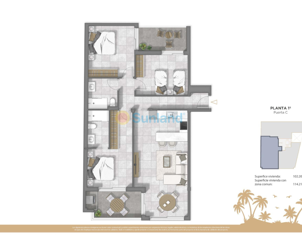 Nye leiligheter i sentrum av Guardamar del Segura, Costa Blanca Førsteklasses beliggenhet nær stranden Oppdag dette eksepsjonelle nybygget boligkomplekset som ligger i hjertet av Guardamar del Segura, en sjarmerende kystby kjent for sine naturlige sanddyner, furuskoger og gylne sandstrender. Med en ideell beliggenhet bare 1 km fra stranden og innen gangavstand til butikker, restauranter, supermarkeder og fritidstilbud, tilbyr dette prosjektet den perfekte balansen mellom bekvemmelighet og middelhavsstil. Stilfulle boliger designet for komfort Dette moderne boligkomplekset består av leiligheter med 2 og 3 soverom og 2 bad (inkludert ett en-suite). Kjøpere kan velge mellom leiligheter i første etasje med terrasse og uteplass, leiligheter i mellomste etasje med terrasse eller penthouse-leiligheter med privat solarium, ideelt for å nyte solen og havbrisen hele året. Hver bolig har et åpent kjøkken integrert med en romslig stue, innebygde garderober og et privat oppbevaringsrom på taket. Valgfrie parkeringsplasser i første etasje er tilgjengelige for ekstra bekvemmelighet. Førsteklasses kvalitet og energieffektivitet Boligene er designet for å tilby moderne komfort og effektivitet, og har høykvalitets finish: Fullt utstyrte bad med servantskap, speil og skjermer Sikkerhetsforsterket inngangsdør Aerotermisk varmtvannssystem Doble vinduer med termisk barriere Heis med tilgang til alle etasjer Vakre fellesarealer Komplekset har attraktive grønne områder, et felles svømmebasseng og et felles solarium på taket, som gir beboerne avslappende uteområder i solen. Nyt det beste Guardamar har å tilby Guardamar del Segura tilbyr 11 km med naturlige strender, en marina med aktiviteter året rundt, idrettsanlegg med padel, tennis, fotball og et oppvarmet innendørsbasseng, samt parker, markeder og kulturelle arenaer. Med sin avslappede kystatmosfære og et komplett utvalg av tjenester er det et ideelt sted både for permanent opphold og ferieturer. Viktige avstander: Strand: 1 km Alicante-Elche flyplass: 20 km La Marquesa Golf: 8 km Torrevieja marina: 14 km Guardamar marina: 2 km Sikre deg ditt nye hjem på Costa Blanca Ikke gå glipp av muligheten til å bo i et av de mest attraktive områdene på Costa Blanca. Kontakt oss i dag for å avtale en visning og oppdag ditt fremtidige hjem i Guardamar del Segura.