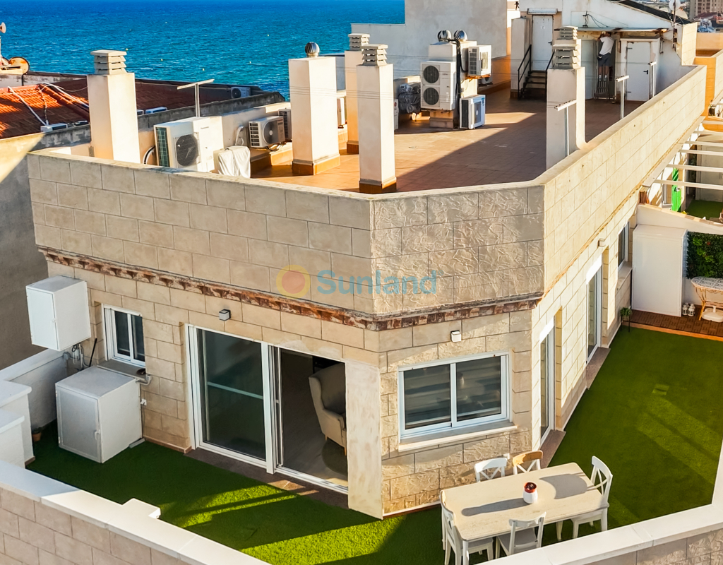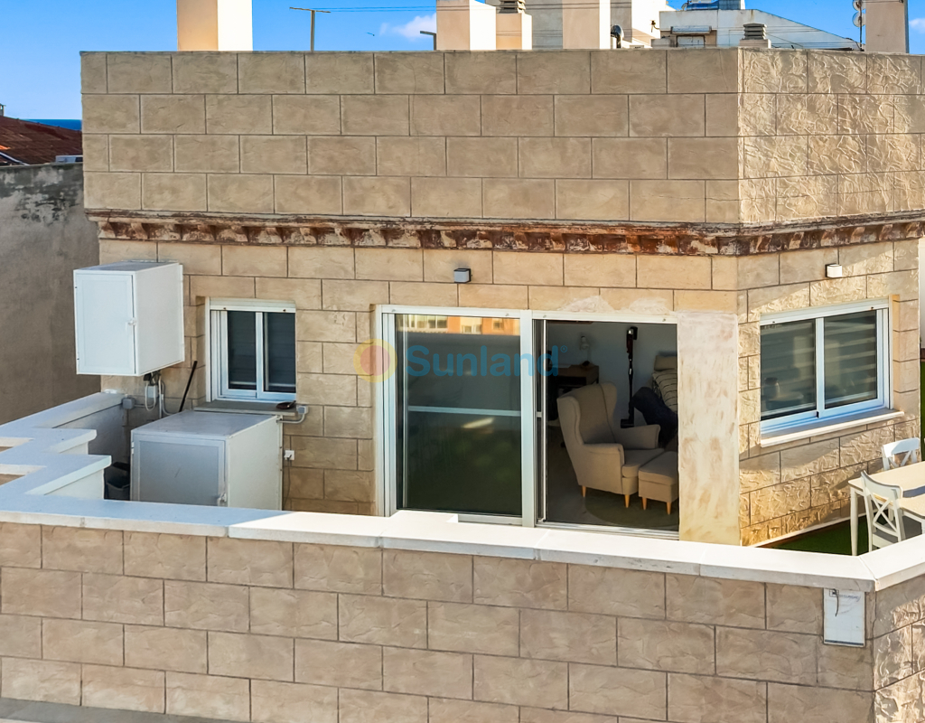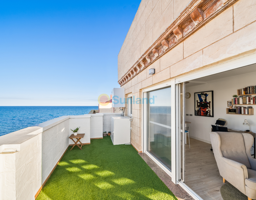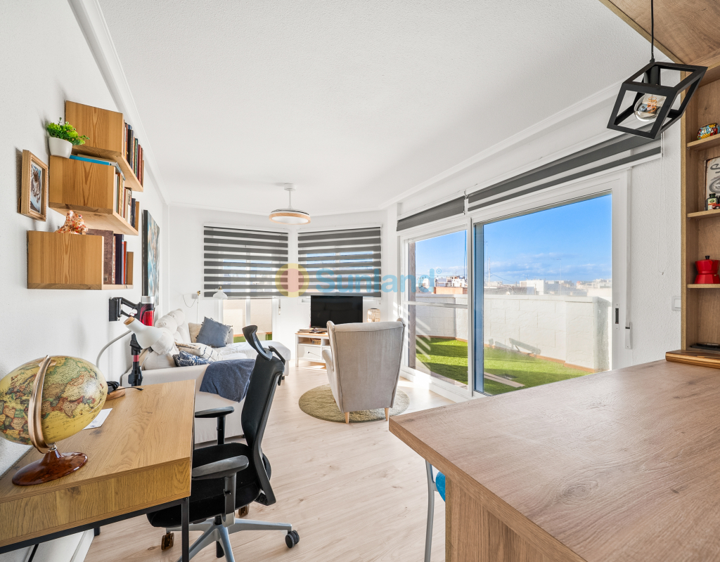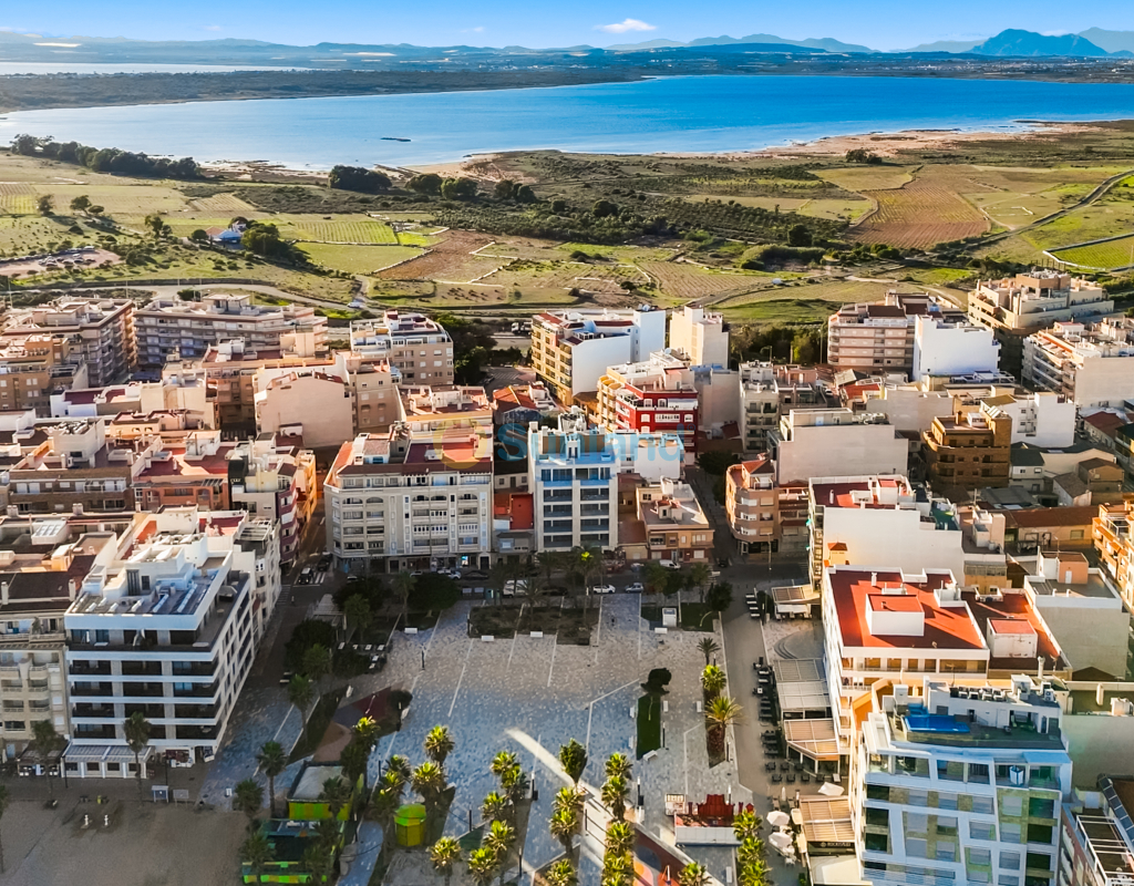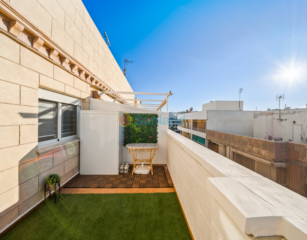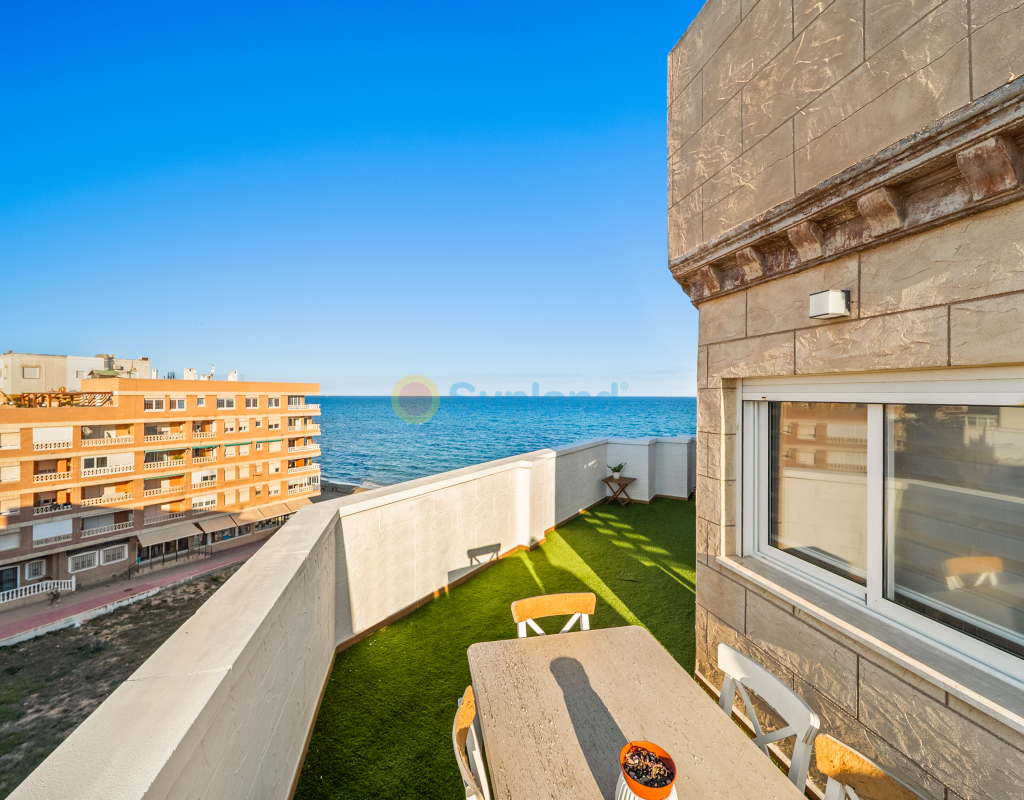 Renoveret toppleilighet på hjørnet med havutsikt i La Mata. Toppleilighet i 5. etasje, nylig renovert og kun 50 meter fra stranden i La Mata. Boligen har 90 m² og en stor terrasse på 45 m² med havutsikt. Den består av 2 soverom, 2 bad, åpen kjøkkenløsning og lys stue med direkte utgang til terrassen. Selges fullt møblert og utstyrt, med aircondition og vestvendt orientering. Kvaliteter: 2 soverom 2 bad 90 m² 45 m² terrasse med havutsikt Åpen kjøkkenløsning Aircondition Vestvendt etasje Møblert Bygg med heis Årlige kostnader: IBI: 250 € Felleskostnader: 400 € Beliggenhet: 50 m til stranden i La Mata 50 m til barer og restauranter 100 m til supermarked 500 m til naturparken Laguna Salada de La Mata