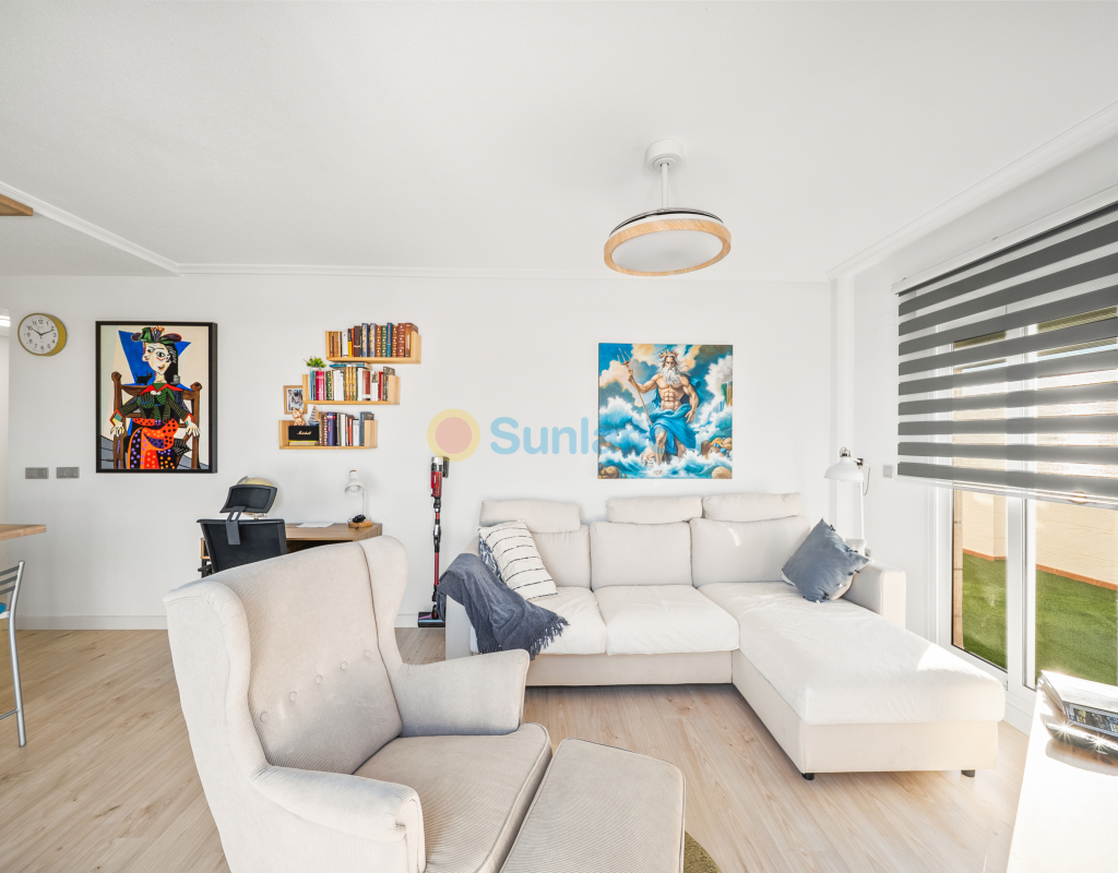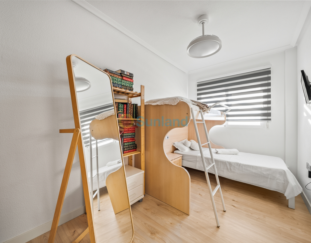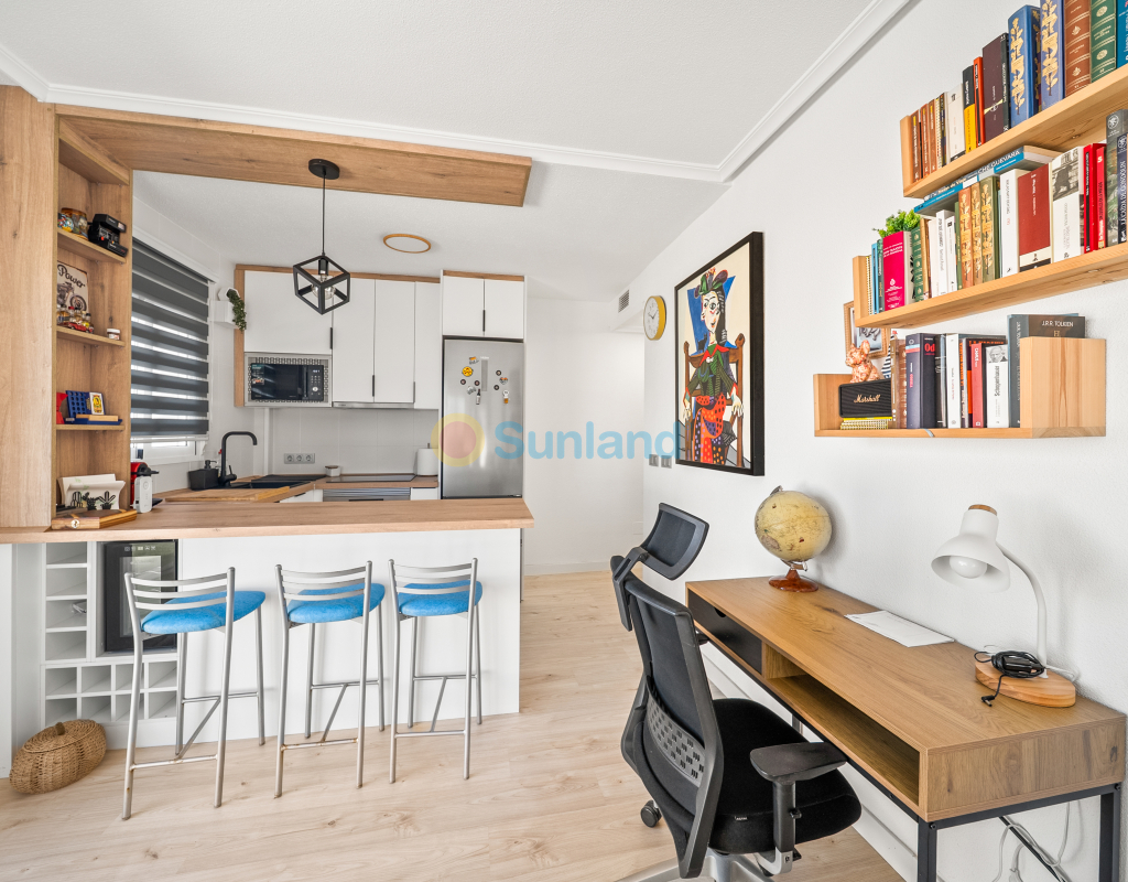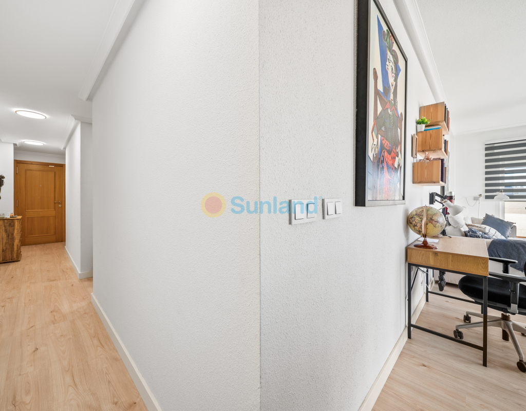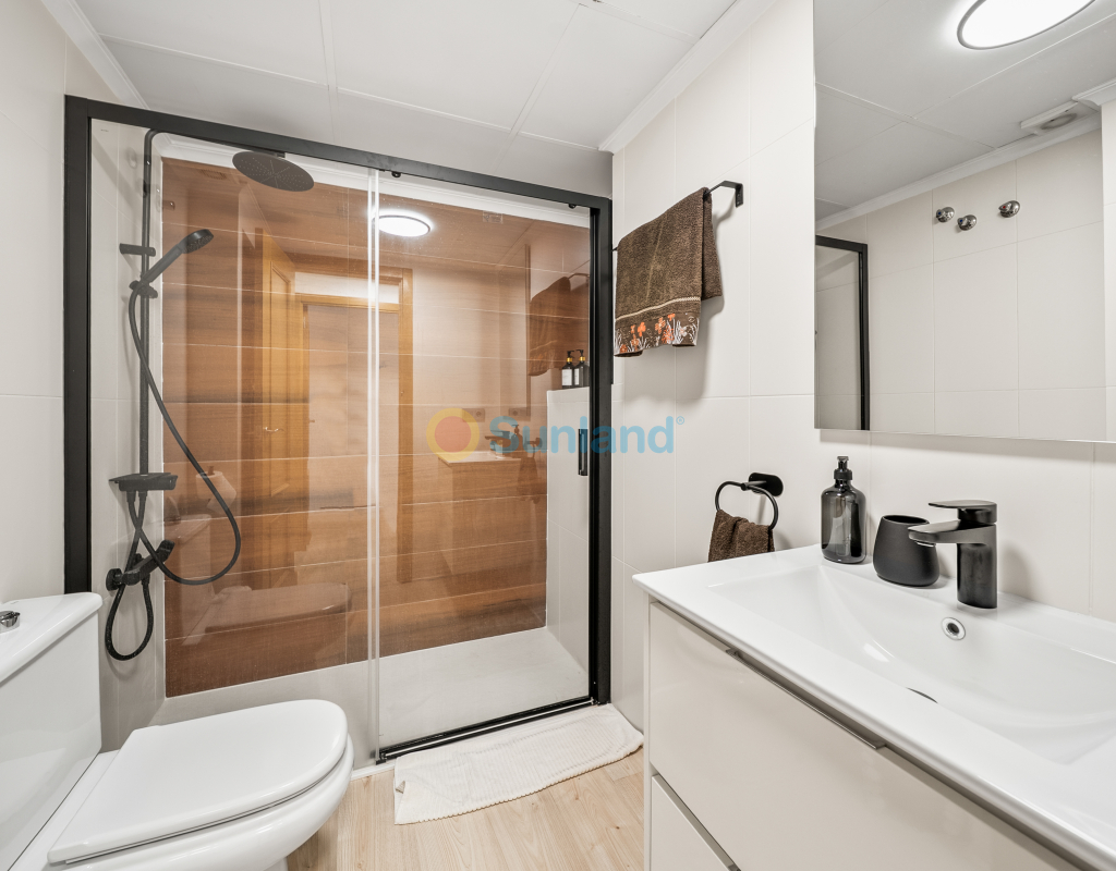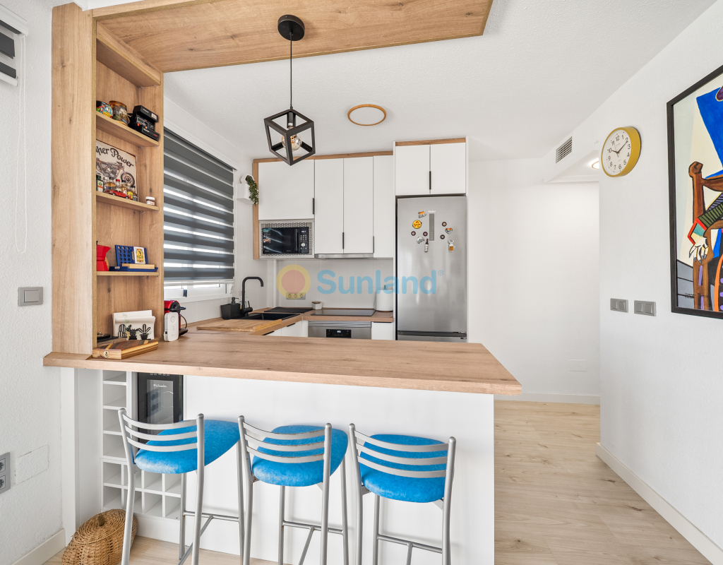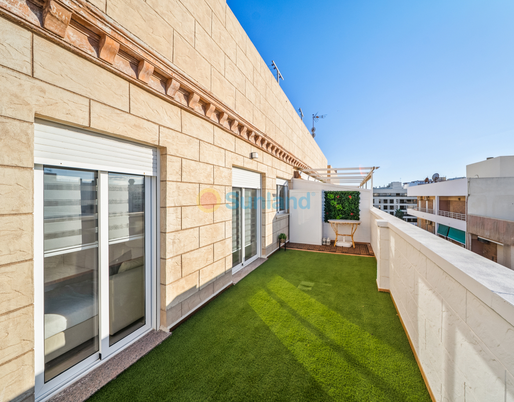 Renoveret toppleilighet på hjørnet med havutsikt i La Mata. Toppleilighet i 5. etasje, nylig renovert og kun 50 meter fra stranden i La Mata. Boligen har 90 m² og en stor terrasse på 45 m² med havutsikt. Den består av 2 soverom, 2 bad, åpen kjøkkenløsning og lys stue med direkte utgang til terrassen. Selges fullt møblert og utstyrt, med aircondition og vestvendt orientering. Kvaliteter: 2 soverom 2 bad 90 m² 45 m² terrasse med havutsikt Åpen kjøkkenløsning Aircondition Vestvendt etasje Møblert Bygg med heis Årlige kostnader: IBI: 250 € Felleskostnader: 400 € Beliggenhet: 50 m til stranden i La Mata 50 m til barer og restauranter 100 m til supermarked 500 m til naturparken Laguna Salada de La Mata