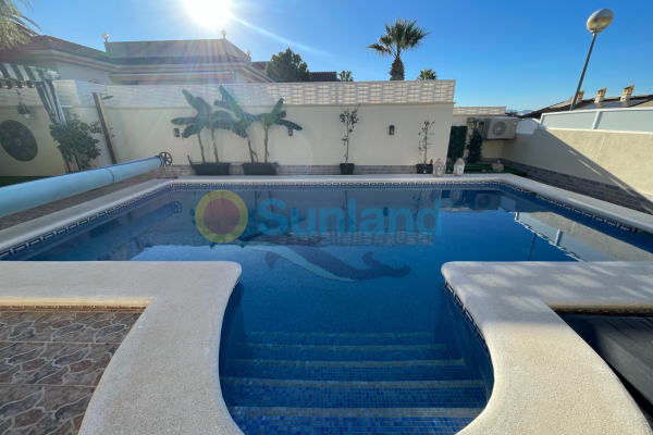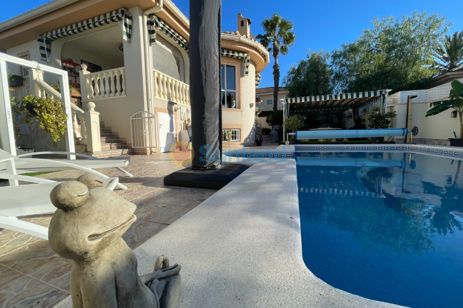 Ligger i et rolig og populært område mellom Rojales og Ciudad Quesada, og denne villaen på to etasjer står på en tomt på 500 m². Øverste etasje har entre, stue, kjøkken med spisestue, to soverom og to bad (ett av dem en suite) med en koselig terrasse. Nederste etasje har ekstra stue/soverom, kjøkken, tre soverom og ett bad, totalt 5 soverom.