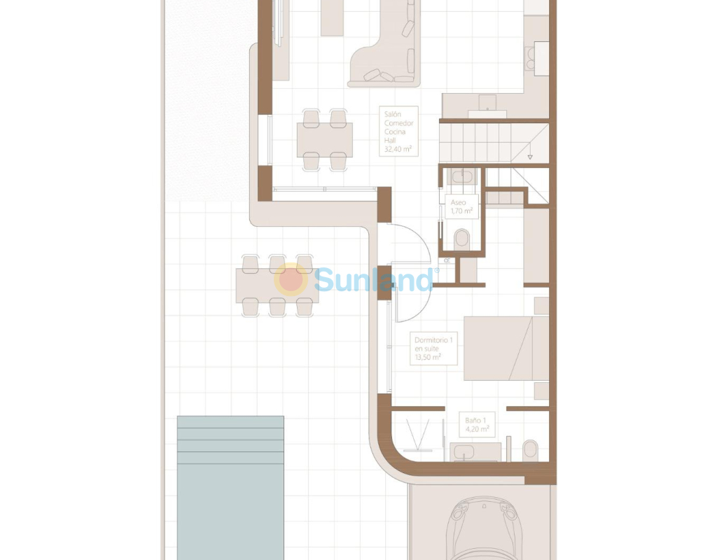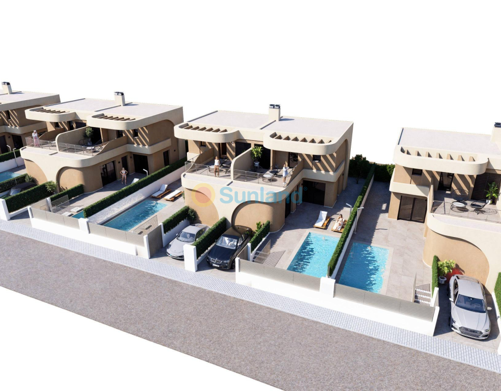 Moderne tomannsboliger i Daya Nueva med moderne design og utmerket tilknytning Fredelig liv i Daya Nueva Disse nye tomannsboligene ligger i den sjarmerende byen Daya Nueva sør i Alicante. Daya Nueva er kjent for sin fredelige landlige atmosfære og tilbyr en komfortabel livsstil omgitt av frukthager og åpne landskap, samtidig som den ligger bare en kort kjøretur fra de livlige kystområdene på Costa Blanca. Byen tilbyr viktige tjenester, restauranter og lokale butikker, og ligger bare 10 km fra strendene i La Marina del Pinet og Guardamar del Segura. Alicante internasjonale lufthavn ligger omtrent 25 km unna, noe som gjør den svært tilgjengelig for internasjonale huseiere. Golfelskere vil sette pris på å være innenfor 12 km fra La Marquesa Golf og 15 km fra Vistabella Golf. Elegant arkitektur og kvalitetsbygging Dette eksklusive prosjektet er designet med stor oppmerksomhet på detaljer, og har en lys, frisk og moderne arkitektonisk stil. Fasadens buede linjer skaper et unikt, moderne utseende, mens høykvalitets finish sikrer varig komfort. Funksjonell planløsning over to etasjer Hver villa er fordelt over to etasjer i det nye boligområdet Daya Nueva, innen gangavstand til sentrum. Første etasje har stue og spisestue med åpen kjøkkenløsning, direkte tilgang til hagen, et soverom med eget bad og walk-in-garderobe, gjestetoalett og privat parkeringsplass på tomten. Et privat basseng kan legges til mot en ekstra kostnad. Øverste etasje har to soverom til, et komplett bad og en 19 m2 åpen terrasse med flott utsikt. Komfort og moderne funksjoner Boligene er utstyrt med innredede bad med møbler, speil og dusjvegger. Ytterligere funksjoner inkluderer forhåndsinstallert klimaanlegg, møblerte kjøkken, elektriske persienner i soverommene, LED-belysning innendørs og utendørs og tre solcellepaneler. Ideell beliggenhet for kyst- og landlig liv Villaene ligger i et rolig nytt boligområde med enkel tilgang til motorveien A 70. Strendene, golfbanene, marinaene og nærliggende byer ligger alle i kort avstand, noe som gjør dette til en ideell beliggenhet for både ferie og helårsbolig. Kontakt oss i dag for å avtale et besøk og sikre deg ditt nye hjem i Daya Nueva.