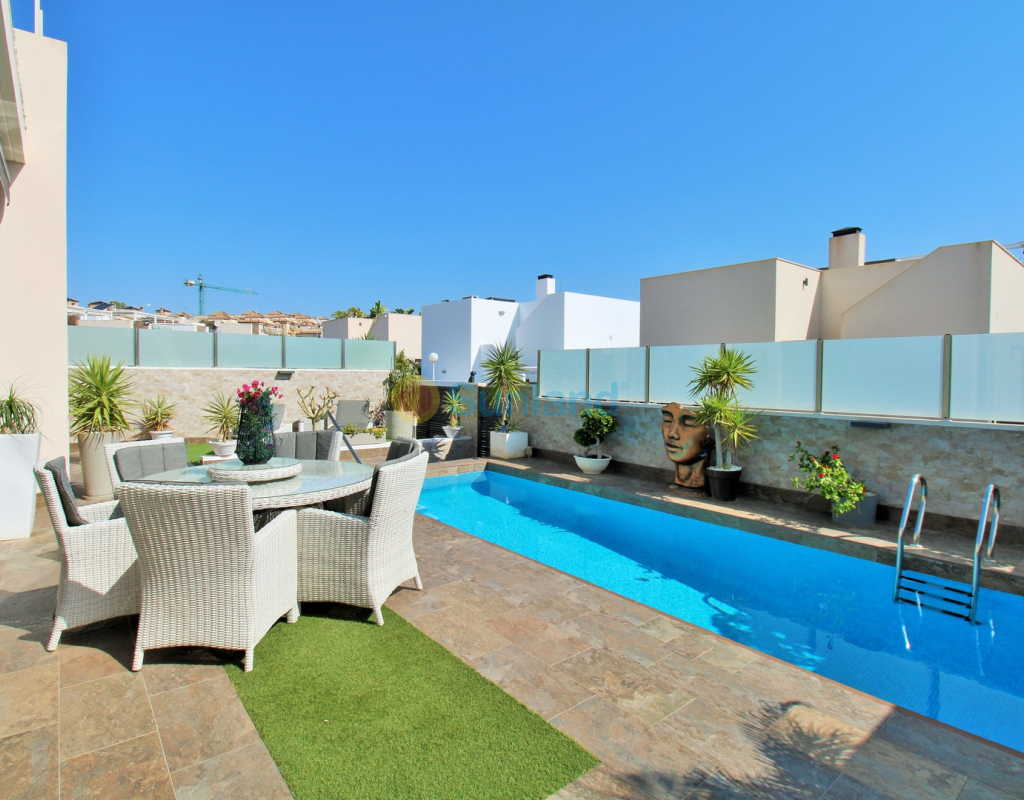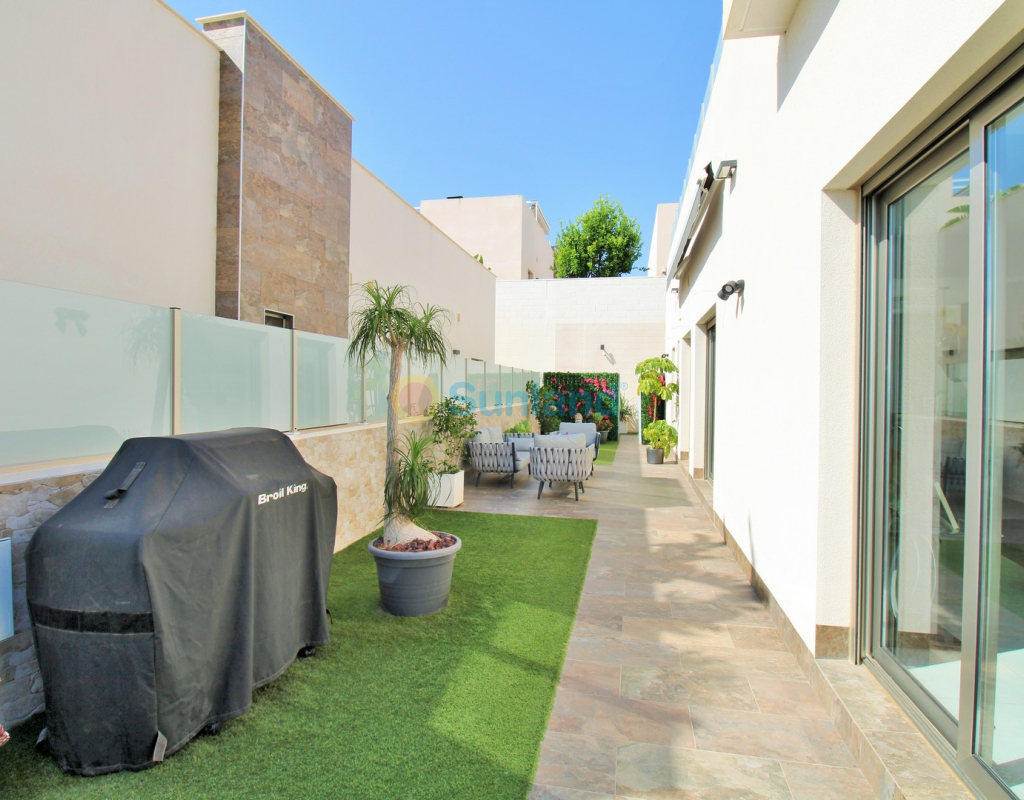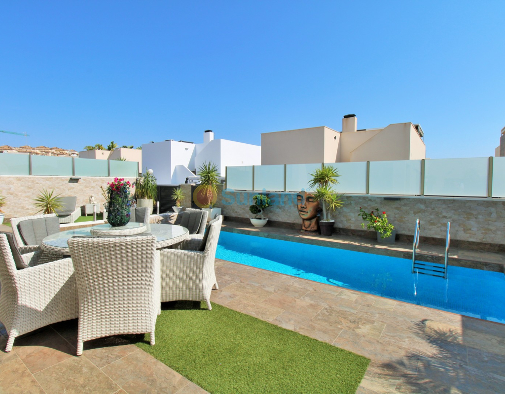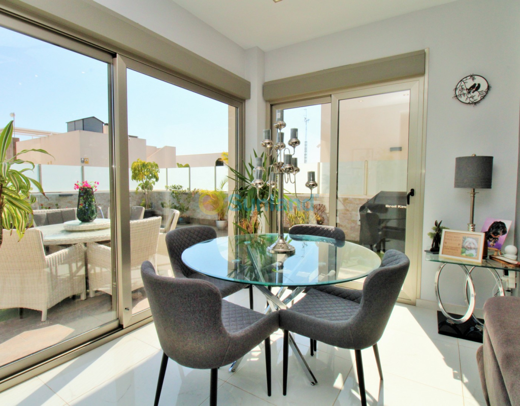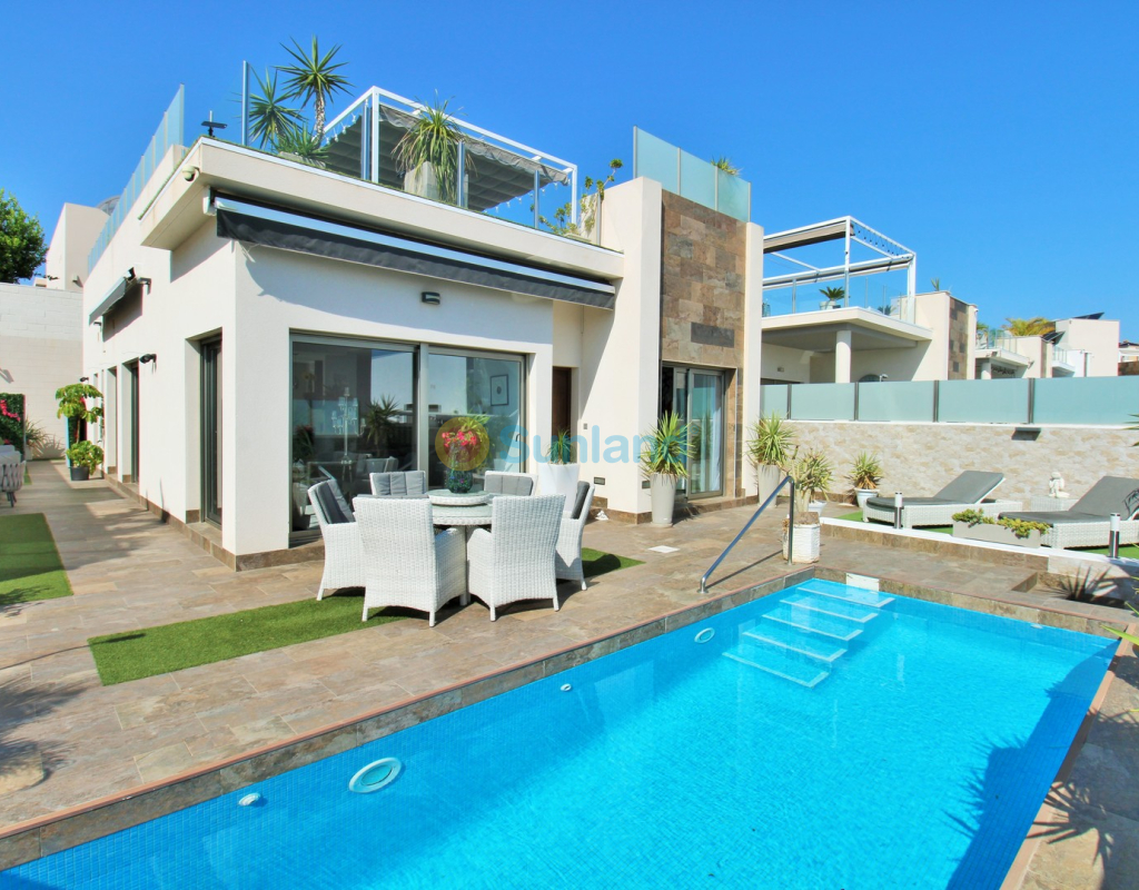 This beautifully presented 4-bedroom Innova villa is located in a sought-after area of Villamartin, just a short drive from local amenities. Designed for comfortable single-level living, the property boasts a private swimming pool, off-road parking, and a spacious L-shaped garden—ideal for relaxing or entertaining guests. The interior features a large, bright open-plan living and dining area, seamlessly connected to a modern American-style kitchen with sleek built-in appliances. A separate utility room provides added practicality. The villa offers 4 well-sized bedrooms and 2.5 bathrooms, with the potential to easily convert the guest WC into a full third bathroom, as pre-installation for a walk-in shower is already in place. This home is filled with natural light thanks to large windows and high ceilings, and includes ducted hot and cold air-conditioning for year-round comfort. Electric blinds throughout allow for easy control of light and privacy. One of the standout features of this property is the expansive roof solarium, covering the full footprint of the house. It includes a stylish bar area, electric awnings with built-in wind sensors that automatically retract, and modern glass balustrades offering both safety and privacy—making it the perfect spot to enjoy the sun or entertain in total seclusion. Situated just 1km from an ALDI supermarket and the Via Park commercial centre, with a wide range of bars and restaurants close by, the villa is also only a short drive to the popular Villamartin Plaza and golf course. Thoughtfully designed and exceptionally well-located, this villa offers a blend of modern comfort, low-maintenance living, and Mediterranean charm.