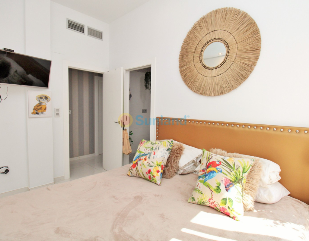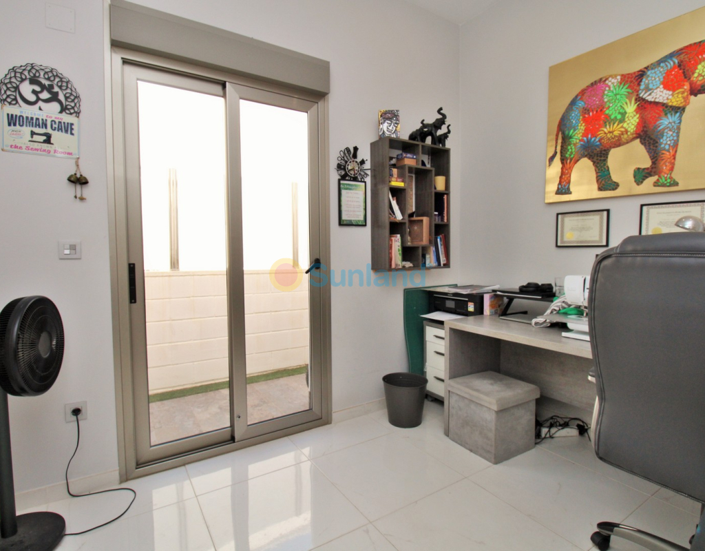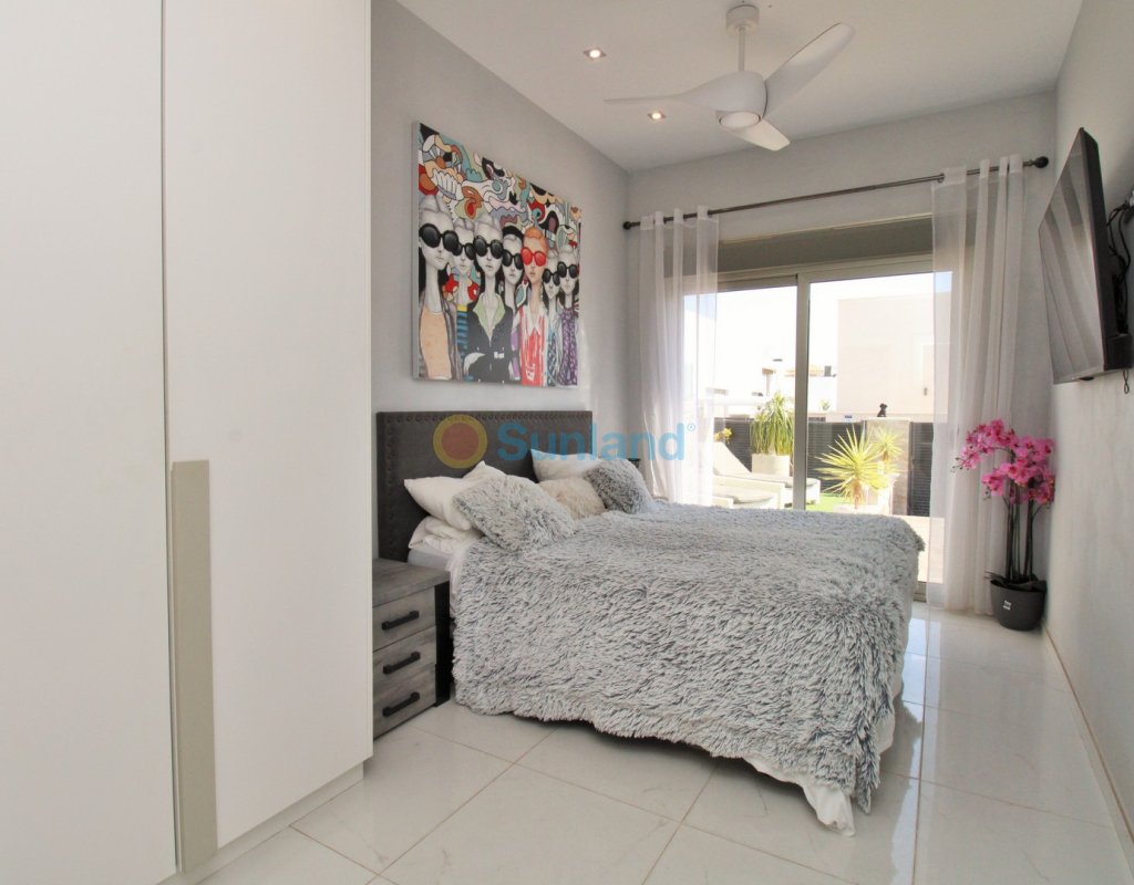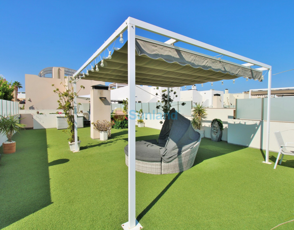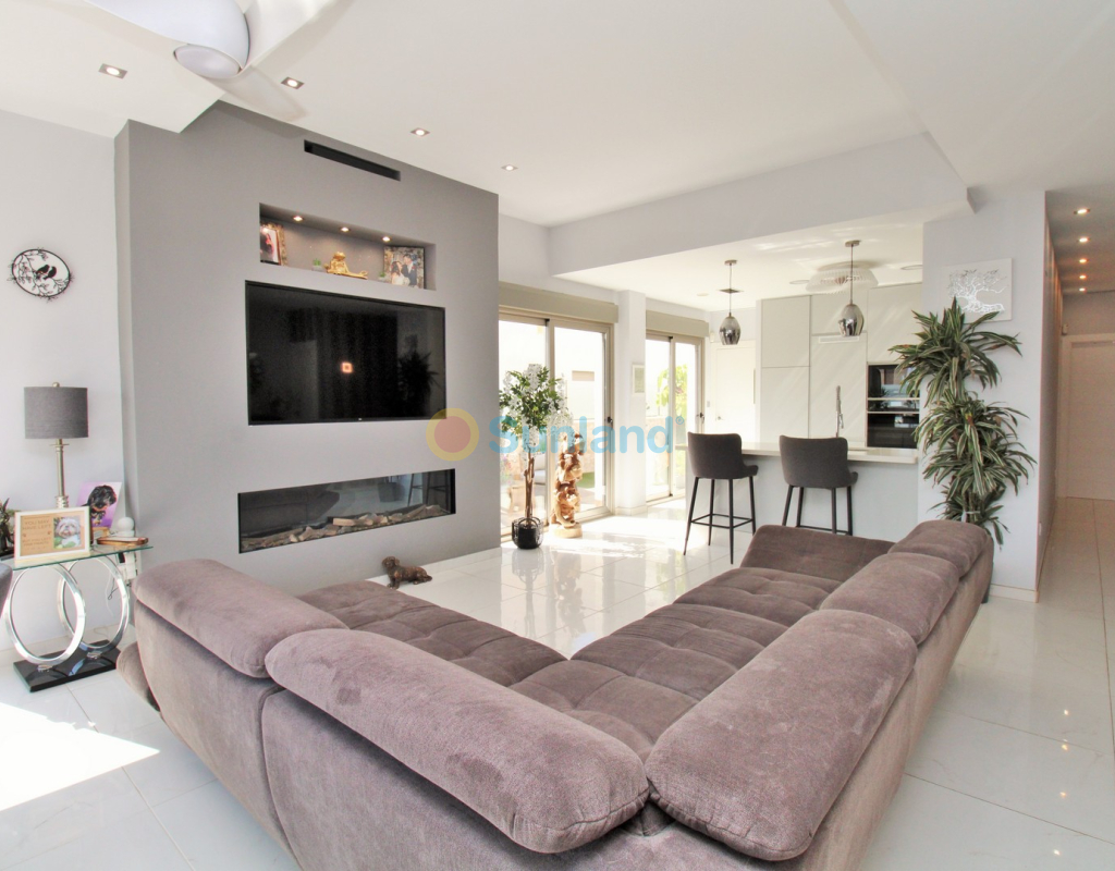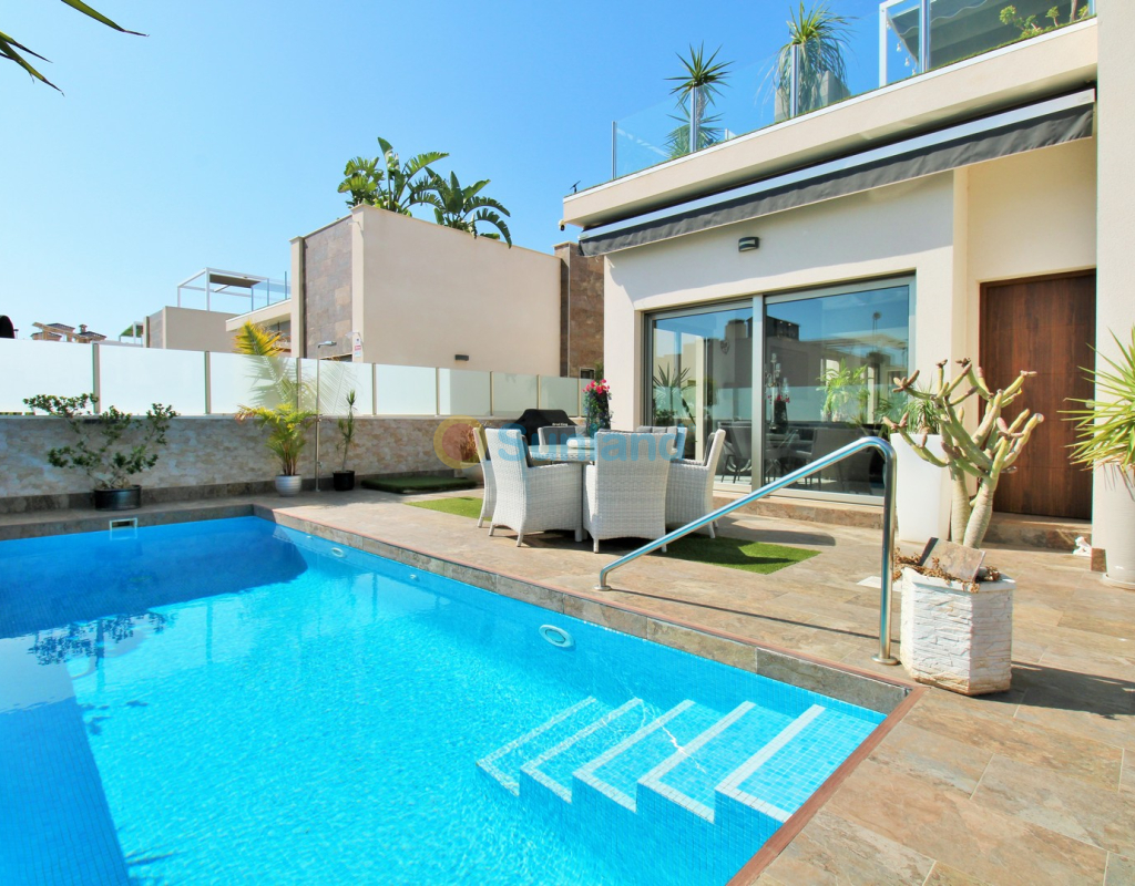 This beautifully presented 4-bedroom Innova villa is located in a sought-after area of Villamartin, just a short drive from local amenities. Designed for comfortable single-level living, the property boasts a private swimming pool, off-road parking, and a spacious L-shaped garden—ideal for relaxing or entertaining guests. The interior features a large, bright open-plan living and dining area, seamlessly connected to a modern American-style kitchen with sleek built-in appliances. A separate utility room provides added practicality. The villa offers 4 well-sized bedrooms and 2.5 bathrooms, with the potential to easily convert the guest WC into a full third bathroom, as pre-installation for a walk-in shower is already in place. This home is filled with natural light thanks to large windows and high ceilings, and includes ducted hot and cold air-conditioning for year-round comfort. Electric blinds throughout allow for easy control of light and privacy. One of the standout features of this property is the expansive roof solarium, covering the full footprint of the house. It includes a stylish bar area, electric awnings with built-in wind sensors that automatically retract, and modern glass balustrades offering both safety and privacy—making it the perfect spot to enjoy the sun or entertain in total seclusion. Situated just 1km from an ALDI supermarket and the Via Park commercial centre, with a wide range of bars and restaurants close by, the villa is also only a short drive to the popular Villamartin Plaza and golf course. Thoughtfully designed and exceptionally well-located, this villa offers a blend of modern comfort, low-maintenance living, and Mediterranean charm.