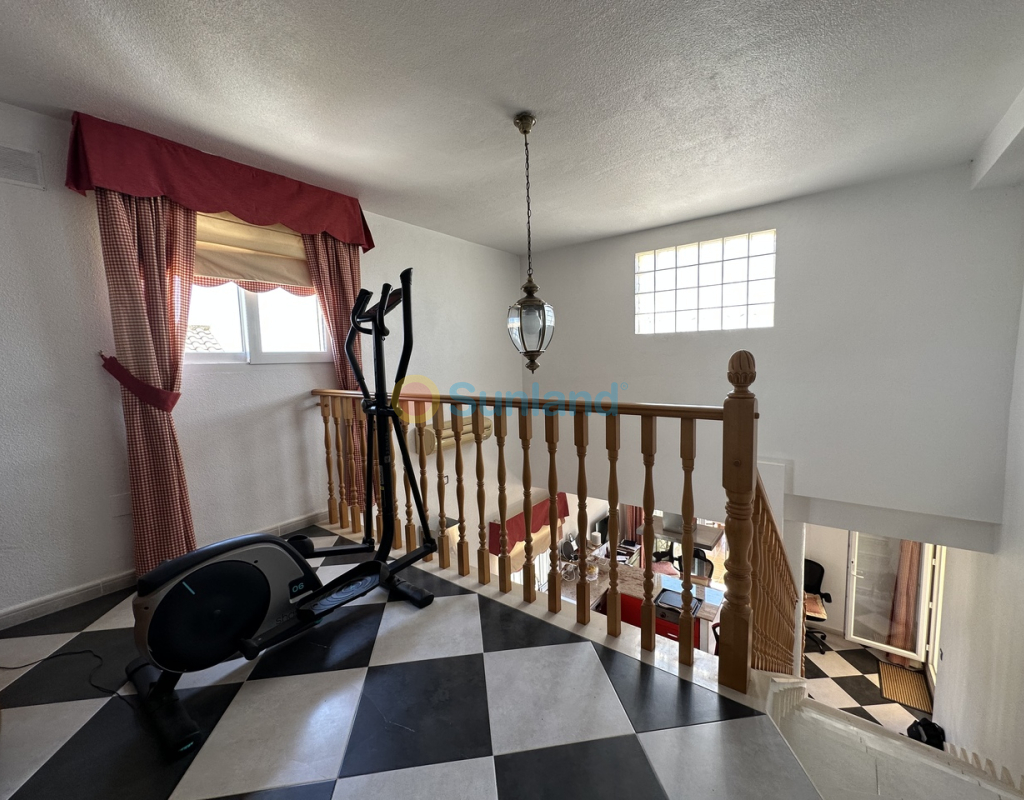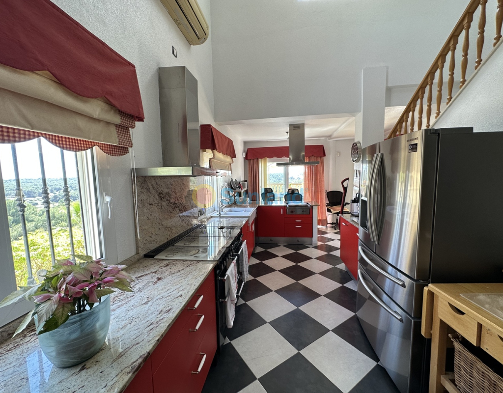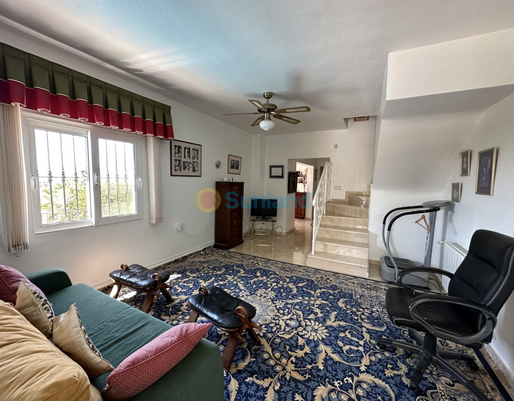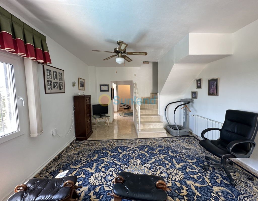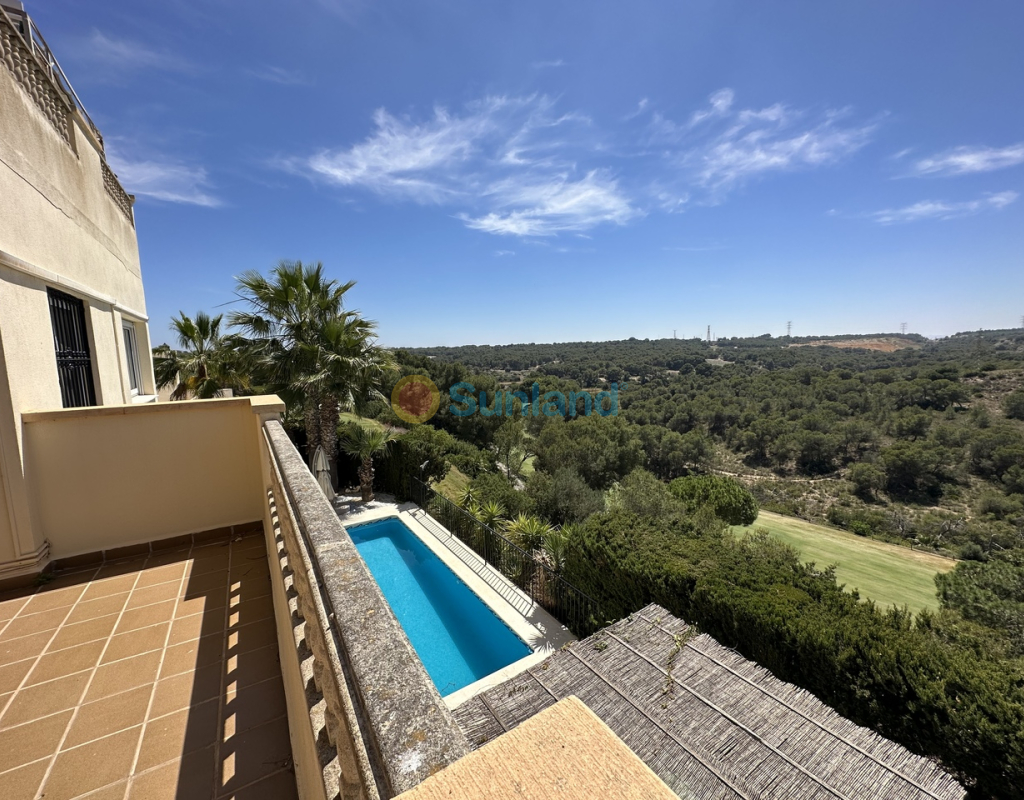 Immaculate villa for sale located with elevated, front-line views located at Las Ramblas golf resort. This impressive south facing property was designed so that every room boasts spectacular views across the golf course and pine forrest. On the main level of the property is a huge living room with seperate television and dining areas along with a guest toilet. There is an impressive fully equipped kitchen with vaulted ceiling and a staircase leading to an additional chill out area and a private office. From the living room there is access to a very sunny terrace, purpose built bbq and outdoor dining area with again more breathtaking views of the golf course. An internal staircase leads down to the master bedroom which had a private sun terrace, dressing room and double bathroom with a shower and bathtub. There are two additional guest bedrooms and a guest bathroom. The property also has a second lounge and living area with kitchen, bathroom and even a cocktail bar with direct access to the swimming pool and sunbathing deck. The property has been finished to a high quality and finished with many, many extras including private garage, air-conditioning, two fireplaces, mosquito nets, electric gates and alarm system.