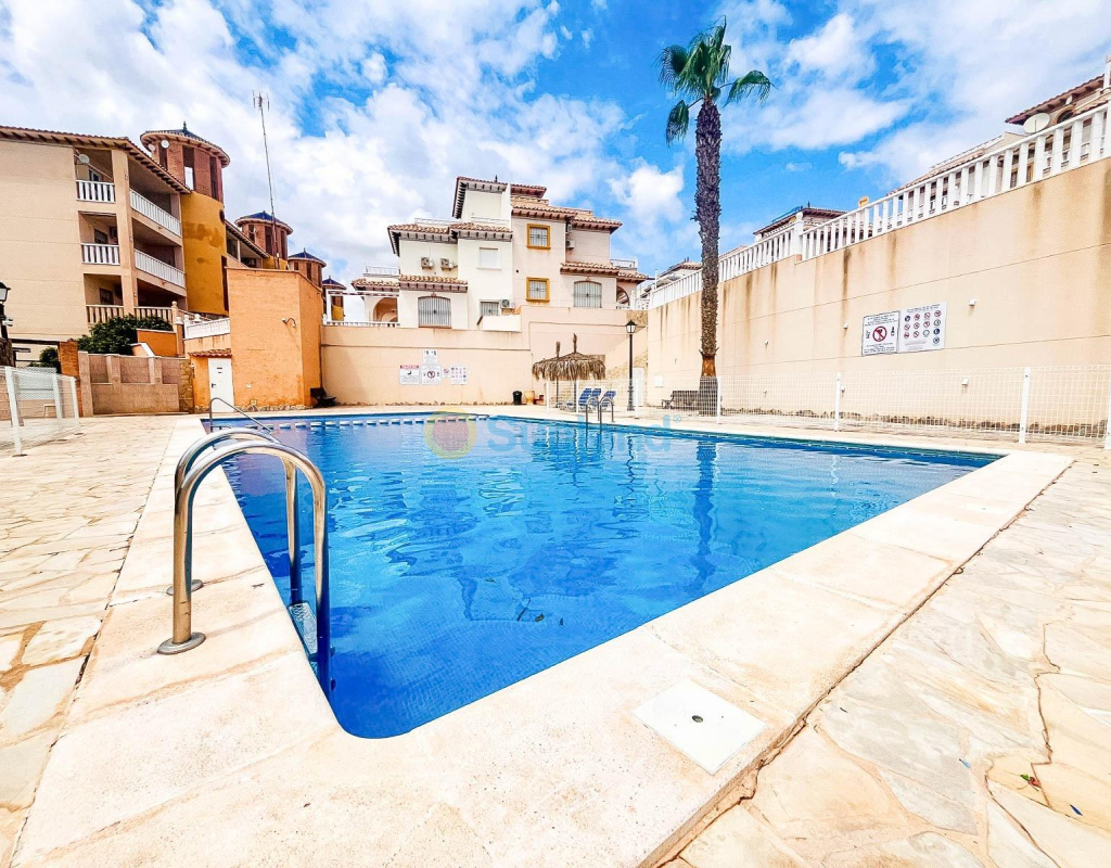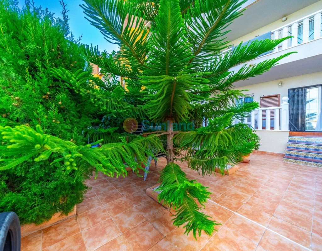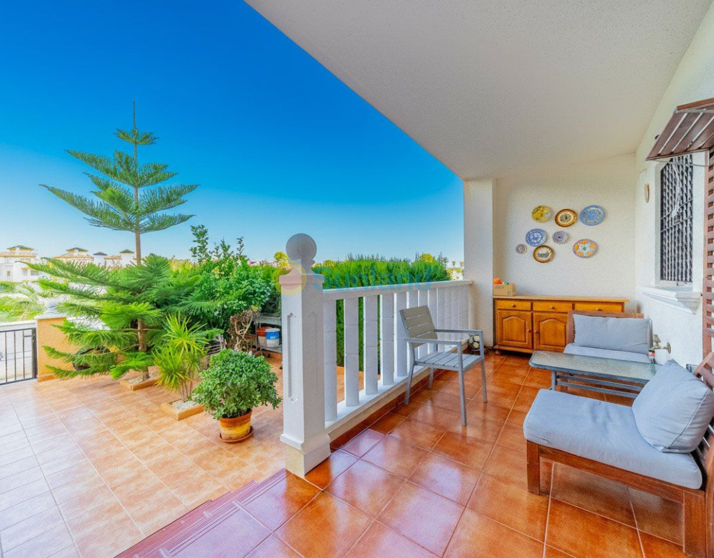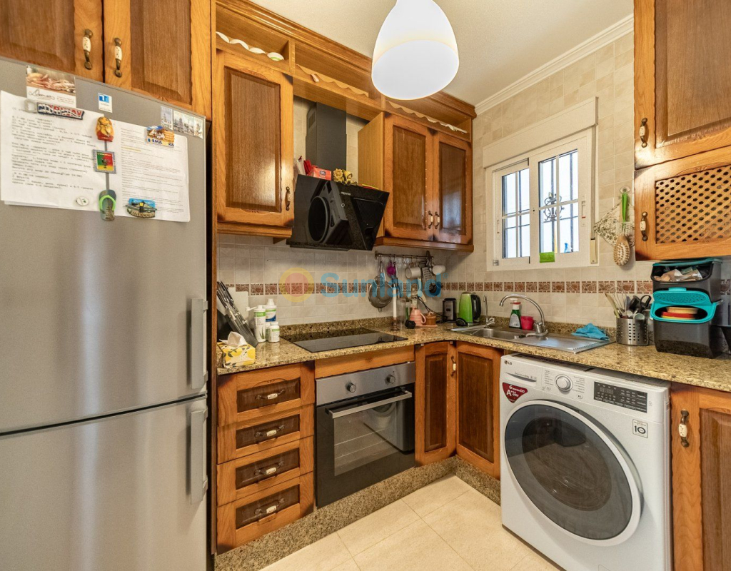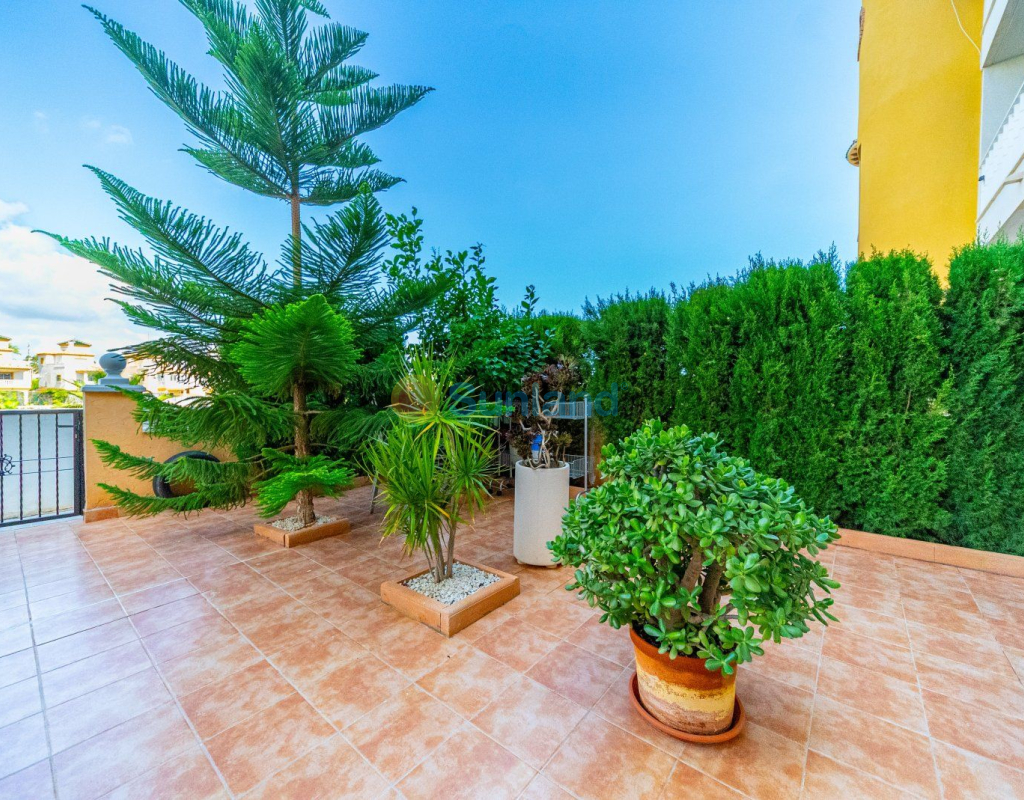 For sale: 2-bedroom bungalow with a 36 m² paved plot featuring a subtropical garden with canaries, located in a condominium with swimming pool and private parking. The bungalow is situated in the Lomas Cabo Roig area, on Castillo del Río street in Orihuela Costa, Alicante province, Spain. A quiet, picturesque location with views of the park and the sea. Nearby you will find the English supermarket Iceland, cafés and small shops. The bungalow offers 75 m² of built area, a 36 m² garden plot, an interior patio-laundry room of 19 m², and a 15 m² terrace at the entrance. Built in 2005. Layout: living room with separate kitchen and patio, 2 bedrooms and a full bathroom. For sale in excellent condition, no renovation needed, with furniture and household appliances