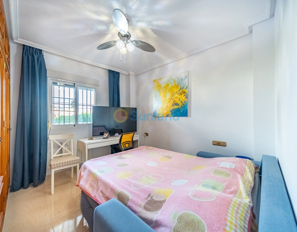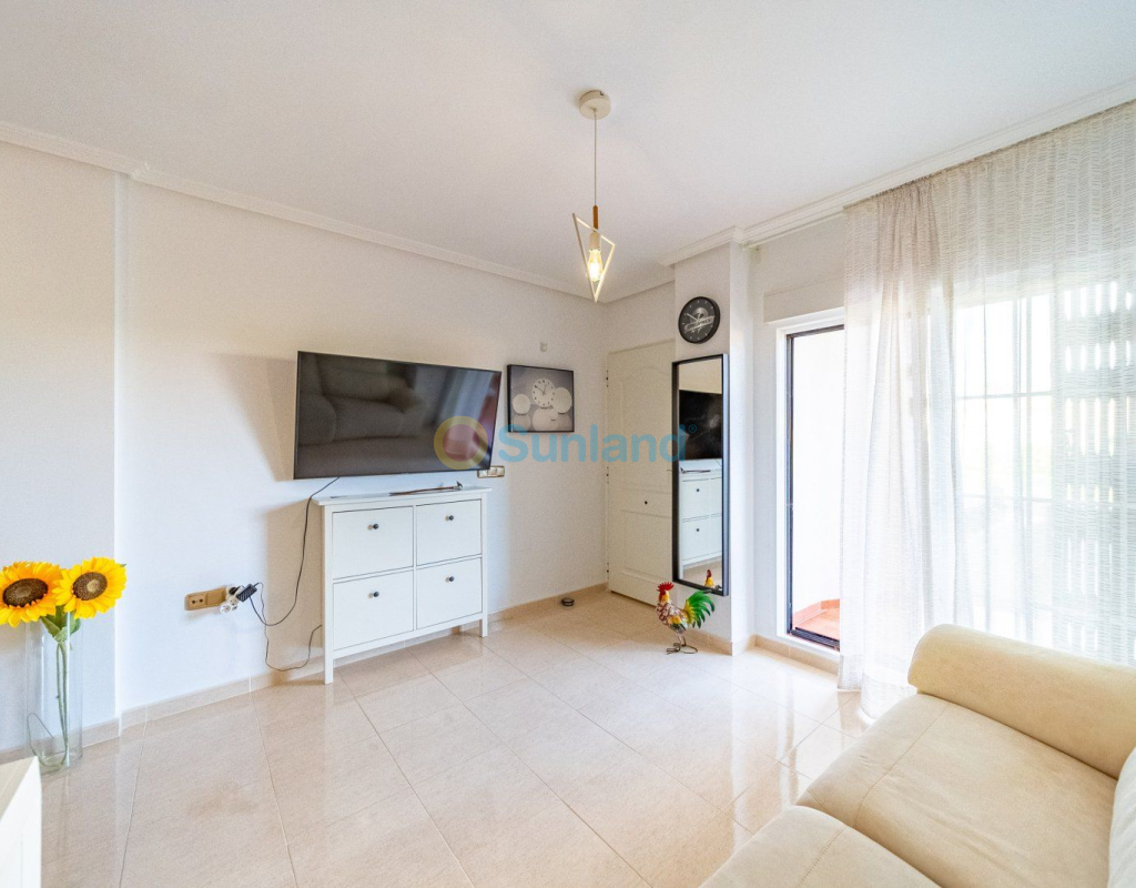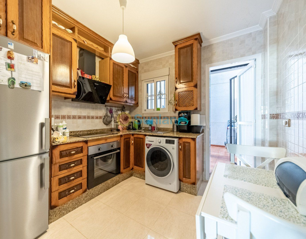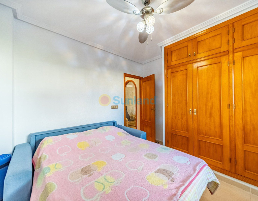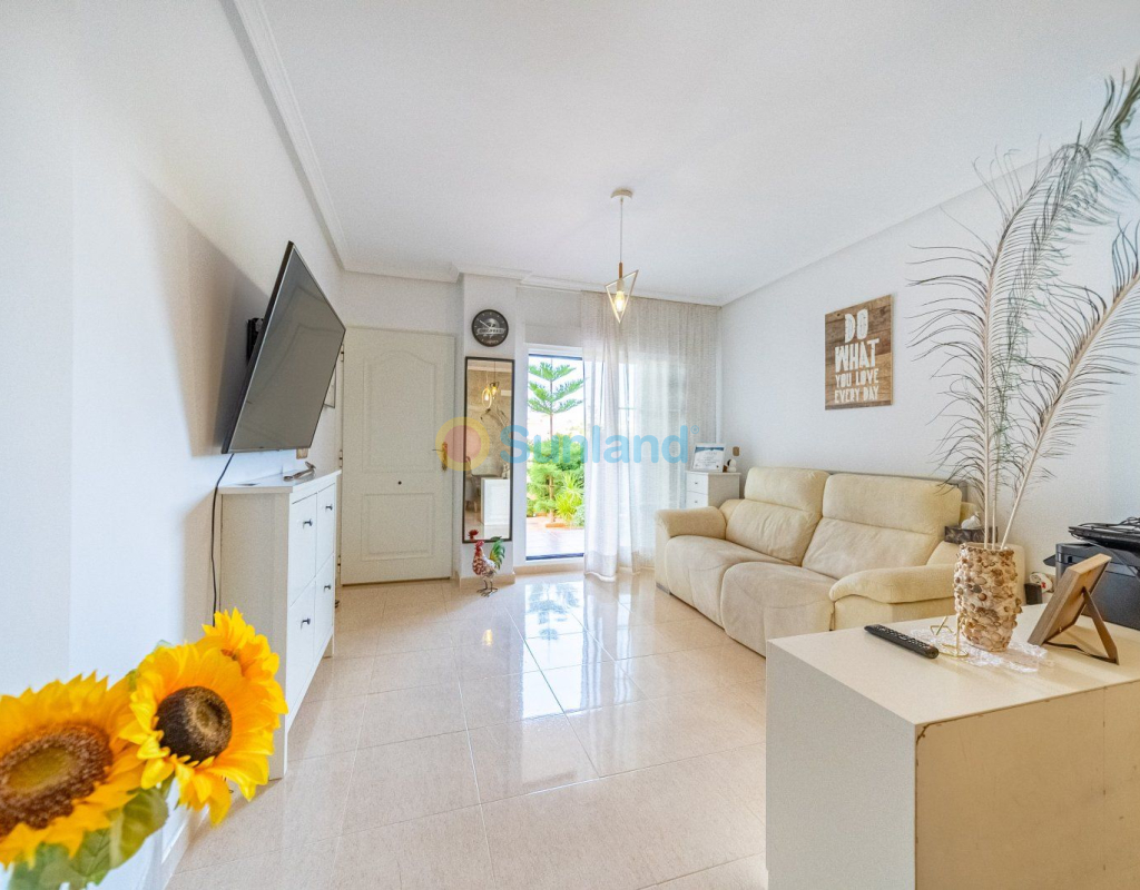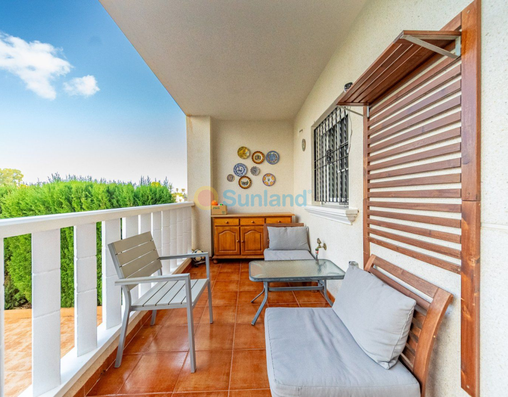 For sale: 2-bedroom bungalow with a 36 m² paved plot featuring a subtropical garden with canaries, located in a condominium with swimming pool and private parking. The bungalow is situated in the Lomas Cabo Roig area, on Castillo del Río street in Orihuela Costa, Alicante province, Spain. A quiet, picturesque location with views of the park and the sea. Nearby you will find the English supermarket Iceland, cafés and small shops. The bungalow offers 75 m² of built area, a 36 m² garden plot, an interior patio-laundry room of 19 m², and a 15 m² terrace at the entrance. Built in 2005. Layout: living room with separate kitchen and patio, 2 bedrooms and a full bathroom. For sale in excellent condition, no renovation needed, with furniture and household appliances