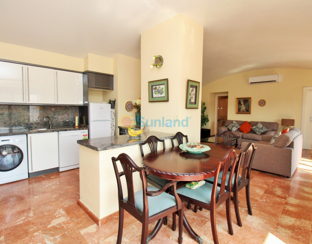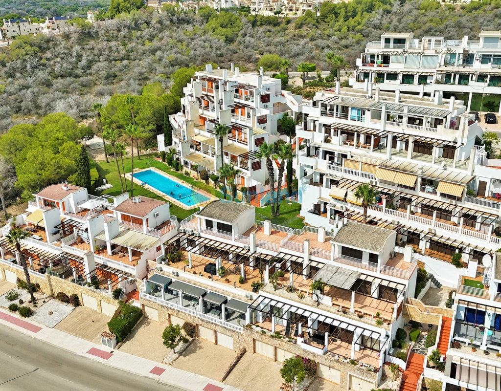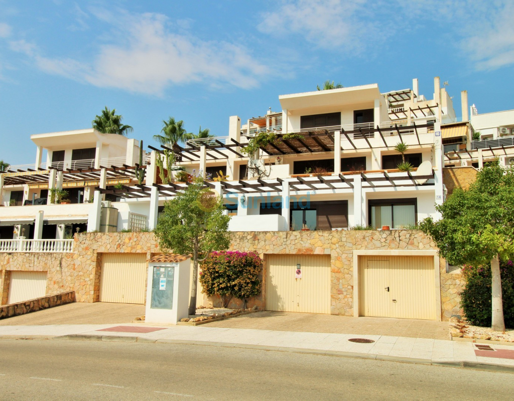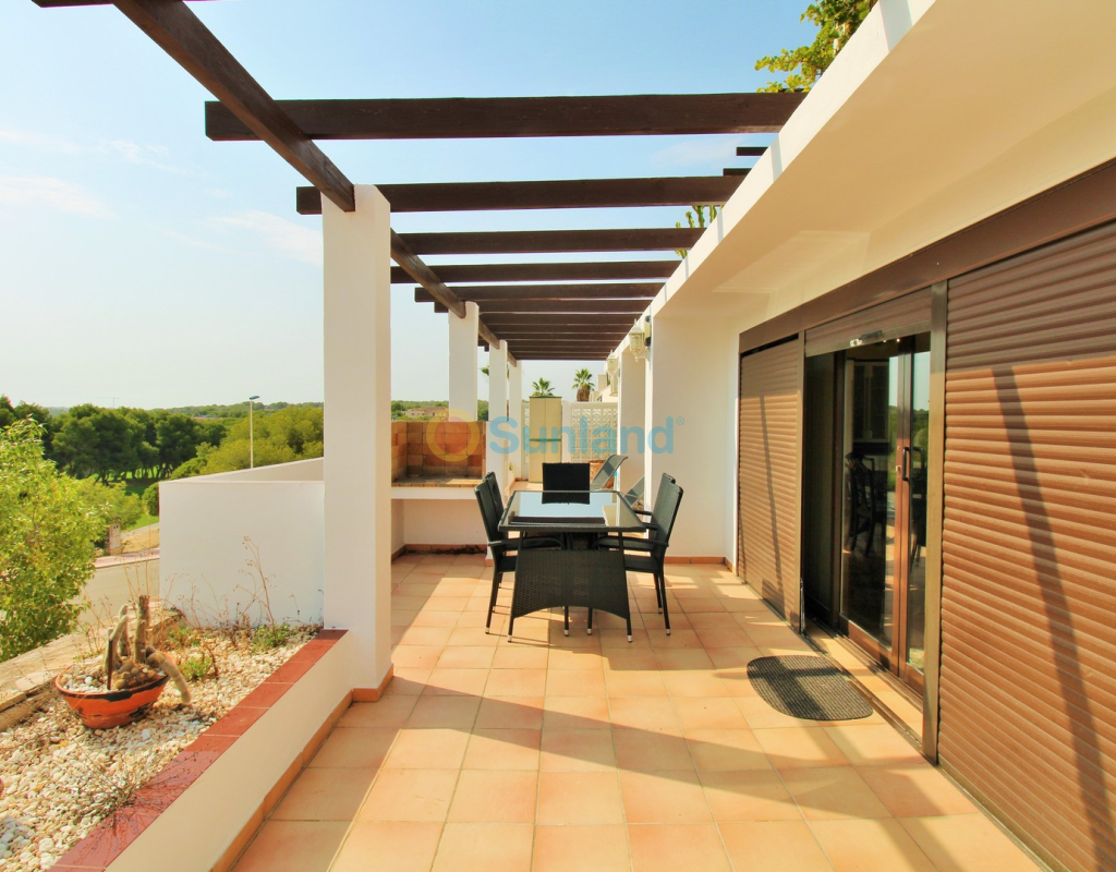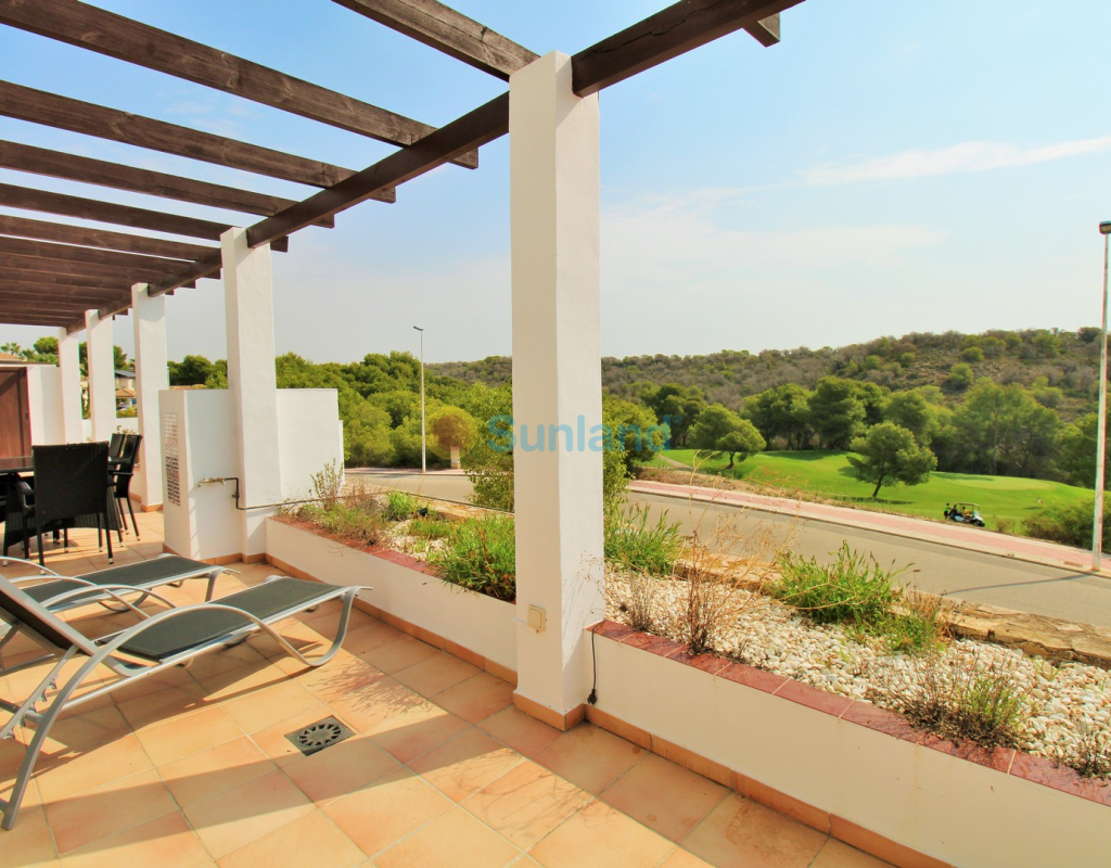 A rare opportunity to purchase a spectacular 2-bedroom apartment for sale in the prestigious Los Claveles complex within the Las Ramblas Golf Resort, just a short stroll from the popular La Fuente commercial centre. This impressive property offers generous living space and wonderful panoramic views over the golf course. The large front terrace spans the entire width of the apartment — perfect for outdoor dining or relaxing in the sun. Apartments of this quality and position rarely come to market, making early viewing essential. The interior comprises a bright and spacious lounge-dining area with an open-plan American-style kitchen, two double bedrooms with fitted wardrobes, and a family bathroom. The master bedroom benefits from an en-suite with a walk-in shower and direct access to the terrace. At street level, the property includes a private garage with an additional bedroom and en-suite bathroom — ideal for guests or as a hobby room. Residents enjoy access to a beautifully maintained communal pool and garden areas. The property is sold fully furnished with white goods and air-conditioning, ready to move into. An exceptional home in one of Las Ramblas’ most sought-after locations — equally suited as a permanent residence, holiday retreat, or investment.
