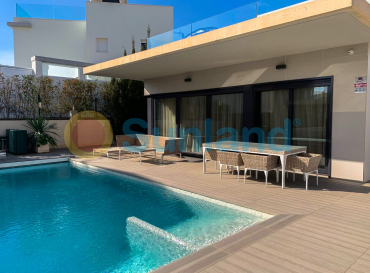 NEW BUILD VILLA IN ORIHUELA COSTA (CAMPOAMOR) Do you want to enjoy an exclusive vacation near the sea? Impossible not to fall for this ultra-modern villa in Orihuela Costa with 4 bedrooms, 2 bathrooms, private pool, garden and luxury extras, according to personal preferences. Its delicate infrastructure integrates with nature providing a quiet and isolated environment. Built with the highest quality materials, this elegant property is surrounded by abundant vegetation and a few meters from the cleanest beaches in Campoamor: Playa de la Glea, Aguamarina and Cabo Roig. It is a pleasure to have these three beautiful beaches that have been awarded with the Blue Flag within reach. Whenever you need a moment of reflection, you can go down to touch its crystal clear waters or lie down on its soft sand to read a book while listening to the placid sound of the sea. In the surroundings you will find all the essential services to live all year round: supermarkets, pharmacies, cafes, restaurants, shopping centers ... And if you are also enthusiastic about golf, less than 10 minutes away you can choose between three privileged golf courses of international recognition where put your aim to the test: Las Colinas Golf, Villamartín or Las Ramblas. The promotion includes several models of homes with 2,3,4 and up to 5 bedrooms. This particular villa consists of 4 double bedrooms, 2 bathrooms, a fully equipped American kitchen, an open living-dining room with great lighting, access to the garden and the beautiful pool. In addition, the price includes: Underfloor heating and mirror in bathrooms Indoor and outdoor lights Built-in wardrobes Security door Pre-installation of air conditioning Top brand appliances The house follows the trend of open concept design, enhancing spacious spaces and offering a greater sense of comfort and well-being in its interiors.