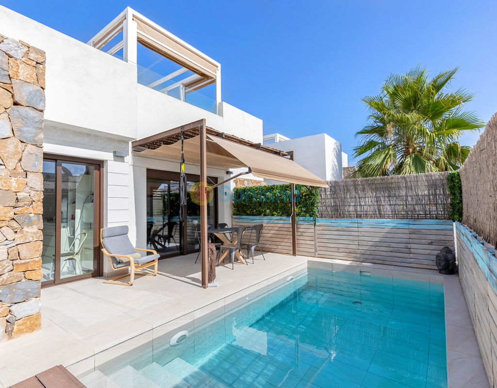 Villa moderne à Lomas de Cabo Roig, Orihuela Costa. La maison a été construite sur un seul étage et est située en coin. La propriété dispose d'un salon-salle à manger, d'une cuisine américaine, de 2 chambres et de 2 salles de bains (dont une en suite). Il dispose également d'une piscine privée, d'un jardin et d'un solarium privé de 35 m2. La villa est vendue partiellement meublée. Il est situé à proximité de tous les services tels que supermarchés et magasins. 15 minutes à pied de la plage de Campoamor.