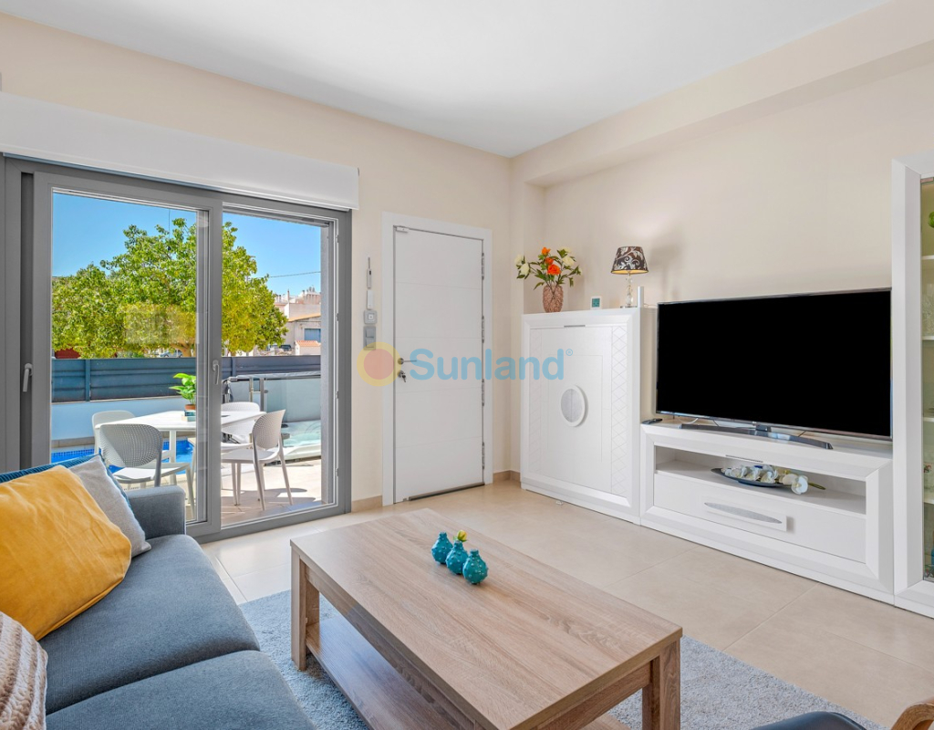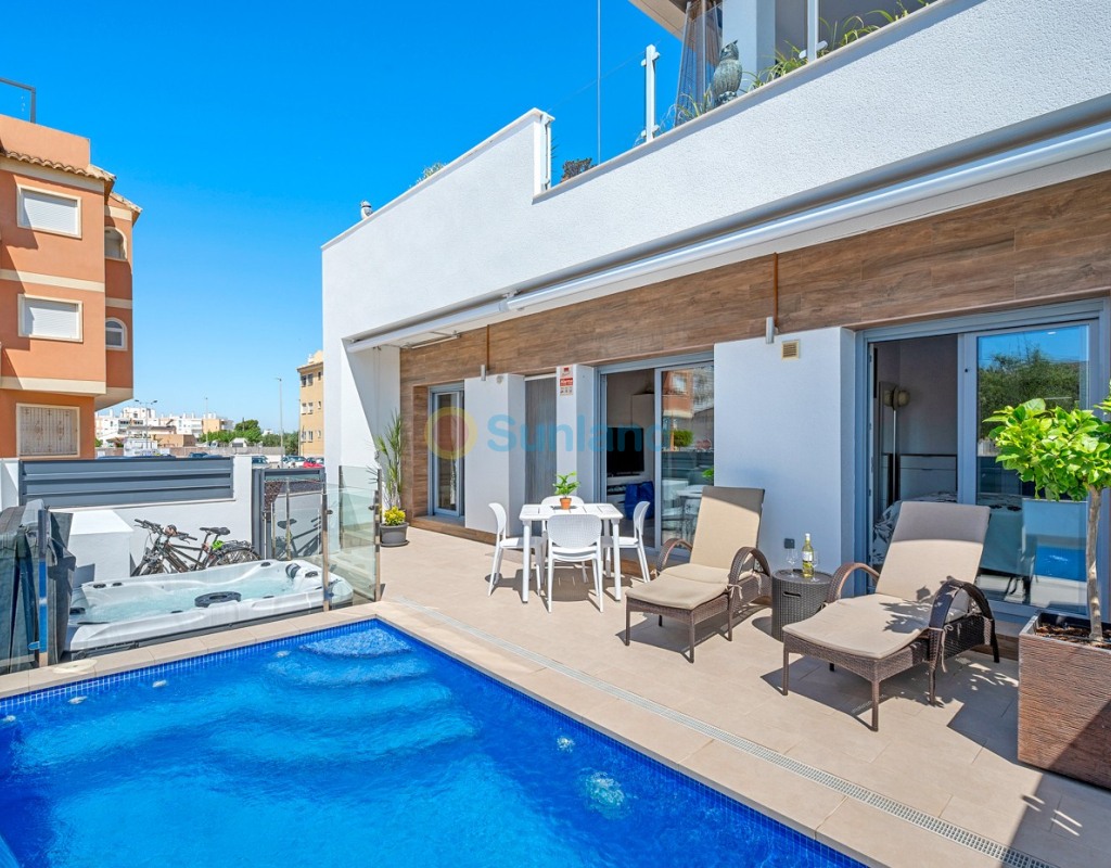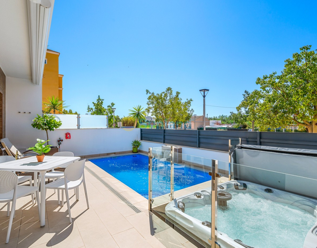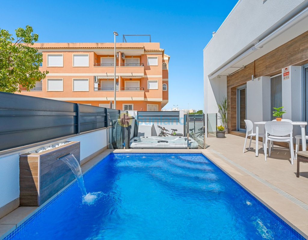Située au cœur du charmant et authentique village espagnol de Formentera del Segura, cette maison de ville soigneusement entretenue allie confort moderne et atmosphère traditionnelle. Construite en 2018, elle fait partie d’une petite communauté exclusive de seulement quatre logements. C’est la première revente dans cette résidence, une opportunité rare et précieuse. La propriété offre trois chambres spacieuses et deux salles de bains élégantes, dont une en suite. Deux chambres se trouvent au rez-de-chaussée, rendant la maison pratique et confortable à vivre toute l’année. L’intérieur est décoré avec goût et meublé avec des pièces de haute qualité — tout est inclus dans la vente. Une véritable maison clé en main, en excellent état. À l’extérieur, vous profiterez d’une piscine privée avec cascade ainsi que d’un jacuzzi privé — l’endroit idéal pour se détendre. Le toit-terrasse offre un grand potentiel : il est déjà préparé pour l’ajout d’une troisième salle de bains privée, avec les raccordements d’eau et d’électricité en place. Avec des stores intégrés, des panneaux de confidentialité et un espace lounge couvert, la terrasse est parfaite pour recevoir ou profiter de la vue imprenable. La maison est équipée de : Système de filtration d’eau pour toute la maison (eau potable directement au robinet) Climatisation centrale au rez-de-chaussée et unité séparée à l’étage Excellente ventilation, sans problèmes d’humidité Internet fibre avec couverture jusque sur la terrasse — idéal pour télétravailler Vendue entièrement meublée. Formentera del Segura offre une communauté internationale accueillante, tout en conservant son authenticité espagnole. Cafés, boulangeries et restaurants se trouvent à quelques minutes à pied, le supermarché le plus proche est à seulement deux minutes. L’école norvégienne est à 8 minutes en voiture, et les plages dorées de Guardamar del Segura à seulement 10 minutes. Plusieurs parcours de golf, pistes cyclables et parcs naturels complètent l’environnement. Une maison vraiment spéciale dans un emplacement exceptionnel — parfaite pour ceux qui recherchent confort, style et qualité de vie sur la Costa Blanca.