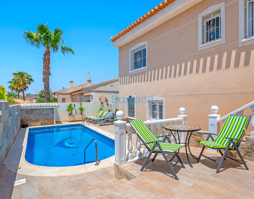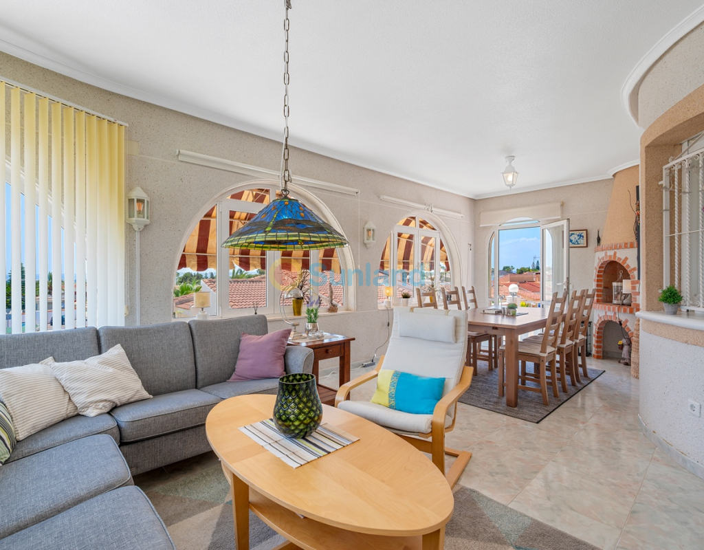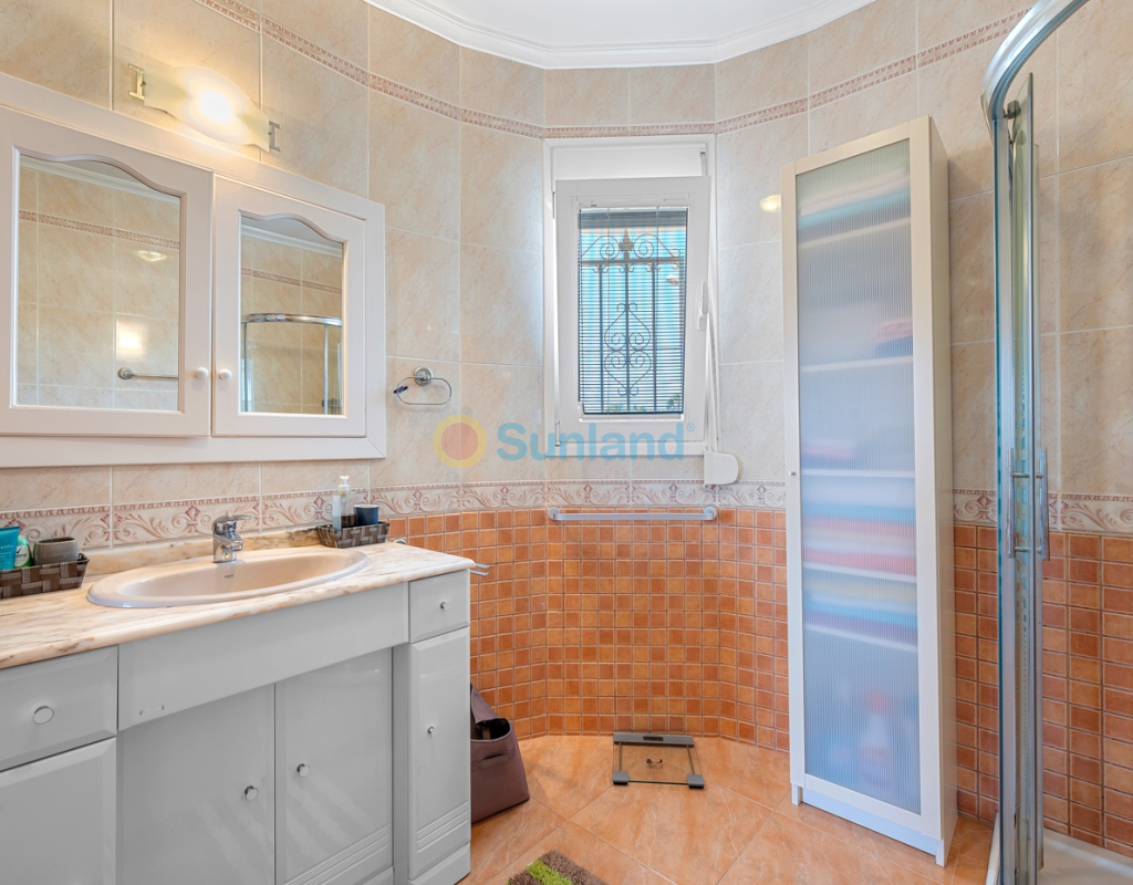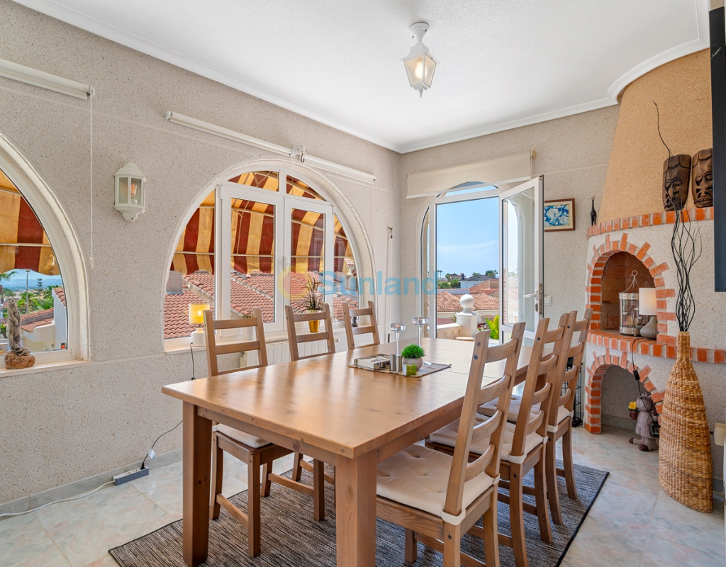 Charmante villa de style méditerranéen avec 3 chambres, située à proximité du centre de Ciudad Quesada. La villa dispose d’une surface habitable totale de 238 m² répartie sur deux niveaux : l’étage principal et un appartement indépendant au rez-de-chaussée. L’étage principal comprend deux chambres doubles et deux salles de bains, dont une attenante à la chambre parentale. On y trouve également une entrée, une cuisine ouverte, un séjour avec cheminée, une salle à manger, ainsi qu’une véranda aménagée en salon et salle à manger supplémentaire. À l’entrée de la villa se trouve une terrasse couverte et depuis la véranda, vous accédez directement à l’espace piscine. Au rez-de-chaussée se situe un appartement d’invités indépendant composé d’un salon, d’une cuisine, d’une grande chambre et d’une salle de bains. La villa est équipée du chauffage central (au gaz), de la climatisation, d’une cheminée dans le séjour, d’un système d’alarme et d’un filtre à osmose. Espace extérieurLa villa est implantée sur un terrain orienté plein sud de 500 m². Le jardin est bien entretenu avec carrelage et végétation. Vous y trouverez une piscine au sel, une douche extérieure, un carport, un espace barbecue, un débarras et plusieurs espaces de détente. Le jardin dispose d’un système d’arrosage automatique. La villa est située à seulement quelques minutes à pied de la rue principale de Ciudad Quesada où vous trouverez de nombreux services.