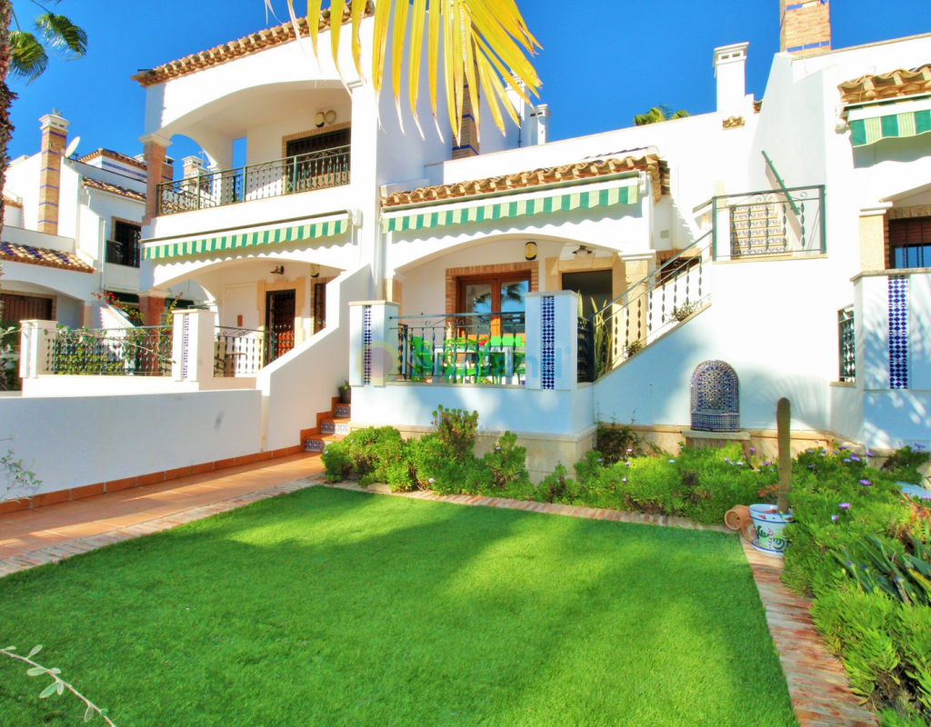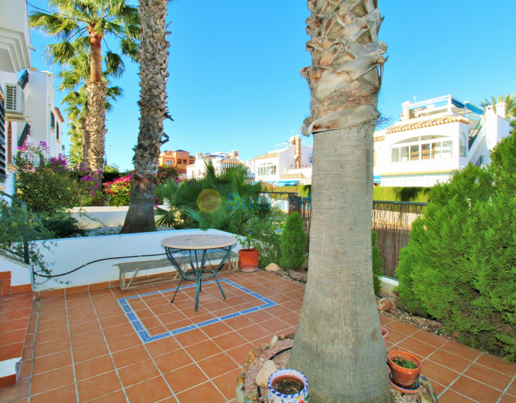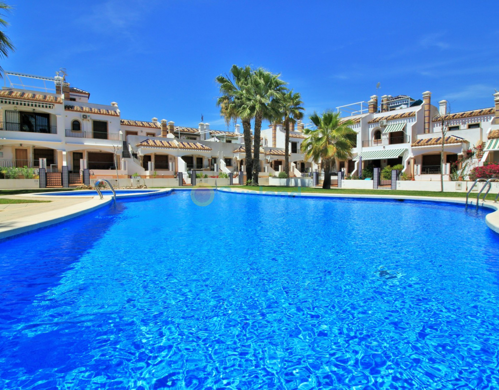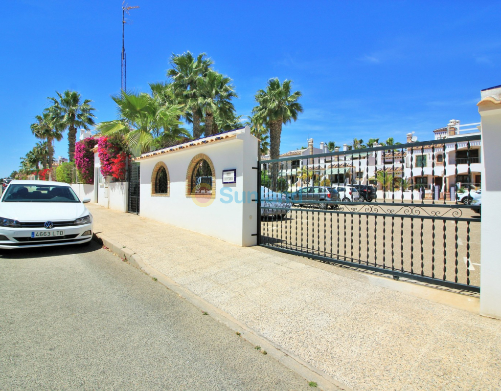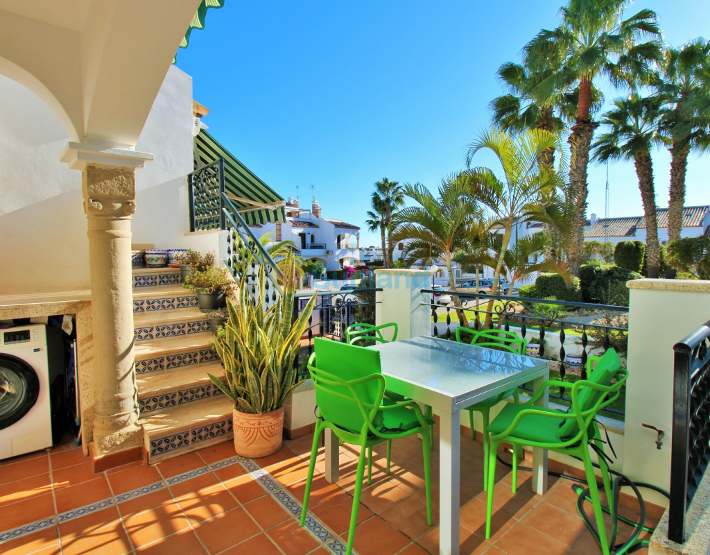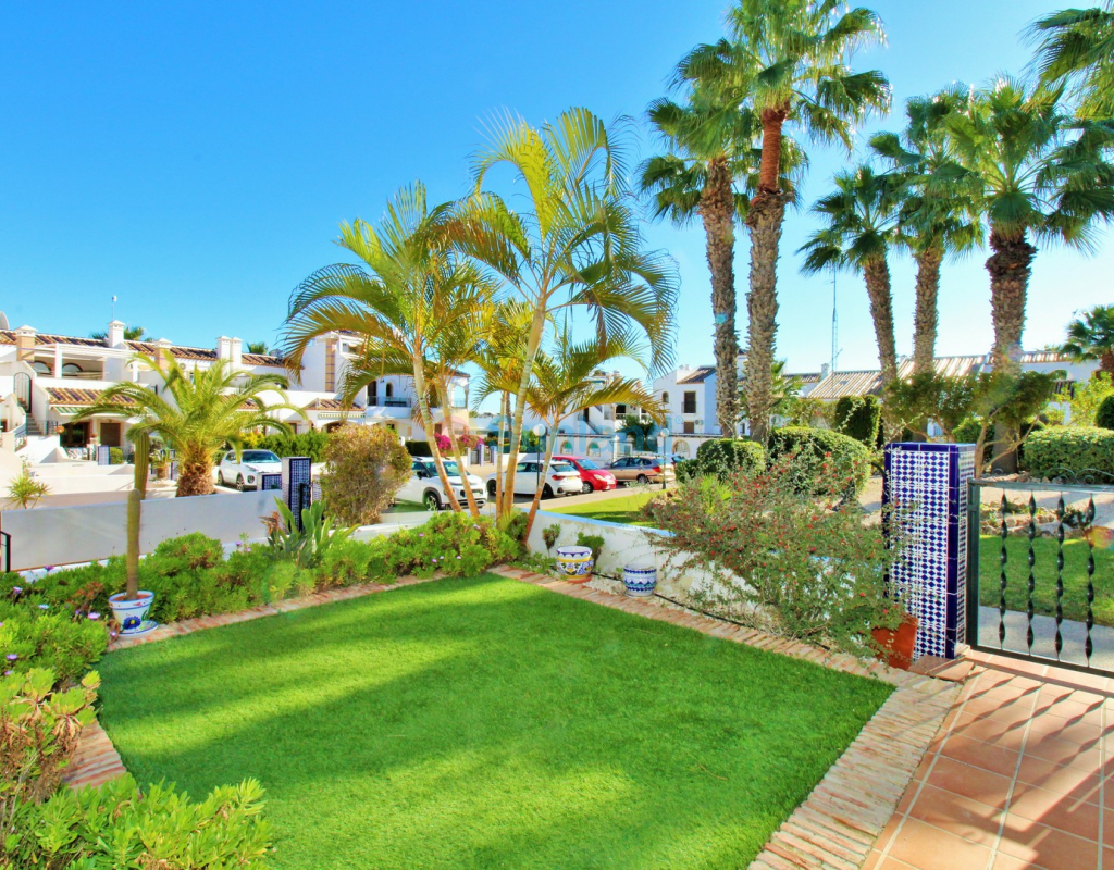 Verbeterde bungalow in Lola-stijl te koop in de zeer gewilde, afgesloten residentie R9 in Pau 8, Villamartin. Zorgvuldig onderhouden door dezelfde eigenaar sinds nieuw, met een toplocatie op slechts 10 minuten lopen van Villamartin Plaza en de Villamartin golfbaan, omgeven door restaurants, bars en voorzieningen. De gemeenschap is goed onderhouden met een gemeenschappelijk zwembad, gemeenschappelijke parkeerplaatsen, en zal volledig opnieuw worden geschilderd vóór eind Q2 2026. De woning beschikt over een voor- en achtertuin, plus een vergroot verhoogd voorterras met uitzicht op het groen. Binnen bevindt zich een lichte woon-/eetkamer, een gerenoveerde volledig uitgeruste keuken, en twee tweepersoonsslaapkamers met inbouwkasten. De master bedroom heeft een en-suite badkamer met inloopdouche en directe toegang tot de achtertuin. De tweede slaapkamer is verbeterd met openslaande terrasdeuren naar een Juliet-stijl terrasje met trap naar de achtertuin en extra bergruimte eronder. Externe trappen leiden naar het privé dakterras, waar een extra gastenannex is toegevoegd met slaapkamer en en-suite badkamer. Wordt verkocht gemeubileerd, inclusief apparatuur, airconditioning, centrale verwarming en aardgas. Een fantastische kans — vroeg bezichtigen aanbevolen.
