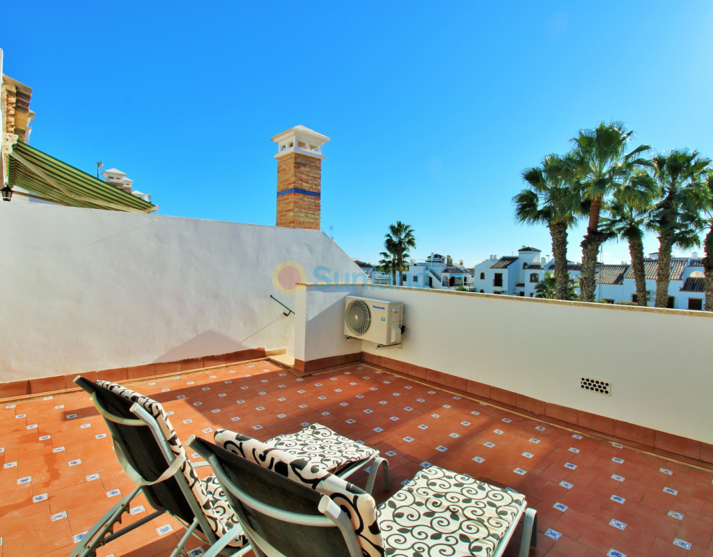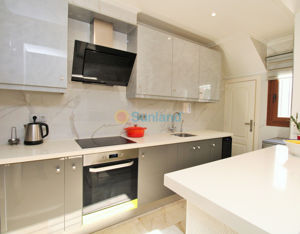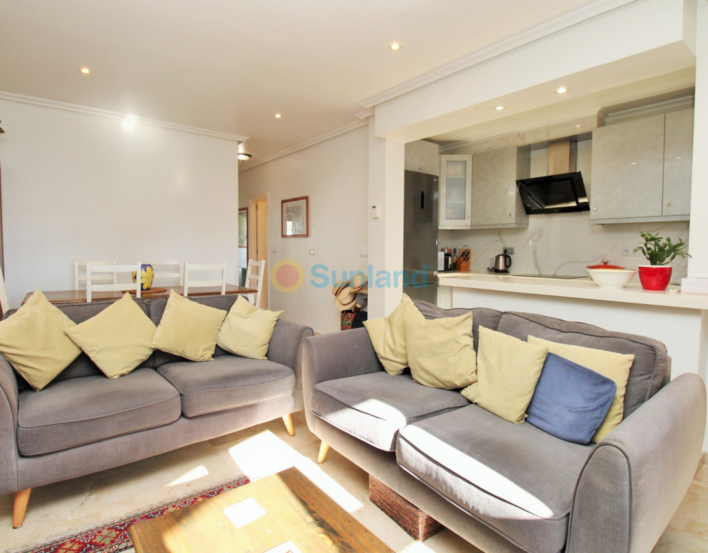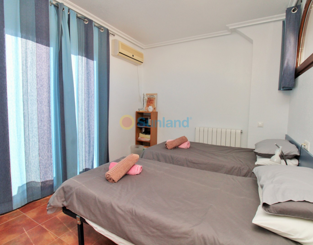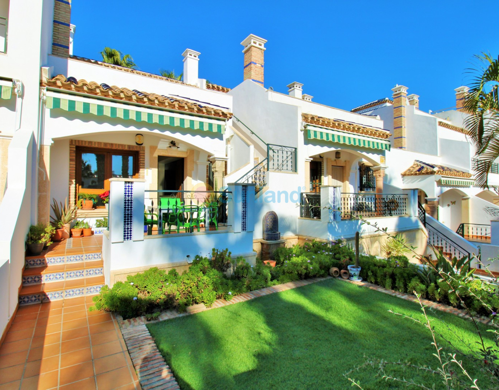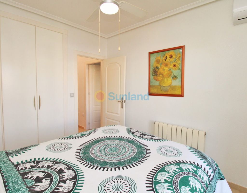 Verbeterde bungalow in Lola-stijl te koop in de zeer gewilde, afgesloten residentie R9 in Pau 8, Villamartin. Zorgvuldig onderhouden door dezelfde eigenaar sinds nieuw, met een toplocatie op slechts 10 minuten lopen van Villamartin Plaza en de Villamartin golfbaan, omgeven door restaurants, bars en voorzieningen. De gemeenschap is goed onderhouden met een gemeenschappelijk zwembad, gemeenschappelijke parkeerplaatsen, en zal volledig opnieuw worden geschilderd vóór eind Q2 2026. De woning beschikt over een voor- en achtertuin, plus een vergroot verhoogd voorterras met uitzicht op het groen. Binnen bevindt zich een lichte woon-/eetkamer, een gerenoveerde volledig uitgeruste keuken, en twee tweepersoonsslaapkamers met inbouwkasten. De master bedroom heeft een en-suite badkamer met inloopdouche en directe toegang tot de achtertuin. De tweede slaapkamer is verbeterd met openslaande terrasdeuren naar een Juliet-stijl terrasje met trap naar de achtertuin en extra bergruimte eronder. Externe trappen leiden naar het privé dakterras, waar een extra gastenannex is toegevoegd met slaapkamer en en-suite badkamer. Wordt verkocht gemeubileerd, inclusief apparatuur, airconditioning, centrale verwarming en aardgas. Een fantastische kans — vroeg bezichtigen aanbevolen.