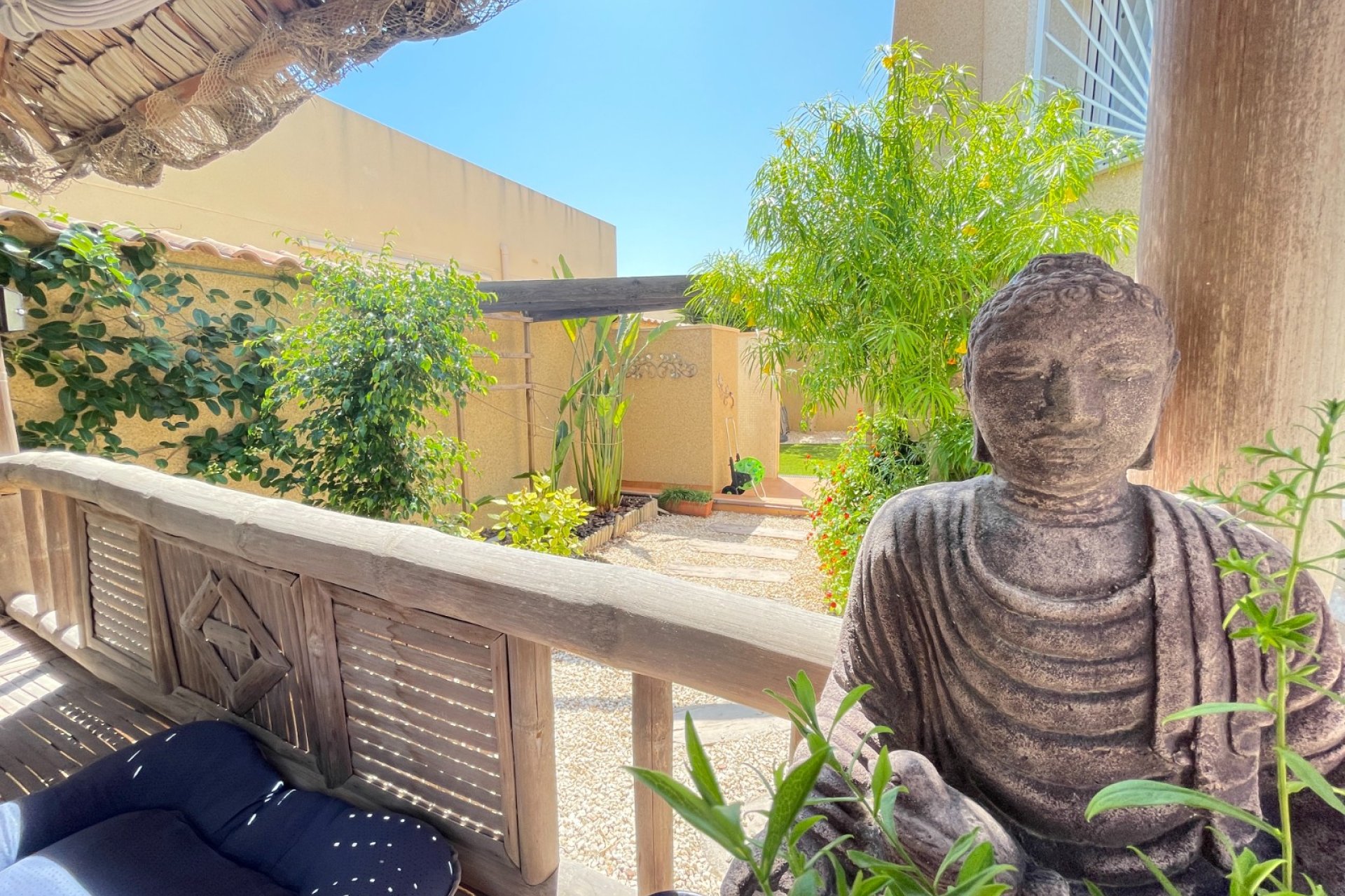 På en hjørnetomt omgitt av frodige planter finner du denne eiendommen med en vakker hage og en koselig bambuspaviljong. Tomten har rikelig plass til bobil, campingvogn eller tilhenger med familiebil – eller, om du ønsker, til å bygge ditt eget private svømmebasseng.