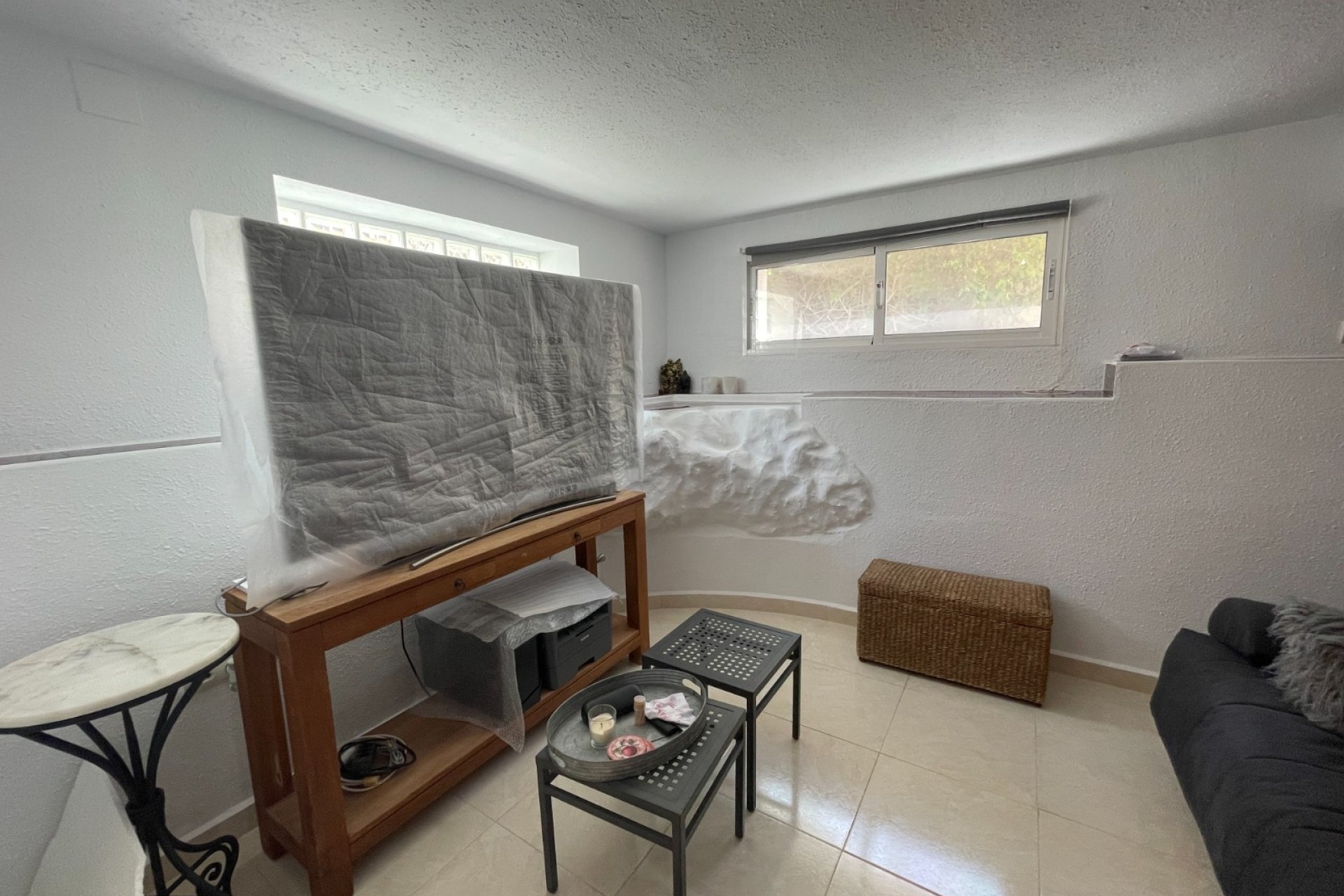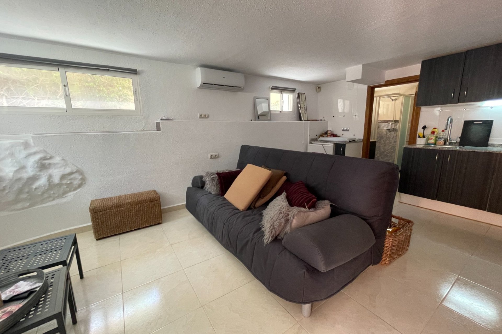 Som et ekstra pluss har eiendommen en selvstendig studioleilighet på 64 m², fullt møblert, med åpen kjøkkenløsning, bad og privat inngang. Foldedørene gjør det enkelt å dele opp rommet, noe som gjør det perfekt for gjester, voksne barn, familie, eller som treningsrom eller kontor.
