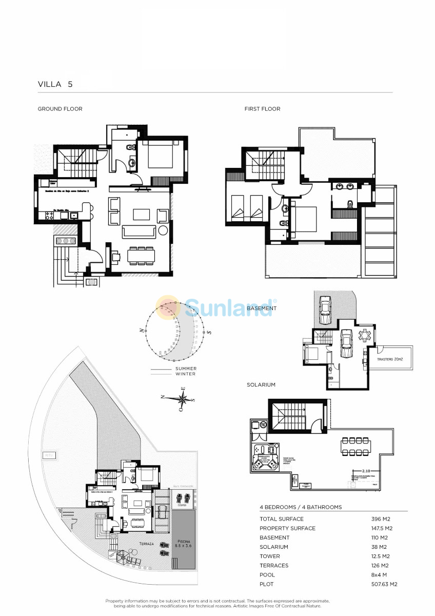 Fastigheten erbjuder 4 sovrum och 4 badrum, ett rymligt vardagsrum med öppet kök, privat trädgård med pool (8x4 m), privat garage och en färdig källare på 110 m².