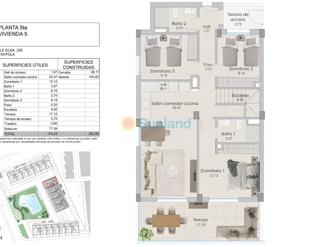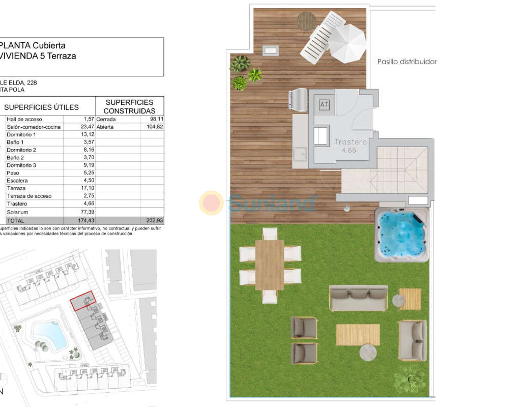 NYBYGD BOLIGKOMPLEKS I SANTA POLA Moderne inngjerdet boligkompleks bestående av 3 boligblokker med store anlagte fellesområder, inkludert et svømmebasseng med vannsenger, lekeplass, pergola og sykkelparkering. Boligen har leiligheter med 3 og 2 soverom, begge typer inkluderer 2 komplette bad, åpen kjøkkenløsning med stue, garderober, terrasse, parkeringsplass. De har en felles hage, svømmebasseng med strandinngang, utstyrt med dusjer og en stor pergola i tre. Det har anlagte områder med palmer og vegetasjon, som alle er opplyst. I den sentrale delen av bassenget er det et grunnere område der vannsengene ligger. Santa Pola kommune ligger på den populære Costa Blanca ved Middelhavet, sør for Alicante og i Bajo Vinalopó-regionen. Byen har en misunnelsesverdig geografisk beliggenhet, omgitt av naturlandskap og med et spesielt mikroklima som gir et mildt klima året rundt. Byens sentrum er avgrenset av festningen og havnen i øst og vest, og grenser til naturparken Santa Pola Salinas og Sierra og Cabo de Santa Pola, et gammelt rev som i dag kjennetegnes av sine løvrike furutrær. Santa Pola ligger 21 km. fra Alicante, provinshovedstaden med utmerket infrastruktur og 15 km. fra den internasjonale flyplassen "Elche-Alicante".