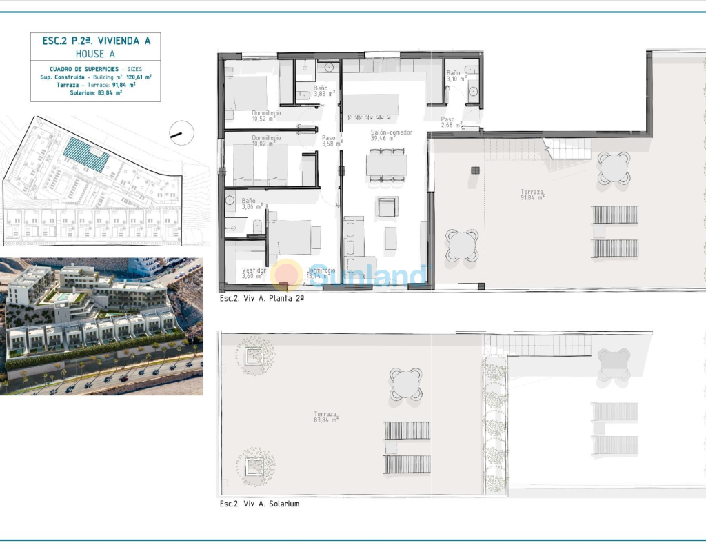 NYBYGD BOLIGKOMPLEKS I AGUILAS Nybygget eksklusivt boligkompleks med leiligheter og villaer i Aguilas. Nybyggkomplekset består av 36 leiligheter med 3 og 2 soverom fordelt på 4 moderne blokker, utstyrt med 2 felles svømmebassenger og felles garasje med parkeringsplass og bod for hver eiendom; og 10 elegante villaer med 4 soverom og 3 bad, alle med eget privat basseng. Dette boligkomplekset er designet med tanke på kvalitet og tilbyr romslige terrasser i første og andre etasje og solarium i de øverste etasjene, der utsikten mot horisonten blir et lerret av opplevelser. Husene har fullt utstyrte kjøkken og bad og forhåndsinstallasjon for kanalisert klimaanlegg. Komplekset ligger 800 meter fra sjøen, ved siden av et kjøpesenter. Aguilas ligger i et eksepsjonelt område på Costa Cálida, bare 50 minutter fra den nye Murcia eller Almeria flyplass og 1.30 fra Alicante flyplass. Aguilas er en liten by med mange fasiliteter, en lang strand for å gå og slappe av i solen. Det er en perfekt enklave for dykking, vannsport, fotturer og golf. Den har 28 kilometer kystlinje, der det er 35 strender med forskjellige typer sandtykkelse som ligger i forskjellige landskap, fra viker og jomfruelige strender i naturlige omgivelser til de urbane strendene i byen Aguilas. Det varme ørkenklimaet hersker året rundt, med et årlig gjennomsnitt på 22 ºC, med milde temperaturer om vinteren og svært varmt om sommeren.