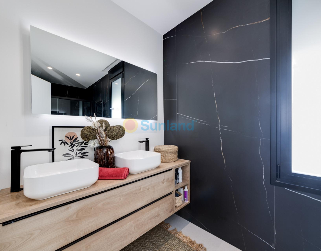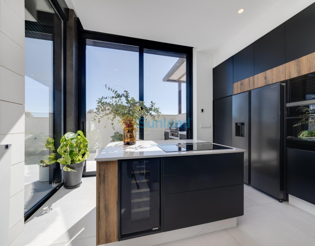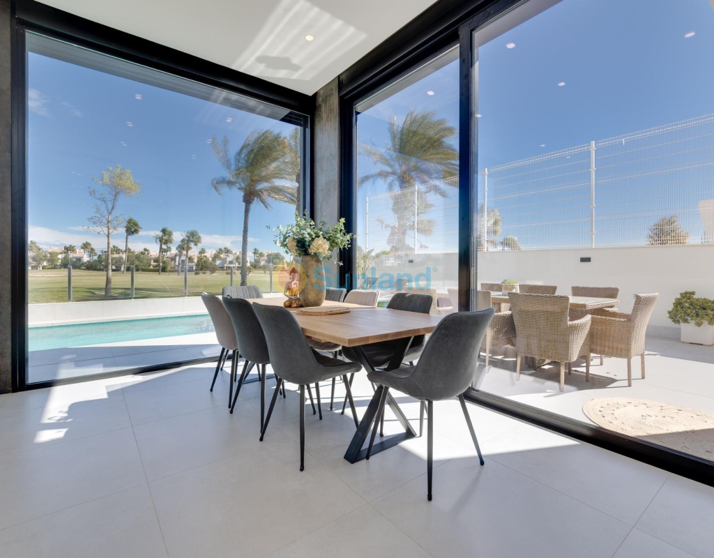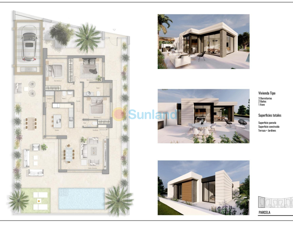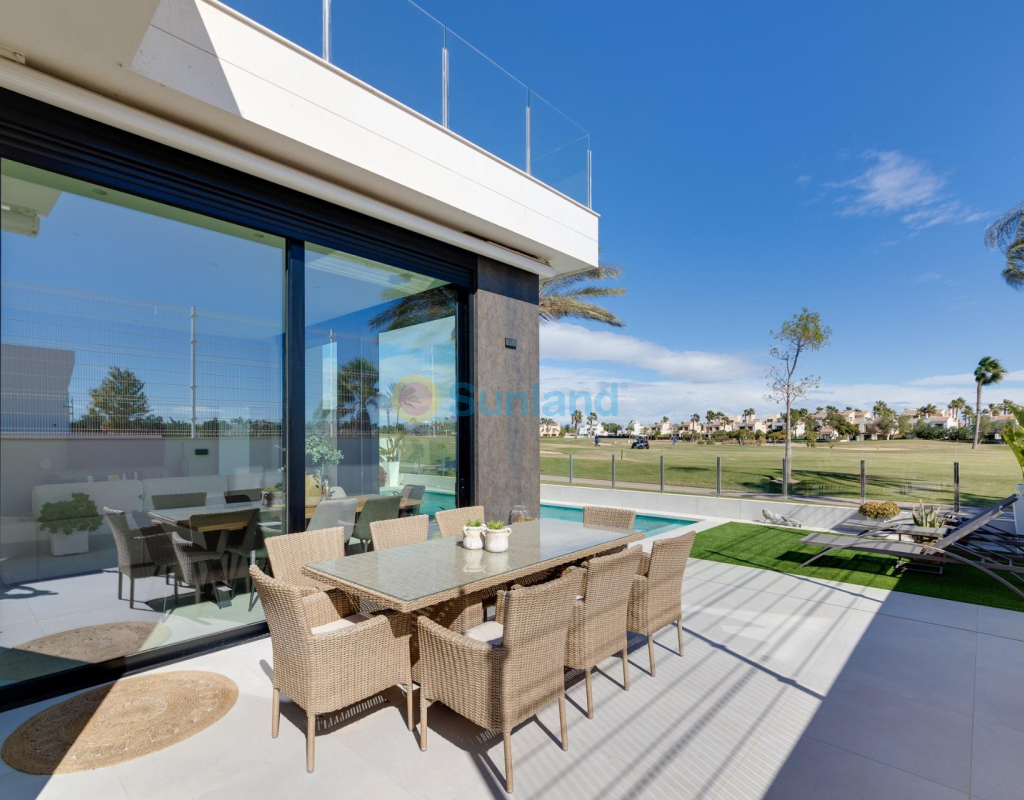 NYBYGDE VILLAER I PILAR DE LA HORADADA PÅ GOLFBANEN Nybygget boligområde med 6 frittliggende villaer i Pilar de la Horadada. Nybygde villaer på ett plan har 3 soverom, 2 bad, gjestetoalett, åpen kjøkkenløsning med stue, garderober, privat hage med privat basseng og parkeringsplass utenfor veien. Pilar de la Horadada er den sørligste byen og kommunen på Costa Blanca i provinsen Alicante. Byen ligger på grensen mellom Comunidad Valenciana og Murcia-regionen. Pilar de la Horadada er en typisk spansk by som ligger bare 2 km fra kysten og de populære strendene i Torre de la Horadada. I sentrum av Pilar de la Horadada finner du alle fasiliteter: butikker, konditorier, banker osv. langs hovedgaten "Calle Mayor". Du vil også oppleve en herlig atmosfære i nærheten av den lokale kirken på "Plaza de la Iglesia", hvor det er flere kafeer. I Pilar de la Horadada er det også et velutviklet sykkel- og turstienettverk, og det er også et stort tilbud av ulike sportsaktiviteter. Lo Romero 18-hulls golfbane ligger bare en kort kjøretur fra byen. Flyplassene i Corvera (Murcia) og Alicante ligger henholdsvis 40 og 55 minutter unna.
