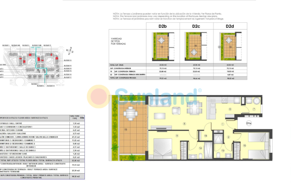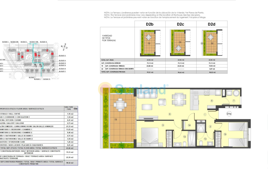 Leiligheter med 1, 2 og 3 soverom, 1 eller 2 bad. Du har muligheter i første etasje med store hager, mellomgulv med store terrasser og tredje etasje med solarium.