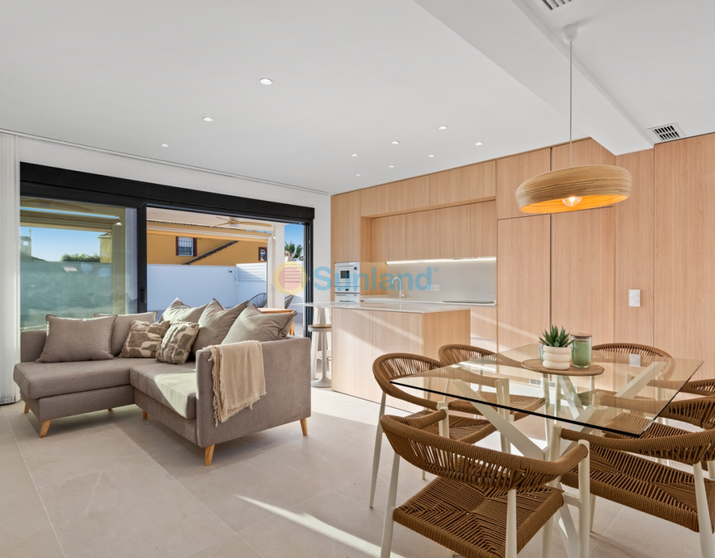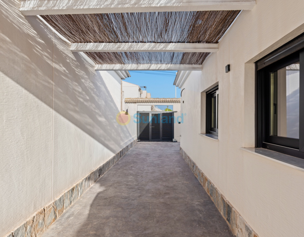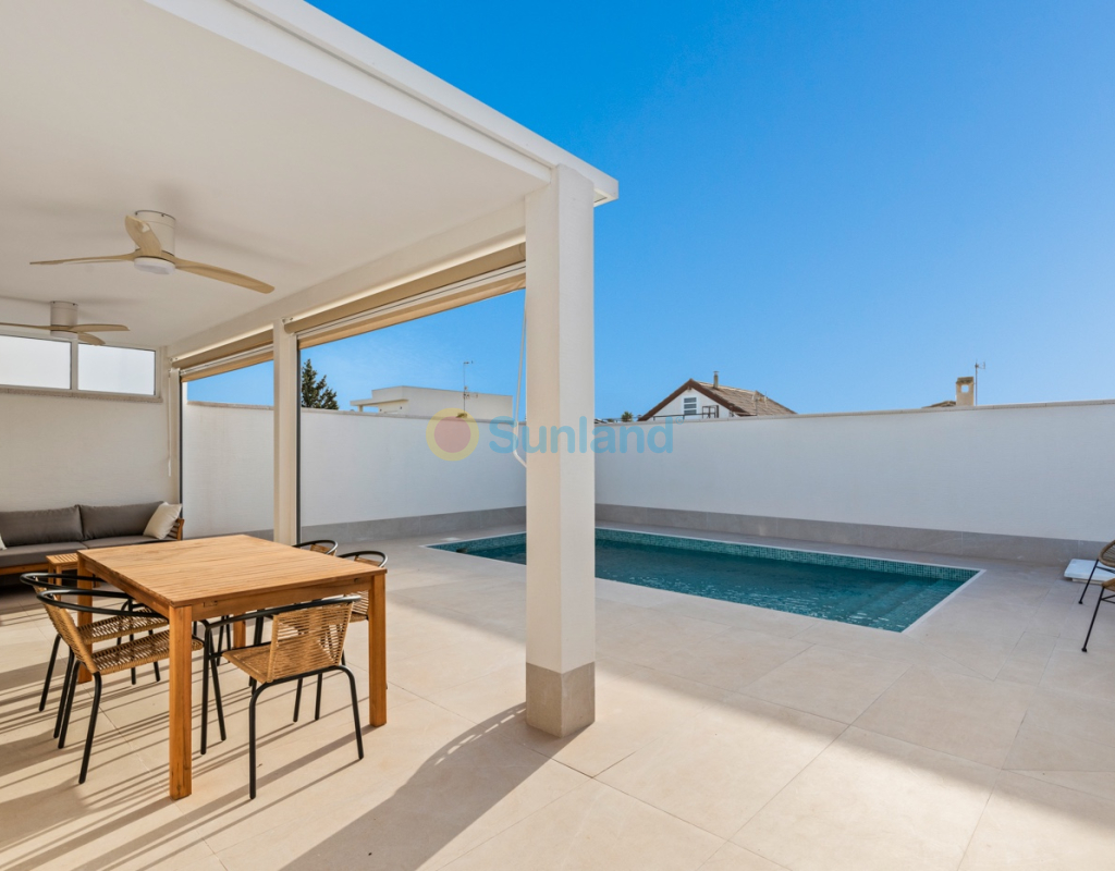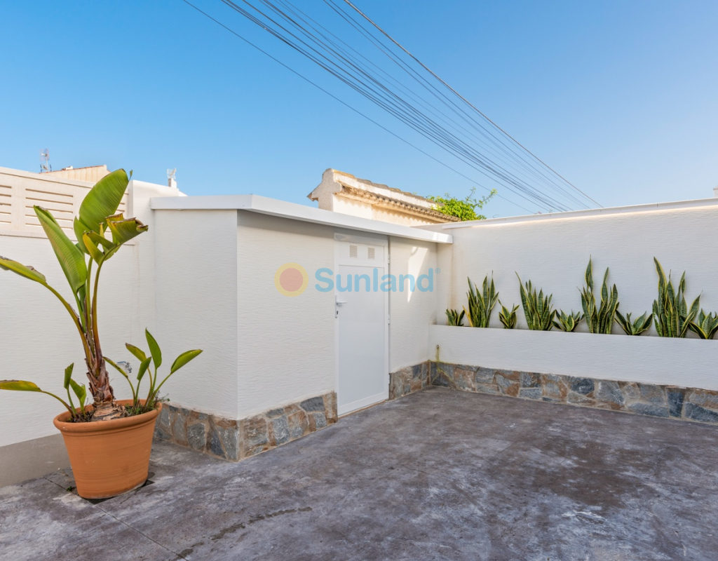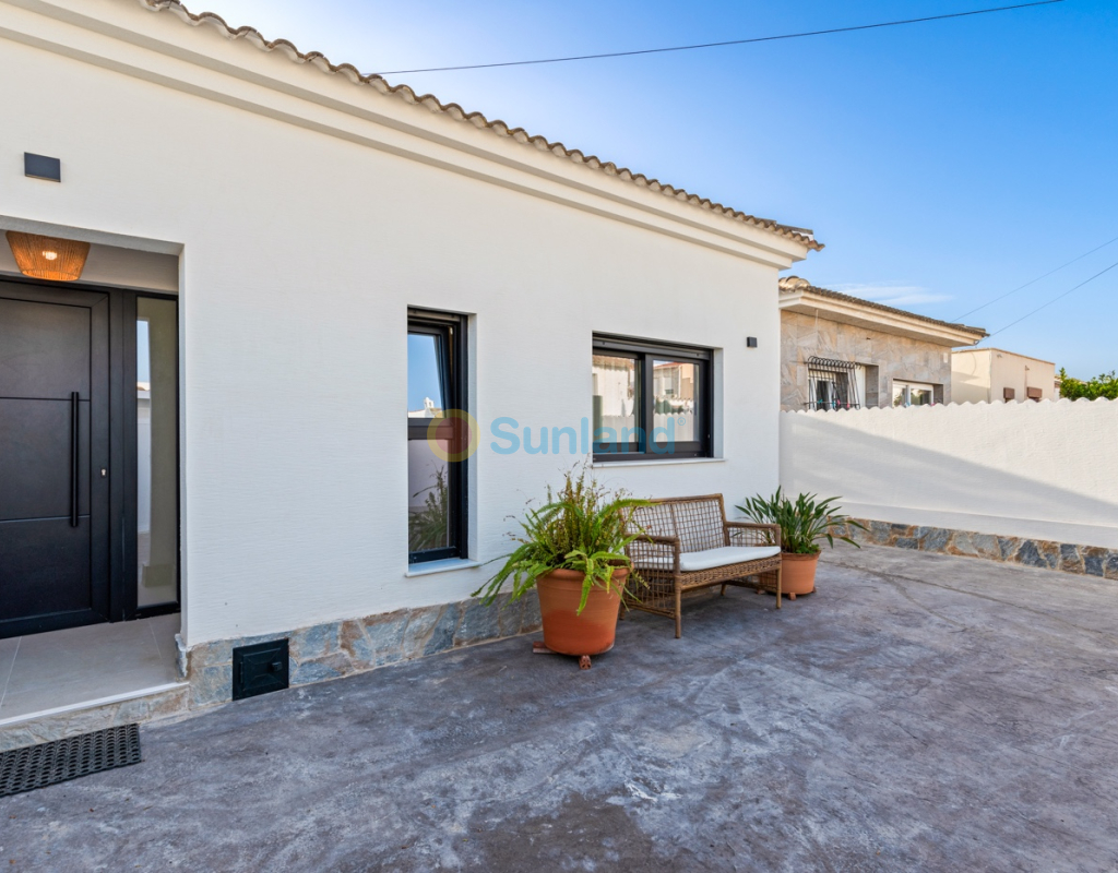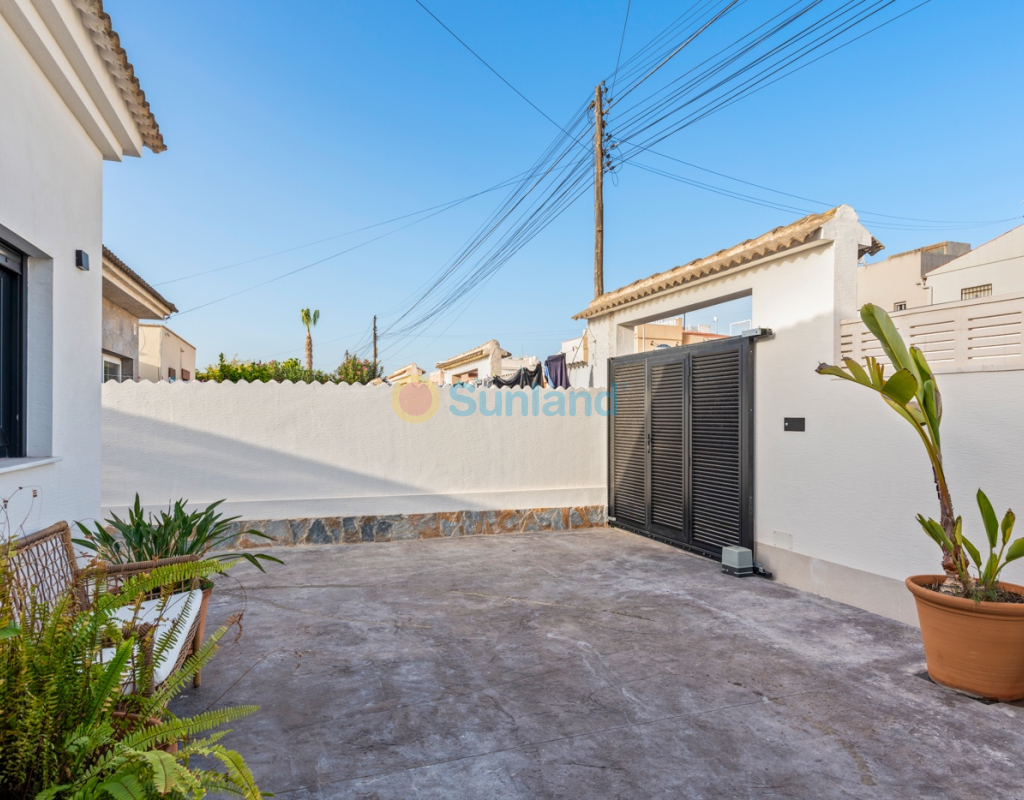 Velkommen til denne vakkert renoverte villaen i El Chaparral-området i Torrevieja. Med en perfekt kombinasjon av moderne komfort, høyteknologiske oppgraderinger og middelhavssjarm, er denne eiendommen ideell for avslappet livsstil på Costa Blanca. Villaens planløsning er nøye utformet for praktisk bruk og god flyt. Inngangen fører inn til en hall som forbinder rommene på høyre side med spisestuen og det åpne kjøkkenet. Det stilige kjøkkenet er fullt utstyrt og ligger rett ved en overbygd terrasse med takvifter – perfekt for måltider utendørs. Boligen har tre romslige soverom og to stilige, moderne bad med elektriske persienner for ekstra komfort. Stuen har også elektriske persienner som gir privatliv med et knappetrykk. Ute finner du et privat basseng i hjertet av en lettstelt hage, designet for å nyte villaens solrike sørvestvendte beliggenhet. En overbygd terrasse gir et behagelig sted for avslapning eller sosiale sammenkomster, og i tillegg finnes flere uteplasser og et separat bodrom. Villaen er fullspekket med moderne fasiliteter, inkludert kanalisert klimaanlegg, solcellepaneler som leverer både strøm og varmtvann, samt gulvvarme på badene. For ekstra trygghet har eiendommen et overvåkningssystem med sikkerhetskameraer. Fullt møblert og klar til innflytting, har hjemmet innebygde garderober og takvifter. Enten du søker et fredelig familiehjem eller et stilfullt feriehus, har denne eiendommen alt. Beliggende i et rolig, men lett tilgjengelig område, har du enkel tilgang til alt Torrevieja og Costa Blanca har å by på.