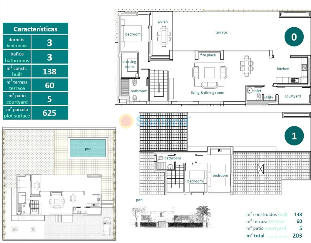 Elegante frittliggende villaer med privat basseng i Peraleja Golf Resort - Costa Cálida Frittliggende hus i middelhavsstil i et lukket golfsamfunn 20 frittliggende villaer med 6 modeller å velge mellom, med 2, 3 eller 4 soverom og 1, 2 eller 3 etasjer på tomter fra 375 til 800 m2. Noen enheter har solterrasse på taket. Ligger i det prestisjetunge Peraleja Golf Resort, i Murcia-regionen i Sør-Spania. Disse moderne middelhavshusene ligger på store tomter, hver med privat basseng, hage og parkering. Designet med skråtak og naturlige materialer som tre og stein, passer disse husene perfekt inn i det omkringliggende landskapet, samtidig som de tilbyr elegante og tidløse interiører. Komfortabel livsstil med førsteklasses finish Hvert hus har: Fullt utstyrt kjøkken med hvitevarer Lys stue/spisestue med koselig peis Sentral klimaanlegg og gassradiatorer Pansret inngangsdør og motorisert port for kjøretøy Privat svømmebasseng (3,5 x 5,5 m) med utendørs dusj Utendørs vannkraner og belysning Fullt anlagt hage klar til bruk Disse eiendommene er nøye designet av en anerkjent arkitekt, som har kombinert elegante linjer med naturlige teksturer for å skape et unikt og harmonisk miljø i et lukket og sikkert boligområde. Livet på Peraleja Golf Resort – natur og sikkerhet Husene ligger i Peraleja Golf Resort, som har 24-timers sikkerhetsport, pianobar og klubbhus med gourmetrestaurant. Anlegget er omgitt av verneverdige naturområder hvor det er under utvikling turstier, jogging- og sykkelstier for beboerne. Den 18-hulls golfbanen, opprinnelig designet av den legendariske Severiano Ballesteros, er under renovering og skal gjenåpnes i slutten av 2025. Noen av boligene og klubbhuset har utsikt over havet i det fjerne. Praktisk beliggenhet nær strender og byer Dette rolige anlegget har utmerket tilgang til viktige steder: Byene Sucina og Avileses – 3–5 km Strendene ved Mar Menor – 20 km (20 minutter med bil) Murcia – 25 km (20 minutter med bil) Murcia lufthavn (RMU) – 25 km (15 minutter med bil) Alicante lufthavn (ALC) – 80 km (45 minutter med bil) La Zenia Boulevard kjøpesenter – 35 km Nyt sjarmen ved Costa Cálida Beliggende nær den tradisjonelle spanske byen Sucina, kan beboerne nyte lokale butikker, restauranter og autentisk sjarm, samtidig som de er nær kysten og det pulserende bylivet. Dette området har blitt stadig mer populært blant internasjonale kjøpere på grunn av livskvaliteten, den gode infrastrukturen, det fantastiske klimaet hele året og tilgangen til natur og sjø. Kontakt oss i dag for å få drømmevillaen din i Peraleja Golf og begynn å nyte livet på Costa Cálida.