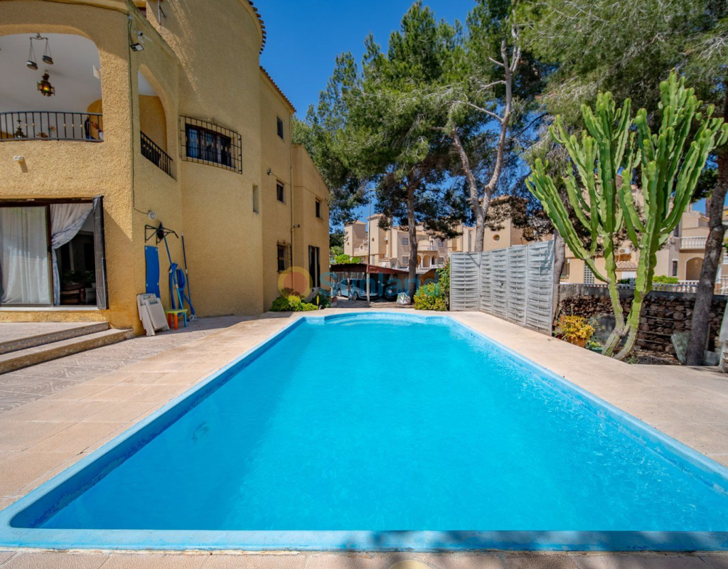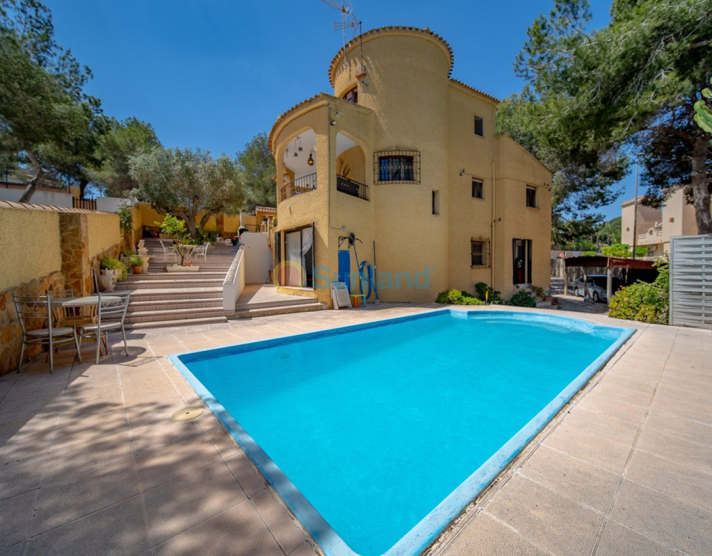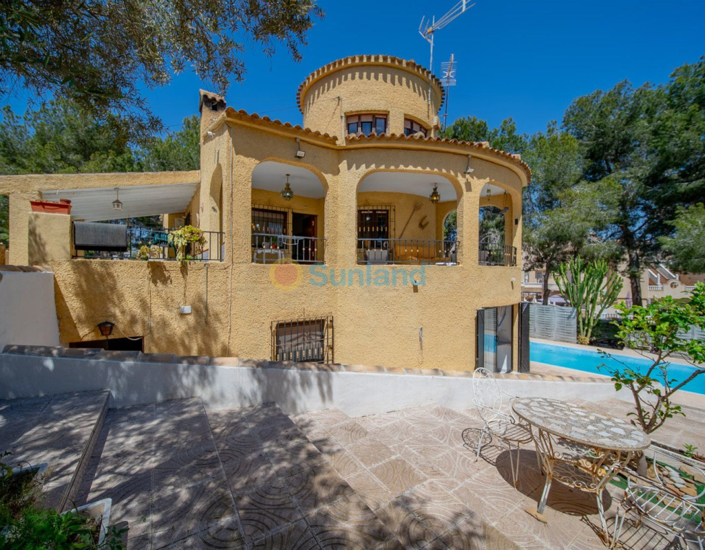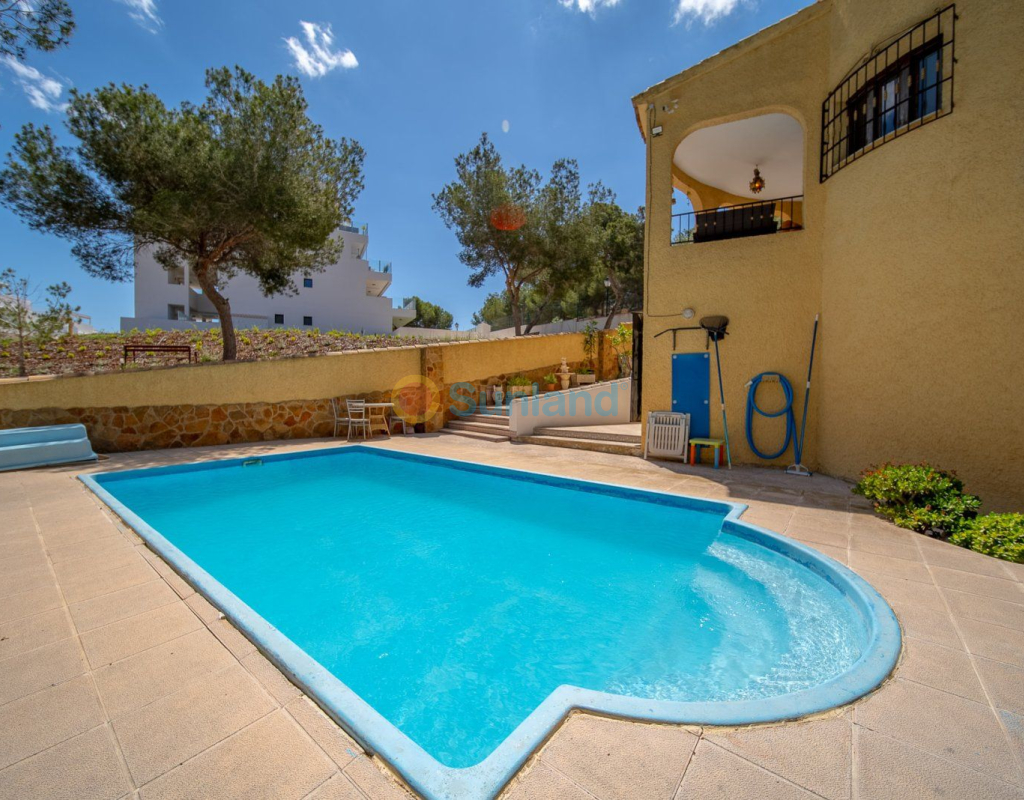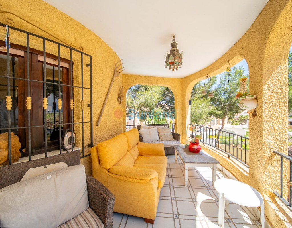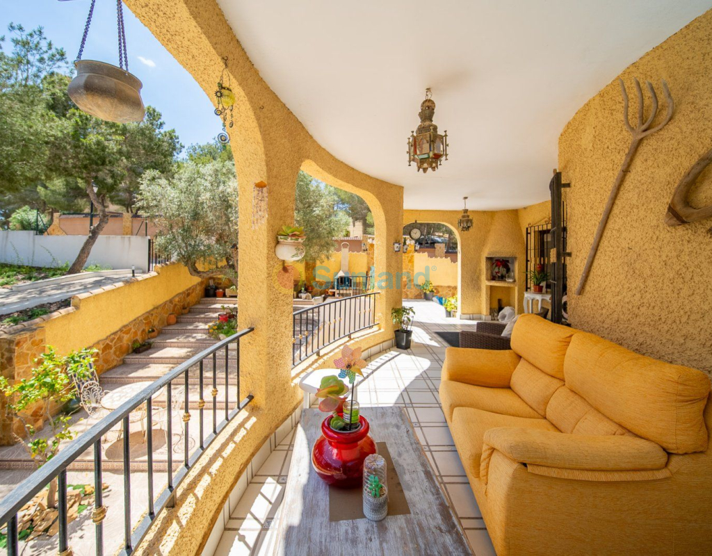Mediterransk villa på tomt på 800 m² – Las Filipinas, Orihuela Costa. Romslig villa i tradisjonell stil beliggende i et rolig boligområde, nær golfbanene Campoamor og Villamartín. Stor tomt, privat basseng og plass til hele familien. Kvaliteter: • Tomt på 800 m² • 250 m² bygget • 6 soverom • 3 bad + 1 toalett • Kjøkken med spisestue • Stue med peis • Klimaanlegg • Bod • Privat svømmebasseng • Fullt møblert • Sørvendt • Byggeår: 1980
