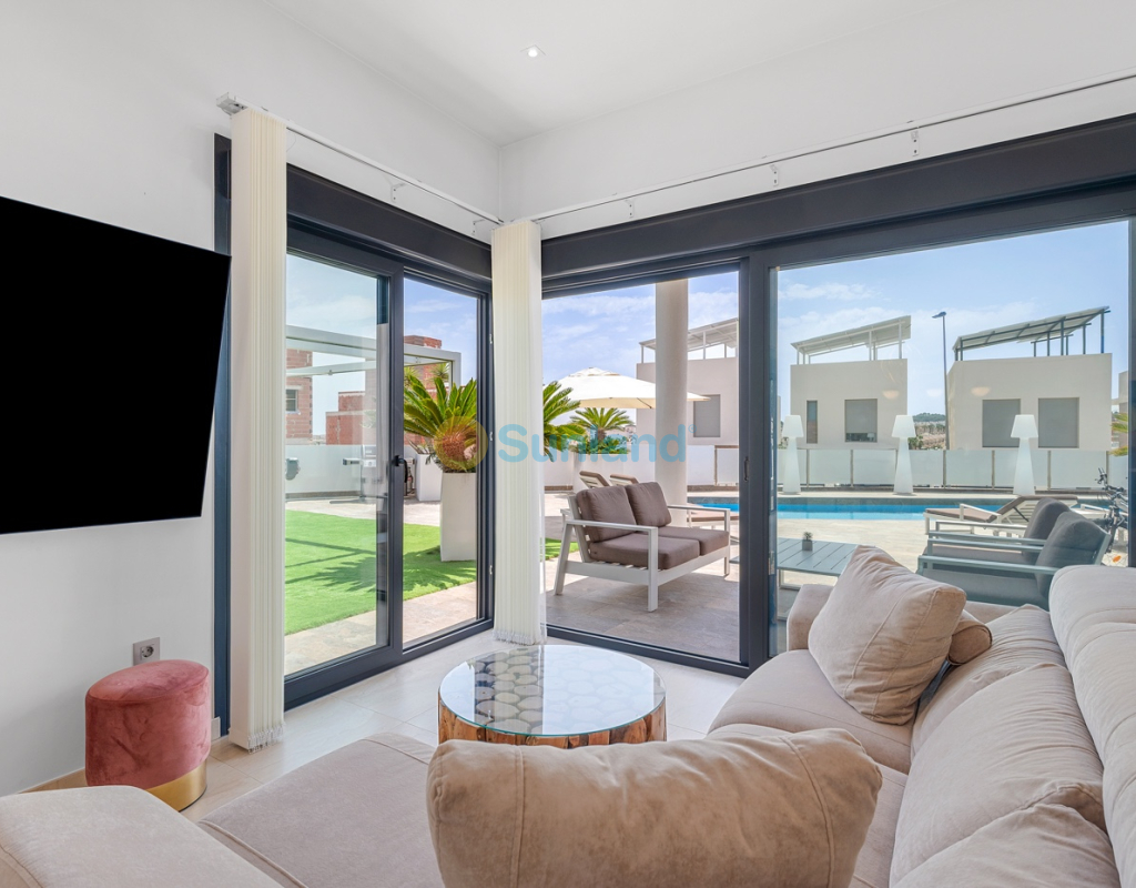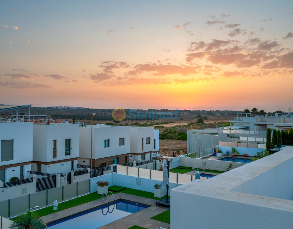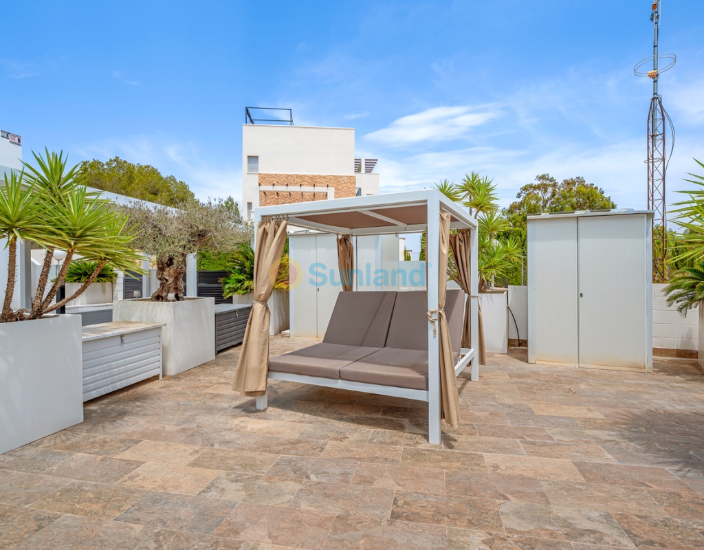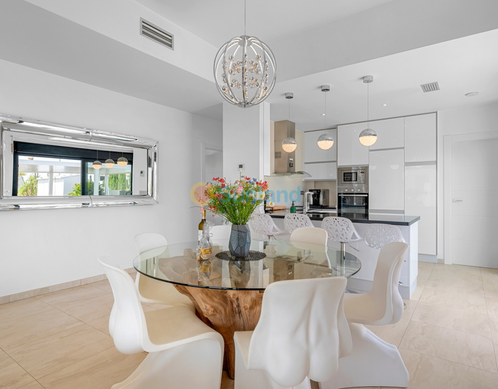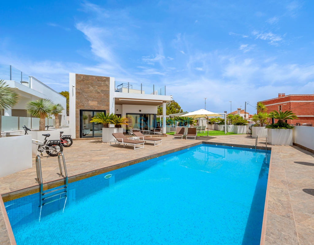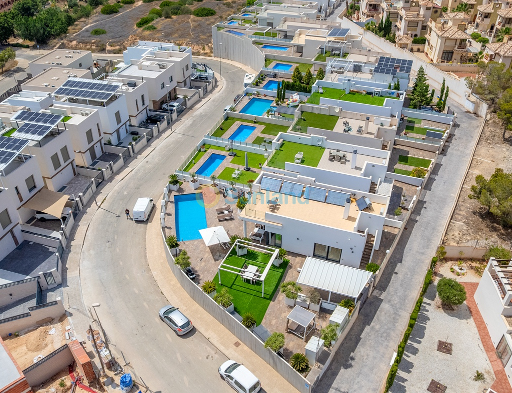 Denne moderne eneboligen fra 2018 ligger i Villamartín, Orihuela Costa. Den har et boareal på 113 m² og står på en romslig tomt på 464 m². Boligen har moderne design og en funksjonell planløsning, perfekt for å nyte den avslappede middelhavslivsstilen. Den sørvendte orienteringen gir naturlig lys hele dagen og skaper en varm og behagelig atmosfære. Villaen har tre romslige soverom med innebygde garderober og to komplette bad, hvorav ett er en suite til hovedsoverommet. Det åpne kjøkkenet er sømløst integrert med spise- og stueområdet, som har direkte utgang til terrassen og det private bassenget. I tillegg er det et separat vaskerom. Uteområdet har privat basseng, lettstelt hage, overbygd terrasse for måltider ute, og en pergola med kunstgress. Det finnes også en stor takterrasse for avslapning og privat parkering på tomten med overbygd carport. Ekstrautstyr inkluderer sentral aircondition, solcellepaneler, kvalitetsmaterialer og gjennomtenkt planløsning. Boligen ligger i et rolig boligområde med kort vei til golfbaner, Zenia Boulevard og flotte strender. Et perfekt valg både som helårsbolig og investering i et av Costa Blancas mest ettertraktede områder.