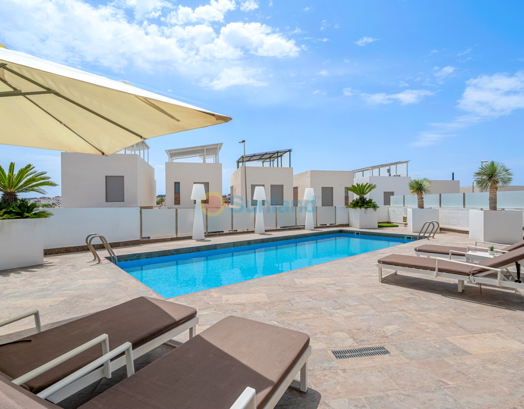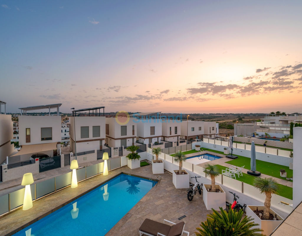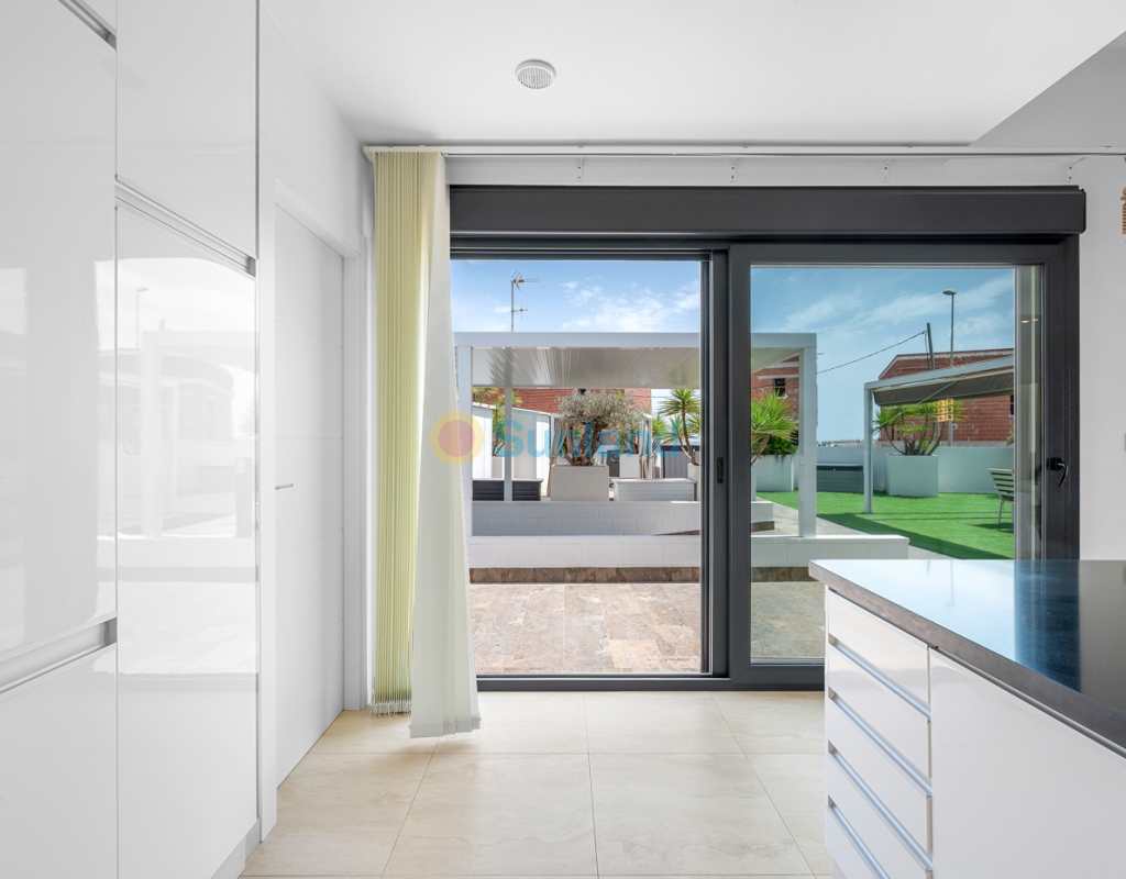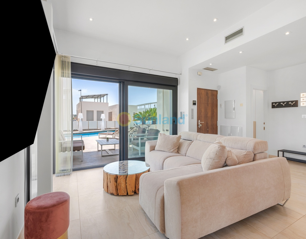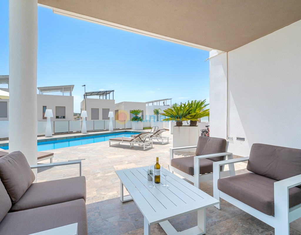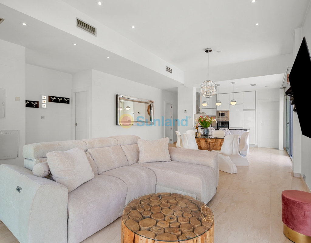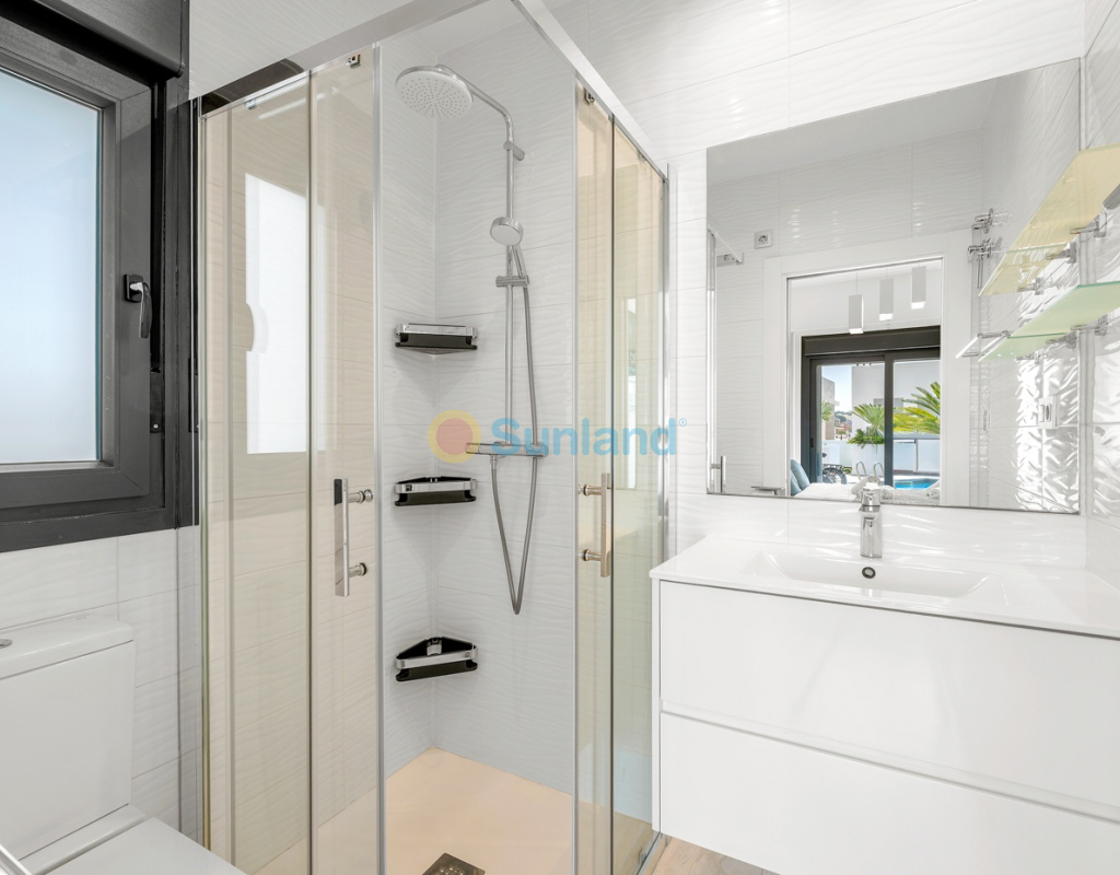 Denne moderne eneboligen fra 2018 ligger i Villamartín, Orihuela Costa. Den har et boareal på 113 m² og står på en romslig tomt på 464 m². Boligen har moderne design og en funksjonell planløsning, perfekt for å nyte den avslappede middelhavslivsstilen. Den sørvendte orienteringen gir naturlig lys hele dagen og skaper en varm og behagelig atmosfære. Villaen har tre romslige soverom med innebygde garderober og to komplette bad, hvorav ett er en suite til hovedsoverommet. Det åpne kjøkkenet er sømløst integrert med spise- og stueområdet, som har direkte utgang til terrassen og det private bassenget. I tillegg er det et separat vaskerom. Uteområdet har privat basseng, lettstelt hage, overbygd terrasse for måltider ute, og en pergola med kunstgress. Det finnes også en stor takterrasse for avslapning og privat parkering på tomten med overbygd carport. Ekstrautstyr inkluderer sentral aircondition, solcellepaneler, kvalitetsmaterialer og gjennomtenkt planløsning. Boligen ligger i et rolig boligområde med kort vei til golfbaner, Zenia Boulevard og flotte strender. Et perfekt valg både som helårsbolig og investering i et av Costa Blancas mest ettertraktede områder.