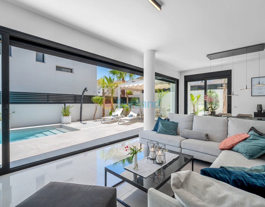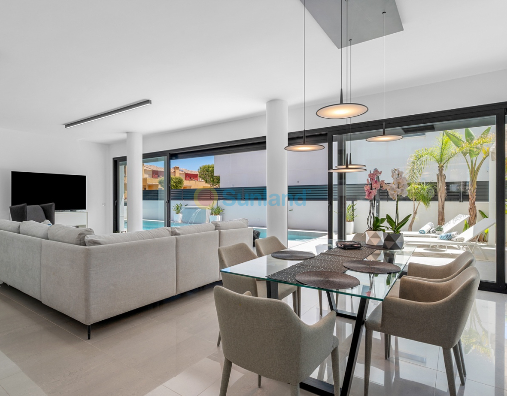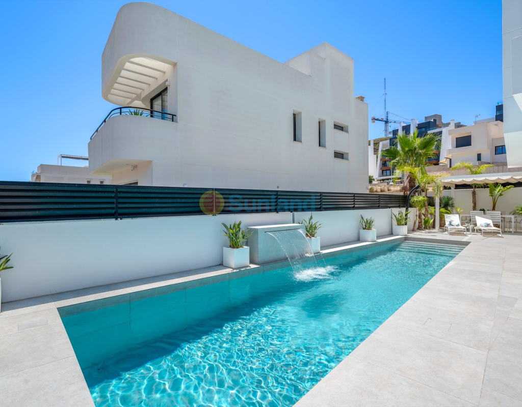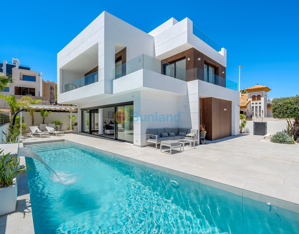 Denne moderne villaen, bygget i 2019 og plassert på en tomt på 347m², tilbyr en gjennomtenkt kombinasjon av funksjonalitet og moderne arkitektur. Boligen er på 194m² fordelt over tre etasjer, og inneholder fire romslige soverom og tre bad, med en planløsning som gir både komfort og privatliv. Det åpne kjøkkenet flyter sømløst inn i stue og spisestue, med store skyvedører i glass som gir direkte tilgang til hage og terrasse og slipper inn rikelig med naturlig lys. Hovedinngangen ligger på nordsiden av eiendommen, mens hage og bassengområdet vender mot sør. Den private svømmebassenget på 36m² er et naturlig samlingspunkt utendørs, omgitt av moderne landskap og ulike sittegrupper. En pergola gir skygge til måltider ute, og den overbygde terrassen utvider oppholdsrommet. På taket finner du et solarium med åpen utsikt og delvis havutsikt – perfekt for avslapning. I andre etasje finner man hovedsoverommet med walk-in-garderobe og tilgang til privat balkong. To andre soverom med innebygde garderober fullfører etasjen, mens et fjerde soverom i første etasje gir fleksible bruksmuligheter. I tillegg finnes vaskerom, bod og privat parkering på tomten. Dette er et moderne hjem med gjennomgående gode kvaliteter og nærhet til sjøen.