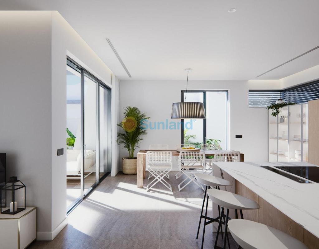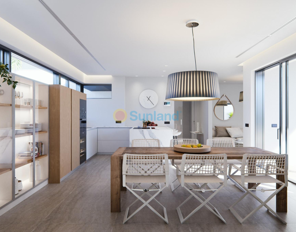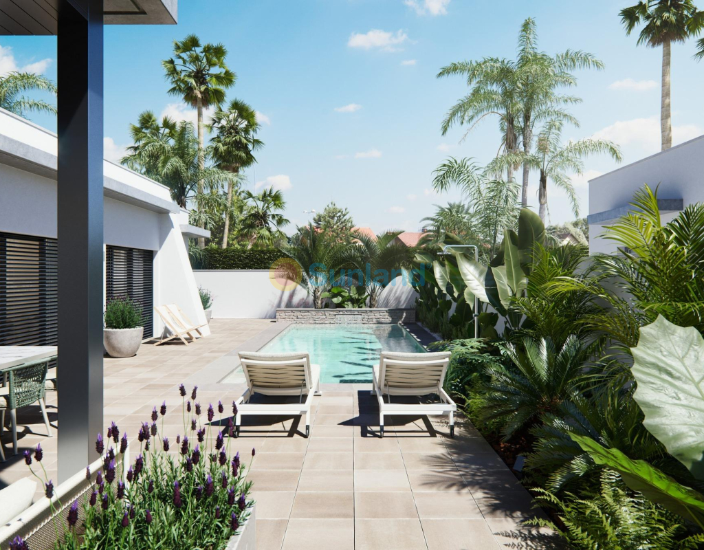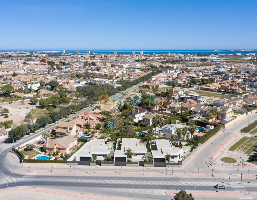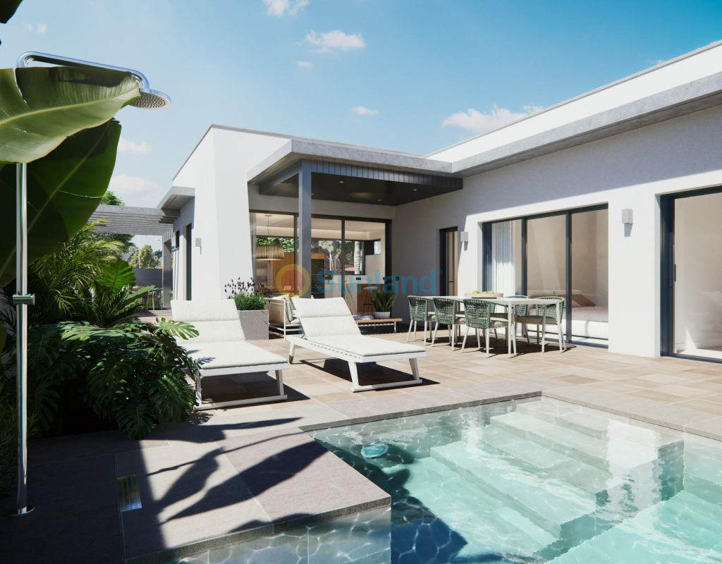 NY BYGGET VILLA PÅ EN GULV Tre eksklusive villaer i et boligområde i San Javier med 600 m2 tomt og 217 m2 bygget areal i en etasje, privat basseng og store hageområder. Bolig med arkitektonisk utforming basert på klare, kubiske og funksjonelle linjer i en eksklusiv boligklave i San Javier (Murcia). Automatiserte tilgangsdører til hage og garasje med infrarød fjernkontroll. Stor overbygd garasje for to kjøretøy med egen inngang. Hager med et vanndreneringssystem på gulvet, fullstendig ferdig og tilpasses, inkludert vegetasjon, vanning og belysning.