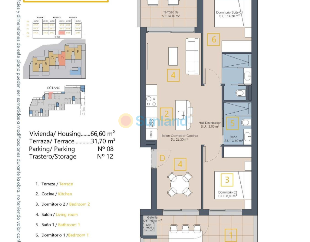 Nybygget boligkompleks i Los Alcázares ved Serena Golf Eksklusivt boende på Costa Cálida Oppdag dette nye boligprosjektet i Los Alcázares, med perfekt beliggenhet ved Serena Golf og bare 1,3 km fra strendene ved Mar Menor. Dette prosjektet ligger i hjertet av Costa Cálida og kombinerer moderne arkitektur, komfort og enestående omgivelser. Med utmerkede veiforbindelser ligger komplekset bare 30 km fra Murcia lufthavn (25 minutter) og 90 km fra Alicante lufthavn (55 minutter), og tilbyr enkel tilgang til Cartagena, Murcia og Costa Blanca. Moderne boliger med eksepsjonell design Boligkomplekset består av 18 elegante leiligheter og 7 eksklusive villaer, hver designet for å maksimere plass, lys og funksjonalitet. Beboerne vil nyte en fantastisk utsikt over golfbanen og, fra de øverste etasjene, det glitrende vannet i Mar Menor. Velg mellom: Leiligheter med 2 eller 3 soverom og 2 bad, alle med dobbel orientering og to terrasser for sol hele dagen. Leiligheter i første etasje med private hager. Leiligheter i midtre etasje med store terrasser. Penthouse-leiligheter med to terrasser, privat solarium og panoramautsikt. Frittliggende villaer ved golfbanen, med 3 soverom, 2 bad, kjeller, solarium og privat basseng. Premium-funksjoner og fasiliteter Alle boliger er utstyrt med høykvalitets finish og moderne bekvemmeligheter, inkludert: Parkeringsplass og bod Aerotermisk varmtvannssystem Forhåndsinstallert klimaanlegg Elektriske persienner og komplett belysningspakke Fullt utstyrte bad med møbler og dusjvegger Felles svømmebasseng og anlagte hager Heis i leilighetsblokkene Perfekt beliggenhet for golf- og strandelskere Beliggende i en privilegert enklave, er utviklingen omgitt av det fredelige grøntområdet Serena Golf og ligger bare en kort spasertur fra det varme, grunne vannet i Mar Menor. Dette unike området tilbyr muligheter for svømming, seiling, paddleboarding og andre vannsportaktiviteter hele året, noe som gjør det ideelt for både avslapning og aktivitet. Viktige avstander: Strand (Mar Menor): 1,3 km Serena Golf: Ved siden av komplekset Los Alcázares sentrum: 2 km Cartagena: 22 km Murcia by: 40 km Murcia flyplass: 30 km (25 minutter) Alicante lufthavn: 90 km (55 minutter) Sikre deg en middelhavsstil Dette boligprosjektet i Los Alcázares tilbyr den perfekte kombinasjonen av strand, golf og moderne livsstil. Enten det er som permanent bolig, feriebolig eller investering, tilbyr det alt du trenger for en autentisk middelhavsstil. Kontakt oss i dag for å avtale en visning og sikre deg ditt nye hjem på Costa Cálida.