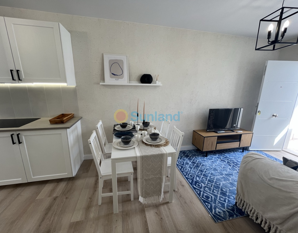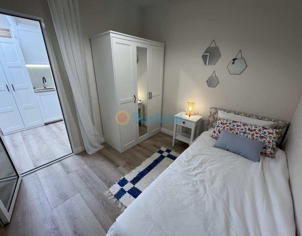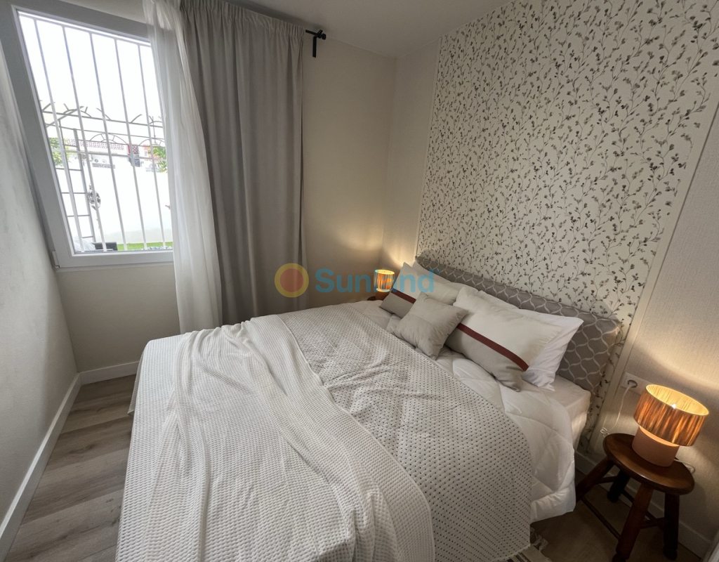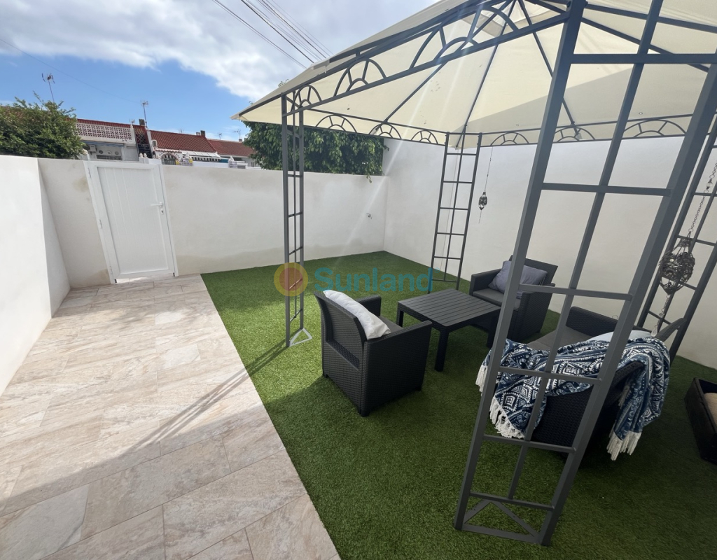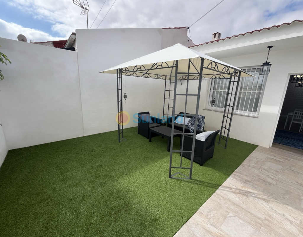 Renovert rekkehus på ett plan med privat uteplass i Torretas III, Torrevieja. Renovert rekkehus på ett plan med privat uteplass på 33 m². Boligen har 43 m², 2 soverom, 1 bad, åpen kjøkkenløsning og stue med direkte utgang til uteplassen. Selges møblert og utstyrt – innflyttingsklar. Inkluderer aircondition og felles parkering. Kvaliteter: 2 soverom 1 bad 43 m² Privat uteplass på 33 m² Åpen kjøkkenløsning Aircondition Østvendt Møblert Felles parkering Alt på ett plan IBI: 180 €/år Beliggenhet: 50 m til barer og restauranter 100 m til saltsjøen i Torrevieja 450 m til skole 1 km til IES Torrevigía videregående skole 1,5 km til Habaneras kjøpesenter, Carrefour og Ozone fritidsområde