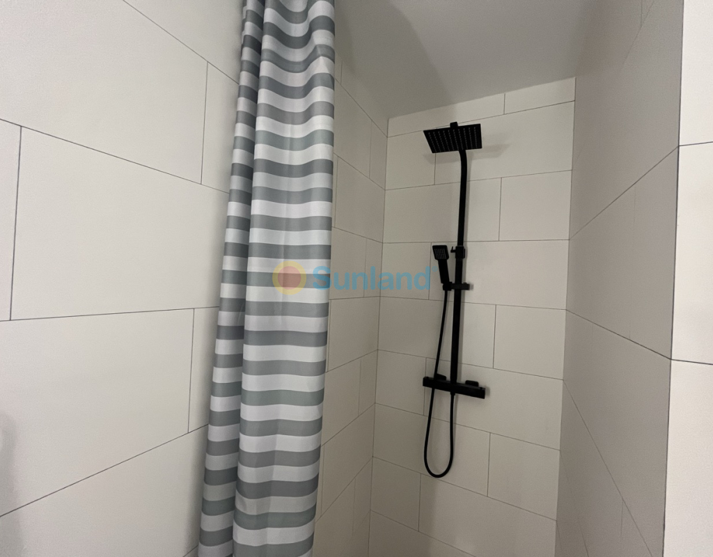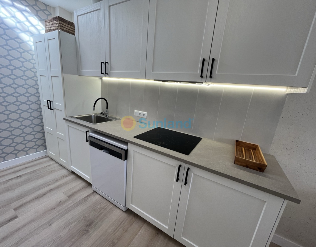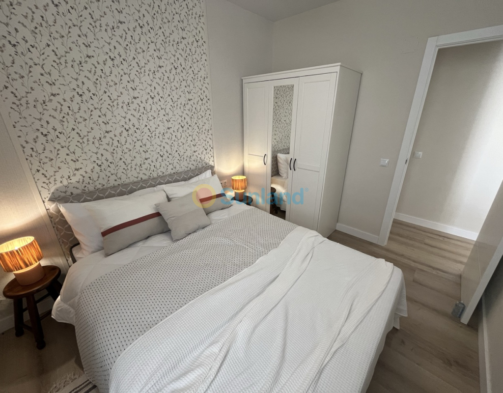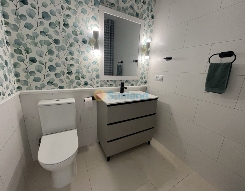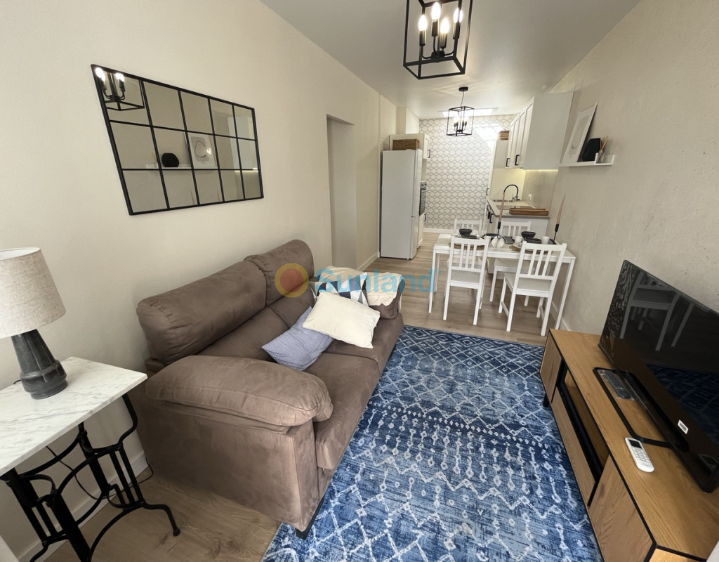 Renovert rekkehus på ett plan med privat uteplass i Torretas III, Torrevieja. Renovert rekkehus på ett plan med privat uteplass på 33 m². Boligen har 43 m², 2 soverom, 1 bad, åpen kjøkkenløsning og stue med direkte utgang til uteplassen. Selges møblert og utstyrt – innflyttingsklar. Inkluderer aircondition og felles parkering. Kvaliteter: 2 soverom 1 bad 43 m² Privat uteplass på 33 m² Åpen kjøkkenløsning Aircondition Østvendt Møblert Felles parkering Alt på ett plan IBI: 180 €/år Beliggenhet: 50 m til barer og restauranter 100 m til saltsjøen i Torrevieja 450 m til skole 1 km til IES Torrevigía videregående skole 1,5 km til Habaneras kjøpesenter, Carrefour og Ozone fritidsområde