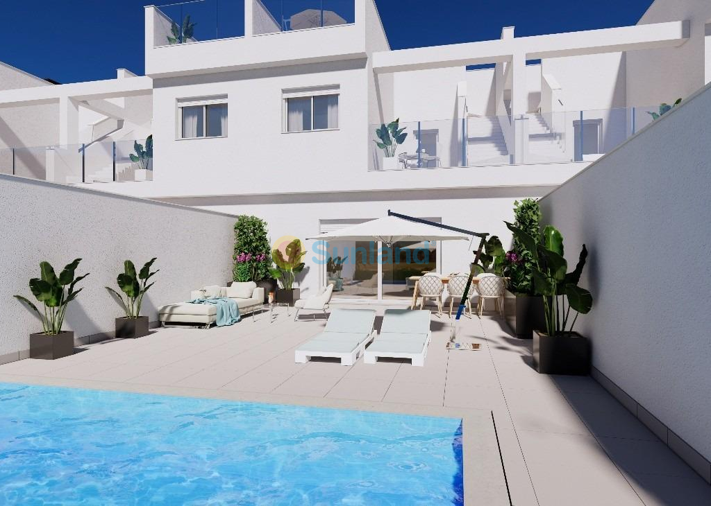Nybyggede rekkehus ved La Serena Golf i Los Alcázares Førsteklasses beliggenhet ved golfbanen og havet Oppdag et eksklusivt boligprosjekt med 31 nybyggede rekkehus ved La Serena Golf i Los Alcázares, bare 600 meter fra Mar Menor. Dette privilegerte området ligger i hjertet av Costa Cálida og kombinerer golf, strand og middelhavsliv. Med alle fasiliteter i nærheten og utmerket veiforbindelse er dette det ideelle stedet både for ferie og helårsbeboelse. Moderne boliger med privat basseng og solarium på taket Hver bolig har et stilig, moderne design og lyse innvendige rom. Boligene er fordelt på tre etasjer pluss solarium på taket, og tilbyr maksimal komfort og privatliv: Kjeller med privat garasje for 2 biler og tilgang til en uteplass Første etasje med åpen stue og kjøkken som fører til en hage og privat basseng, 1 soverom og 1 bad Andre etasje med 2 soverom, 1 bad og 2 terrasser Solarium på taket med sommerkjøkken, ideelt for å slappe av og nyte panoramautsikten Øst- og vestvendt beliggenhet sikrer utmerket naturlig lys og utendørs liv hele dagen. Høy kvalitet og komfort Disse husene er bygget etter de høyeste standarder og tilbyr førsteklasses funksjoner, inkludert: Privat svømmebasseng Kjellergarasje for 2 biler med motorisert port Aerotermisk varmtvannssystem Fullt installert klimaanlegg Møblert og utstyrt kjøkken Fullt utstyrte bad med møbler, speil og dusjvegger Sikkerhetsdør Bo mellom havet og golfbanen Dette eksklusive boligområdet ligger i frodige middelhavslandskap og tilbyr fredelig boende ved siden av Serena Golf-banen, en kjent 18-hulls bane omgitt av natur og rolige innsjøer. Det varme, grunne vannet i Mar Menor er perfekt for svømming og vannsport som seiling, paddle surfing og kajakkpadling hele året. Viktige avstander: Strand (Mar Menor): 600 m La Serena Golf: ved siden av komplekset Los Alcázares sentrum: 2 km Cartagena: 22 km Murcia by: 40 km Murcia flyplass: 30 km Alicante flyplass: 90 km Sikre deg en middelhavsstil Enten du er på utkikk etter en permanent bolig, et feriehus eller en lønnsom investering, tilbyr disse husene luksus, bekvemmelighet og en førsteklasses kystlivsstil. Kontakt oss i dag for å avtale en visning og sikre deg ditt nye hjem i Los Alcázares.