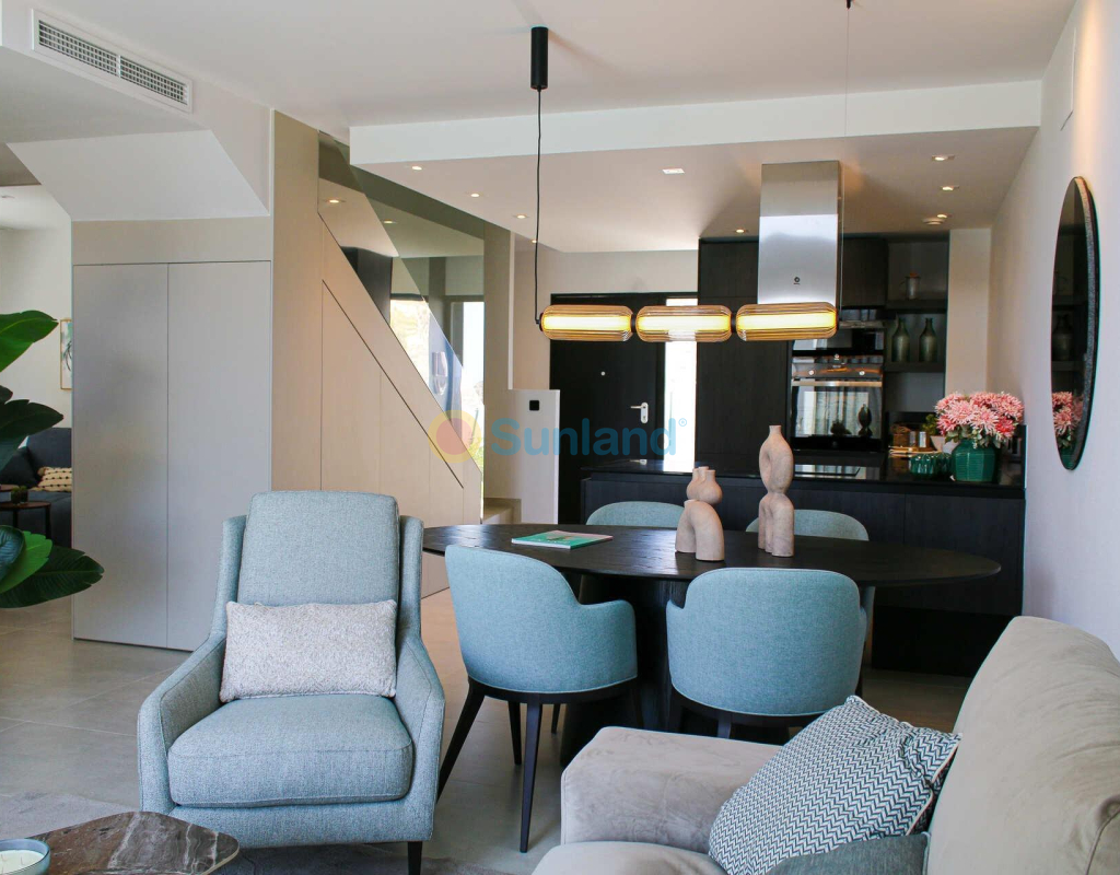 Nybyggede tomannsboliger med privat basseng i La Finca Golf Resort, Algorfa Eksklusivt middelhavsliv i La Finca Golf Oppdag dette eksepsjonelle nye boligprosjektet i det prestisjetunge La Finca Golf Resort i Algorfa, Costa Blanca Sør. Du kan velge mellom leiligheter med 2/3 soverom og felles svømmebasseng eller tomannsboliger eller eneboliger med private svømmebasseng. Omgitt av frodige fairways og naturlige landskap, tilbyr dette boligområdet en idyllisk livsstil i et fredelig og trygt miljø. Den sjarmerende byen Algorfa er kjent for sin tradisjonelle spanske karakter, utmerkede gastronomi og avslappede atmosfære, noe som gjør den til et ideelt reisemål både for ferieboliger og permanent opphold. Moderne tomannsboliger med privat basseng Disse vakkert designede tomannsboligene har 3 soverom og 2 bad, og kombinerer funksjonalitet, komfort og moderne stil. Detaljer om planløsning Første etasje Lys åpen stue og spisestue med tilknytning til et møblert kjøkken Store skyvedører med direkte tilgang til hagen og det private bassenget To romslige soverom med innebygde garderober Ett komplett bad Privat parkering på tomten Øverste etasje Studio med bad, ideelt for kontor, stue eller gjesterom Tilgang til en 30 m2 privat åpen terrasse, perfekt for soling og avslapning Høy kvalitet og finish Disse villaene er bygget etter høye standarder og tilbyr moderne komfort for helårsbruk, inkludert Innebygde garderober i alle soverom Elektriske persienner i stue og soverom Fullt utstyrte bad med speil og dusjvegger Fullt installert klimaanlegg Privat hage og basseng Førsteklasses beliggenhet nær strender, golf og tjenester La Finca Golf Resort er et av de mest kjente golfdestinasjonene på Costa Blanca, og tilbyr et bredt utvalg av tjenester som luksushotell, restauranter, spa og sportsfasiliteter. Anlegget har rask tilgang til nærliggende byer, strender og flyplasser, noe som gir bekvemmelighet og gode transportforbindelser. Avstander til viktige steder La Finca Golf Club: gangavstand Strendene i Guardamar del Segura: 15 km Torrevieja og Orihuela Costa: 15 km Almoradí, Benijófar og Ciudad Quesada: kort kjøretur Alicante lufthavn: 35 km Nyt det beste Costa Blanca har å tilby Med moderne design, private uteområder og en privilegert beliggenhet er disse villaene et utmerket valg for familier, investorer og golfentusiaster som ønsker en kvalitetslivsstil i Sør-Spania. Kontakt oss i dag for å avtale en visning eller få mer informasjon om dette eksklusive nybyggprosjektet i La Finca Golf Resort, Algorfa.