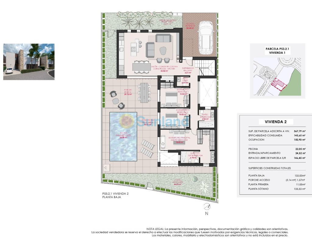 NYBYGDE VILLAER I PRIVAT INNGJERDET FERIESTED I PROVINSEN MURCIA Nybygde villaer i privat inngjerdet feriested i Murcia-regionen, omgitt av utmerkede golfbaner og bare 10 minutter fra sandstrendene i Mar Menor-havet. Villaer bygget over 2 etasjer og har 3 soverom, 2 bad og et gjestetoalett og er designet med en moderne stil og åpent konsept, bestående av et fullt utstyrt kjøkken og stue / spisestue, garderober, privat hage med basseng og parkeringsplass utenfor veien, privat solarium. Stor villa på 146 m² pluss en veldig nyttig kjeller på 120 m² ferdig med glatte vegger, vann og elektriske punkter. Dette gir den perfekte muligheten til å bruke som ekstra innkvartering, kontor, treningsstudio, kinorom, lekerom for barn.... Ligger i et privat inngjerdet feriested, med en hovedinngang og 24 timers sikkerhet. Anlegget er designet rundt et imponerende grøntområde på 126 000 m2. Det består av gang- og sykkelstier, idrettsanlegg, padle- og tennisbaner, en minigolfbane, hager, hundeparker, fritidsområder, klubbhus.... Også i det sentrale området er juvelen i feriestedet, en krystallklar kunstig innsjø på nesten 17.000m2 vannoverflate, omgitt av hvite sandstrender og palmer, og bringer et stykke Karibia til Murcia-regionen. Det er 2 øyer i innsjøen, en av dem har sin egen bar, det er også "strand Chiringuitos" spredt rundt innsjøen. Anlegget ligger strategisk plassert mindre enn 4 km fra stranden og byen Los Alcázares, hvor du kan utøve forskjellige vannsport, omgitt av flere golfbaner og byen Cartagena mindre enn 15 minutter med bil og 22 km fra Murcia flyplass, og har derfor et bredt kulturelt, gastronomisk og sportstilbud innen rekkevidde.
