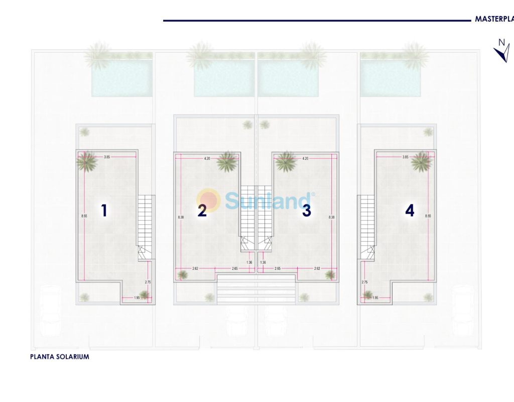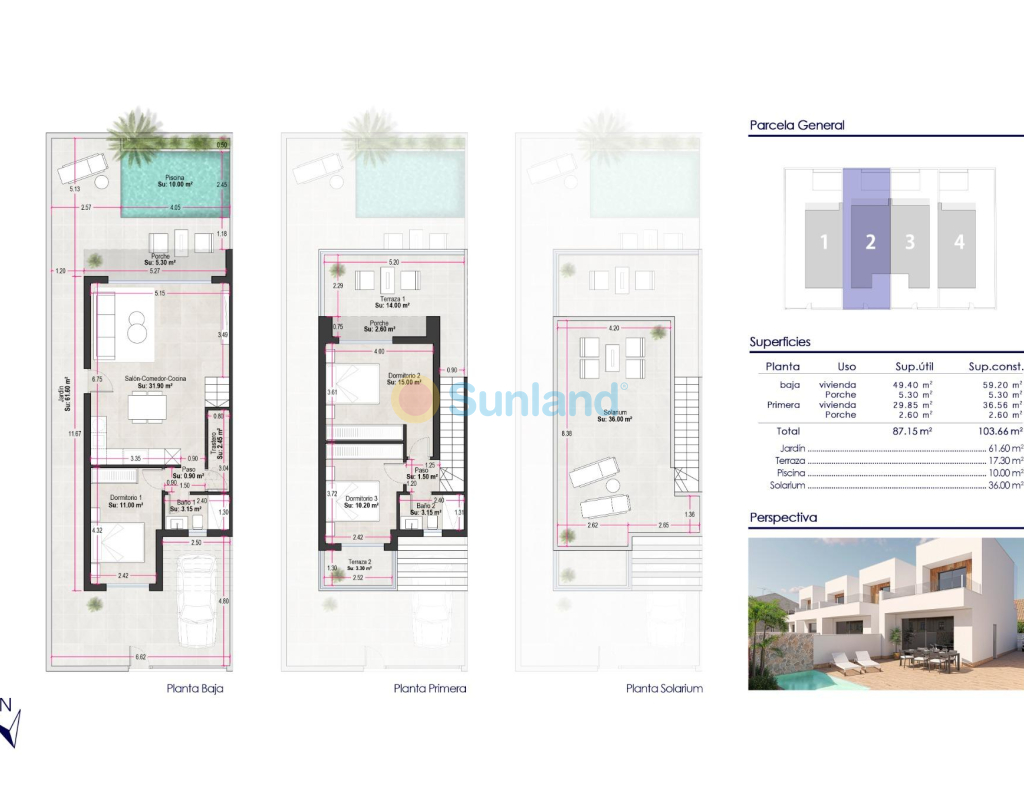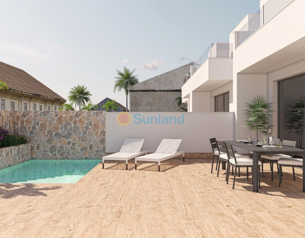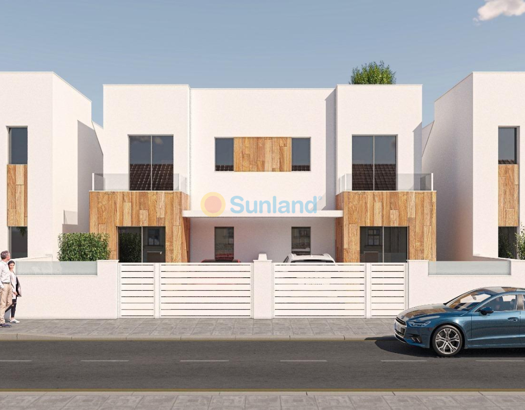 NEW BUILD SEMI-DETACHED VILLAS IN EL MOJON New Build modern semi-detached villas with private pool in El Mojon, Pilar de la Horadada. Modern villas has 3 bedrooms, 2 bathrooms, open plan kitchen with the lounge area, fitted wardrobes, private solarium, private garden with the pool and off road parking space. The development is located in El Mojon, only 400m from the sandy beach and surrounded by all services, sports facilities, near several Golf Courses and 5 minutes far from Mar Menor beaches.