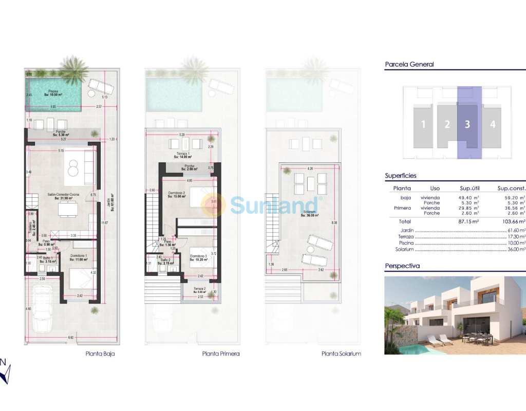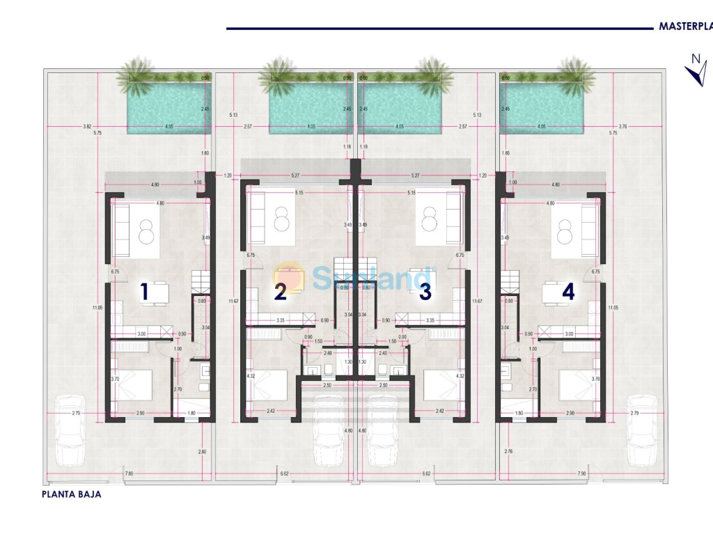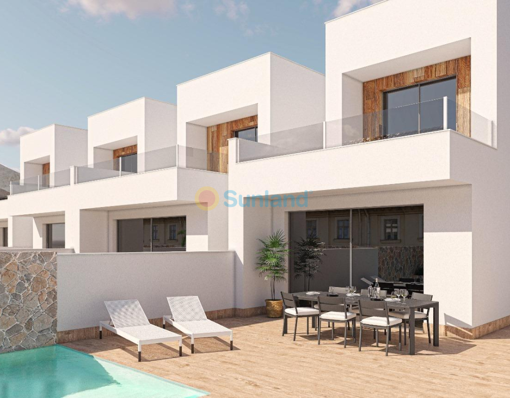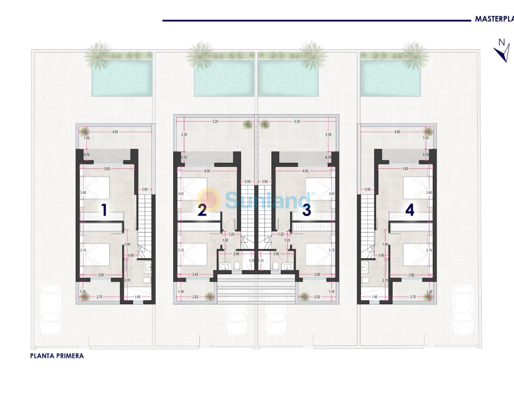 NEW BUILD SEMI-DETACHED VILLAS IN EL MOJON New Build modern semi-detached villas with private pool in El Mojon, Pilar de la Horadada. Modern villas has 3 bedrooms, 2 bathrooms, open plan kitchen with the lounge area, fitted wardrobes, private solarium, private garden with the pool and off road parking space. The development is located in El Mojon, only 400m from the sandy beach and surrounded by all services, sports facilities, near several Golf Courses and 5 minutes far from Mar Menor beaches.
