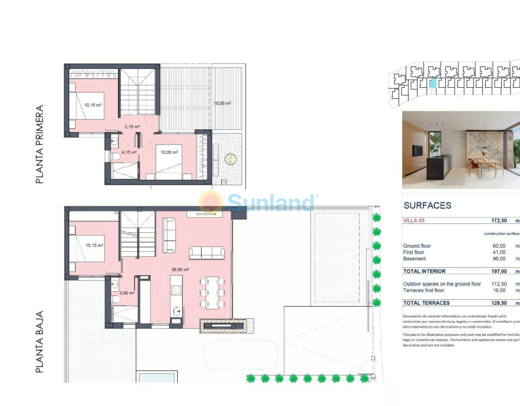 New Build Villas in Exclusive Gated Resort in Murcia, Near Mar Menor Beach Prime Location in the Heart of Murcia’s Scenic Coastline Discover luxurious new-build villas in a private gated resort within the Murcia region, known for its exceptional golf courses and proximity to the Mar Menor Sea. Situated just 10 minutes from beautiful sandy beaches, these villas offer a perfect mix of coastal relaxation and leisure opportunities. Located near Los Alcázares, a vibrant seaside town known for water sports and beachside dining, this resort provides easy access to Murcia Airport, just 22 km away, and the historic city of Cartagena, only 15 km from the resort. Spacious and Modern Villas with Premium Features Each villa is thoughtfully designed across three floors, providing ample space and a comfortable layout. With 2 or 3 bedrooms, 2 bathrooms, these homes are ideal for families and couples alike. The open-plan kitchen flows seamlessly into the dining and living areas, creating a bright, airy atmosphere. Key features include fitted wardrobes, a private basement, optional solarium, and a private garden with an optional swimming pool and parking space. Luxury Amenities and High-Quality Finishes Each villa is crafted with high-end materials and features: A spacious basement Indoor-outdoor porcelain flooring with anti-slip treatment outdoors Pre-installation of ducted air conditioning Aerothermal heat pump system for hot water and electric radiant floor heating in bathrooms Stylish kitchens with paneled cabinets and built-in appliances, including a ceramic hob, extractor hood, integrated oven, and microwave LED lighting package and standard home automation system for modern living Electric shutters in the bedrooms Resort-Style Living with Unmatched Recreational Facilities This exclusive gated resort is designed around a vast 126,000 m² green space, offering walking and cycling paths, sports facilities, paddle and tennis courts, a mini-golf course, dog parks, and leisure areas. At the heart of the resort is an impressive 17,000 m² crystal-clear lake with white sandy beaches, evoking a Caribbean ambiance in the heart of Murcia. Two islands within the lake feature a bar and beach chiringuitos for a relaxing retreat close to home. Close to Key Attractions and Points of Interest This strategic location offers easy access to nearby points of interest, including: Los Alcázares Beach: 4 km Murcia Airport: 22 km Cartagena: 15 km Surrounding golf courses for golf enthusiasts These new-build villas in Murcia are the ideal choice for those seeking luxury, privacy, and a blend of active and leisure-filled lifestyles, all within a resort that offers an unparalleled sense of community and tranquility.
